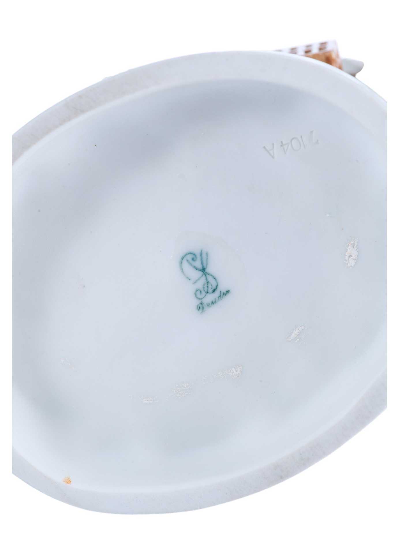 Фигурка была изготовлена на Саксонской фарфоровой фабрике Карла Тиме в Потшапеле, недалеко от Дрездена, — одном из значимых центров фарфорового производства Германии. Клеймо в виде зелёной подглазурной монограммы «PS» над словом «Dresden» позволяет с уверенностью отнести изделие к продукции данной фабрики начала XX века, приблизительно к периоду после 1901 года. Фабрика Карла Тиме славилась высококачественными декоративными фарфоровыми композициями в духе рококо и галантных сцен, вдохновлённых работами мейсенских мастеров.