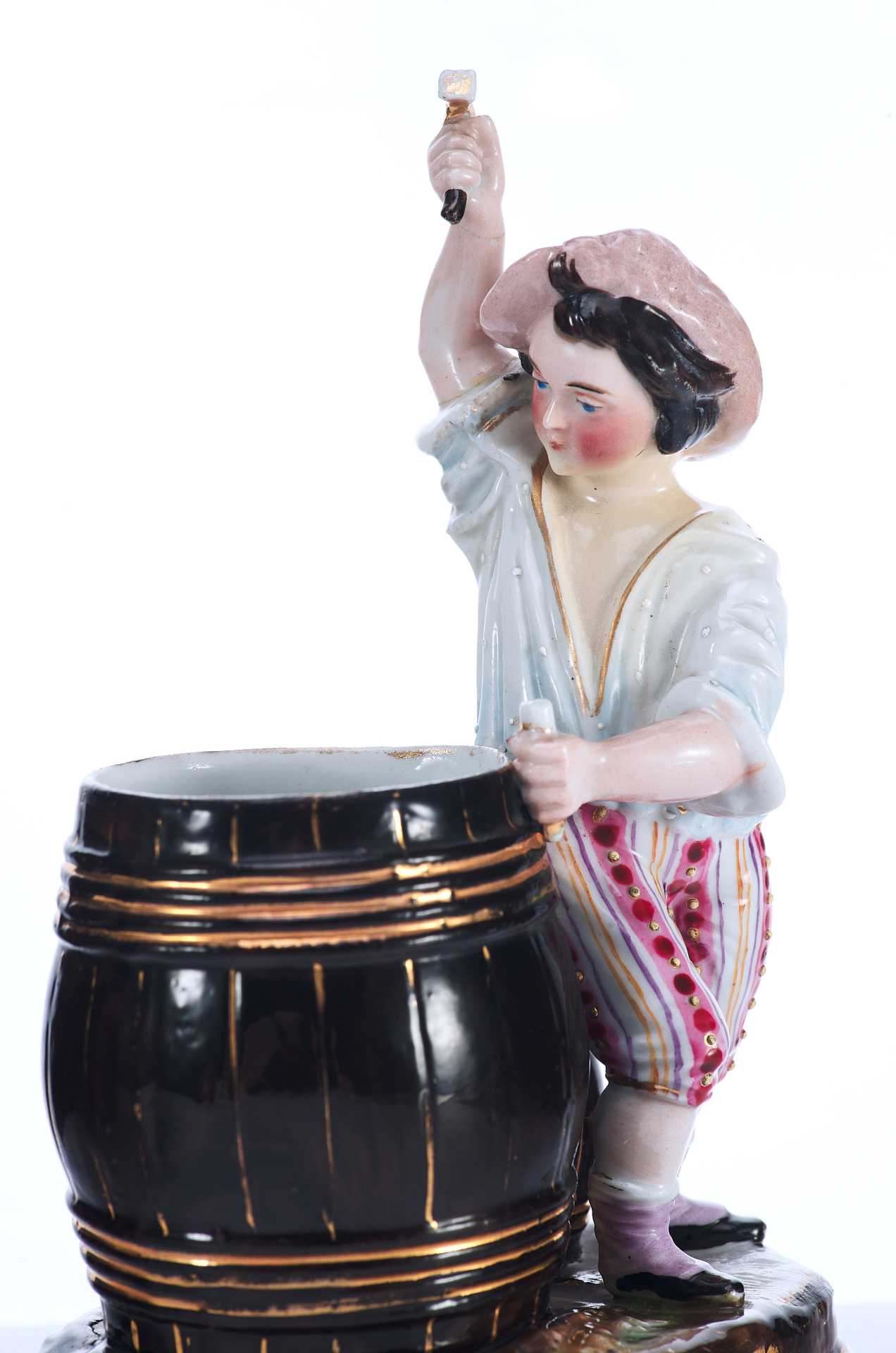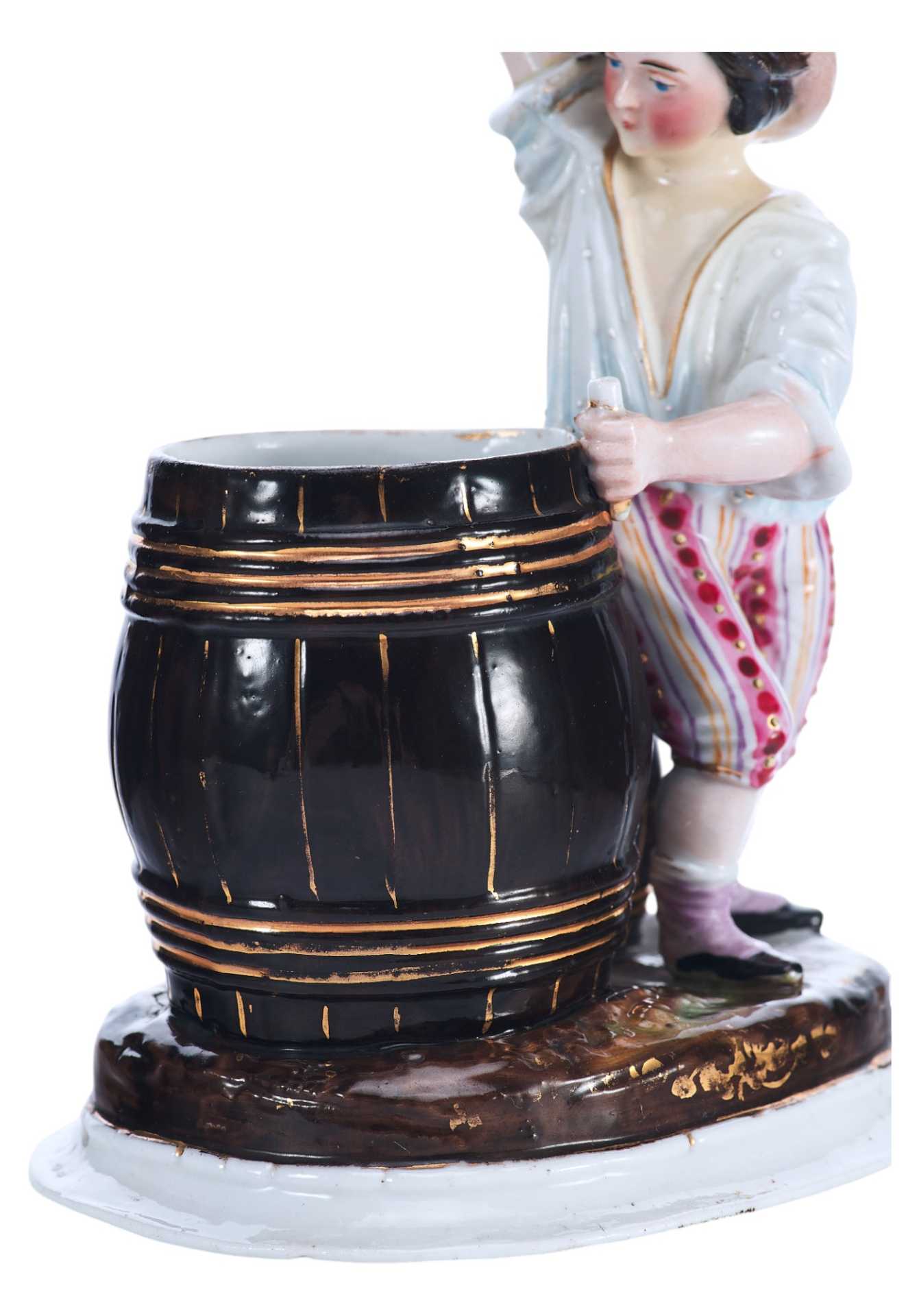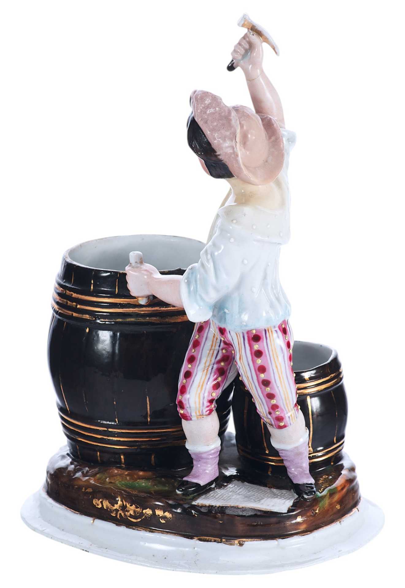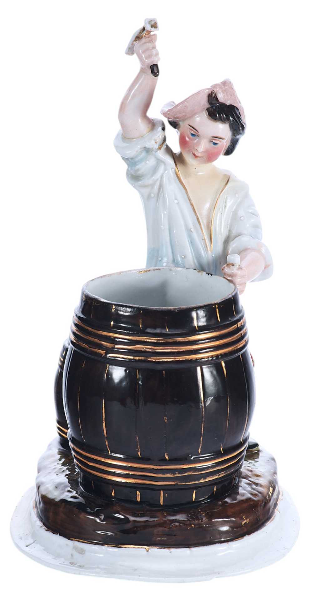 Карандашница в виде скульптурной композиции: бочар, забивающий обручи на бочку.