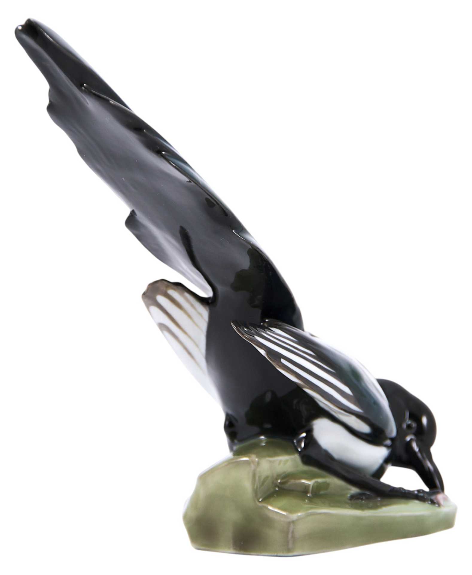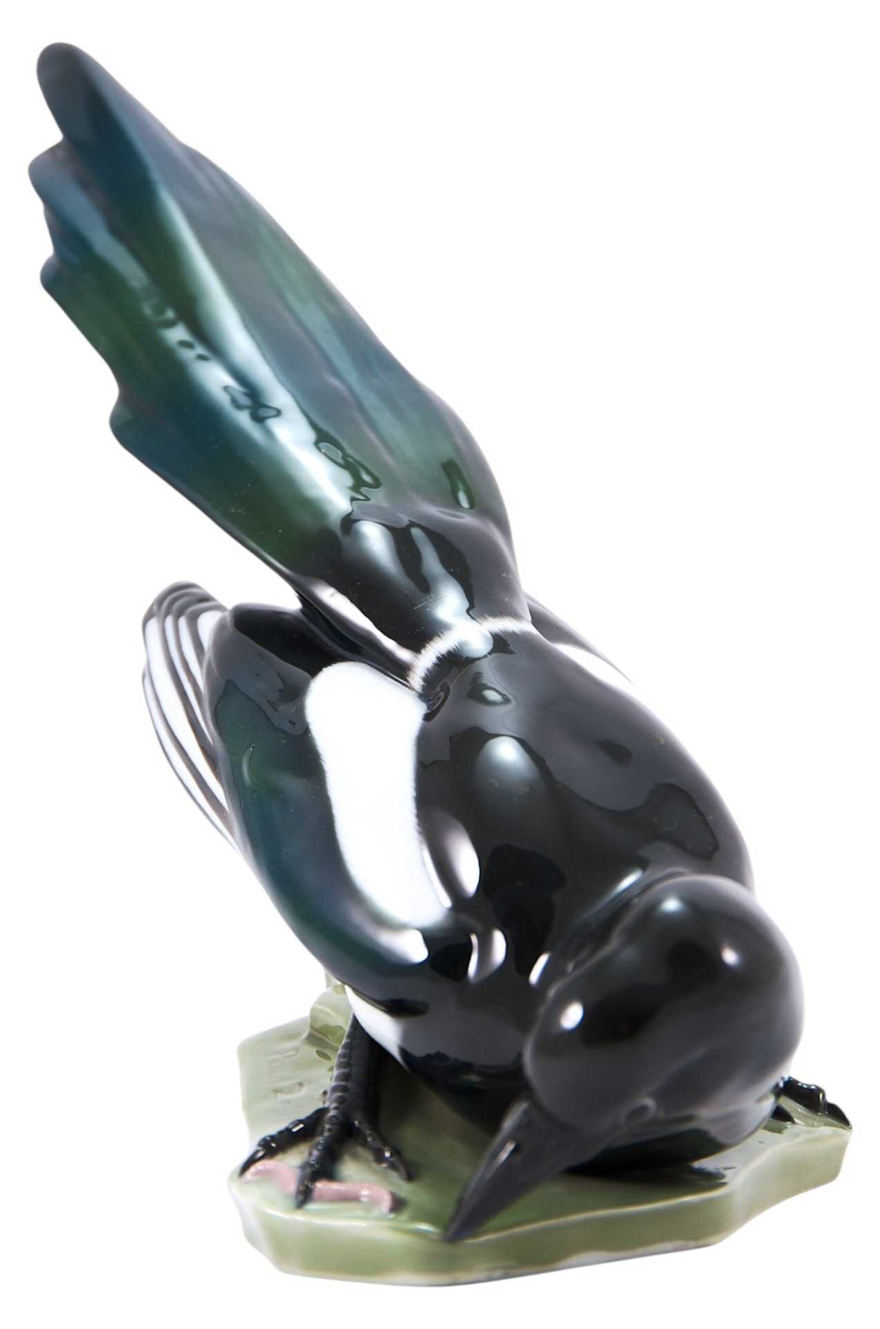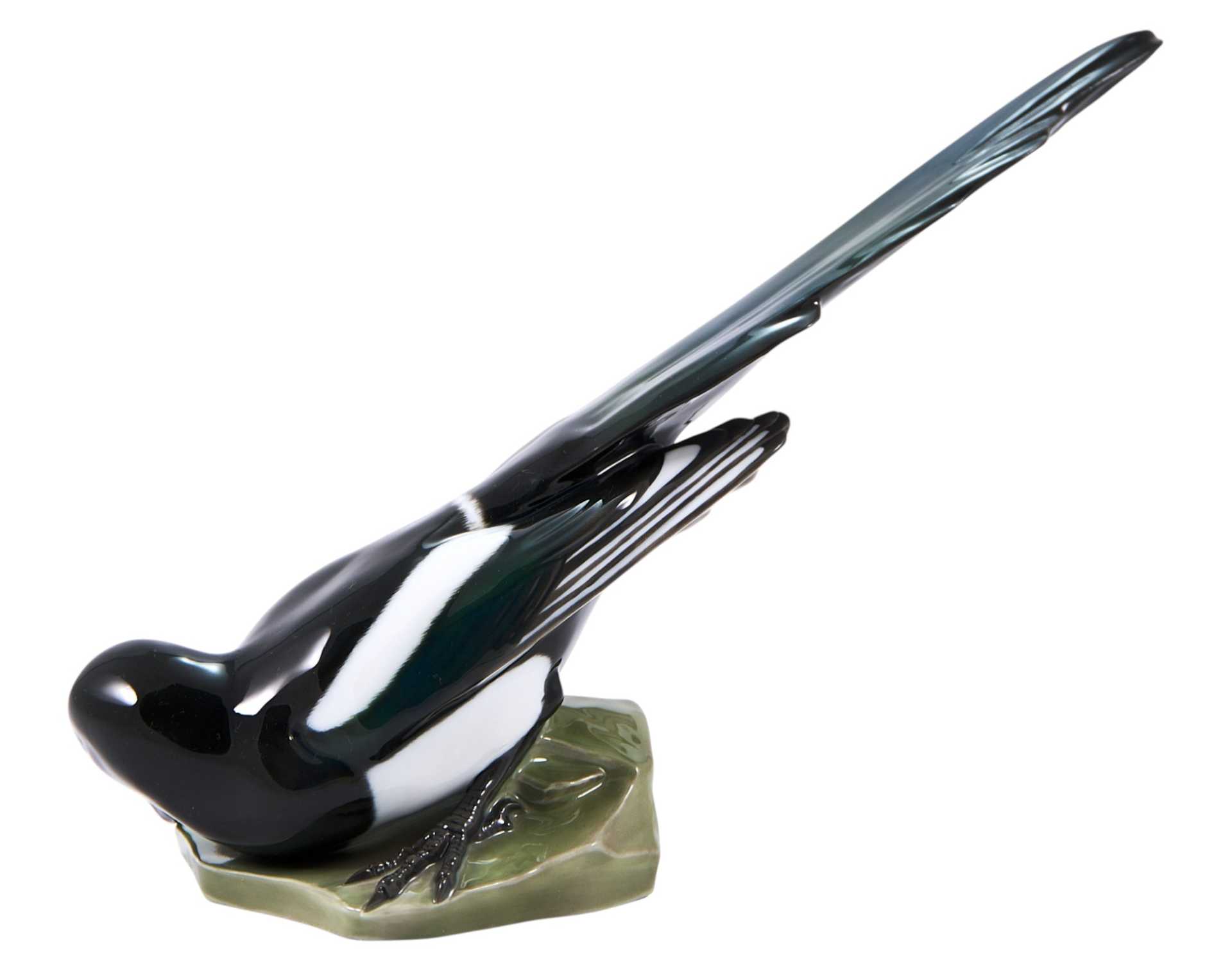 Представлена скульптура сороки. У края основания скульптуры авторская подпись «в тесте»: Paul Zeiller. На донышке основания скульптуры клеймо фабрики-изготовителя «Heubach», ставившееся с 1909 по 1945-й гг. Компания «Gebruder Heubach», расположена в Лихте (Lichte), Тюрингия, где была основана в 1820 г. и существовала до 1925 г. Продукция компании является коллекционной, и известна благодаря изготовляемым ею фарфоровым куклам безупречного качества. Paul Zeiller (Мюнхен, 1880-1915, Бад Эмс) — скульптор-анималист.