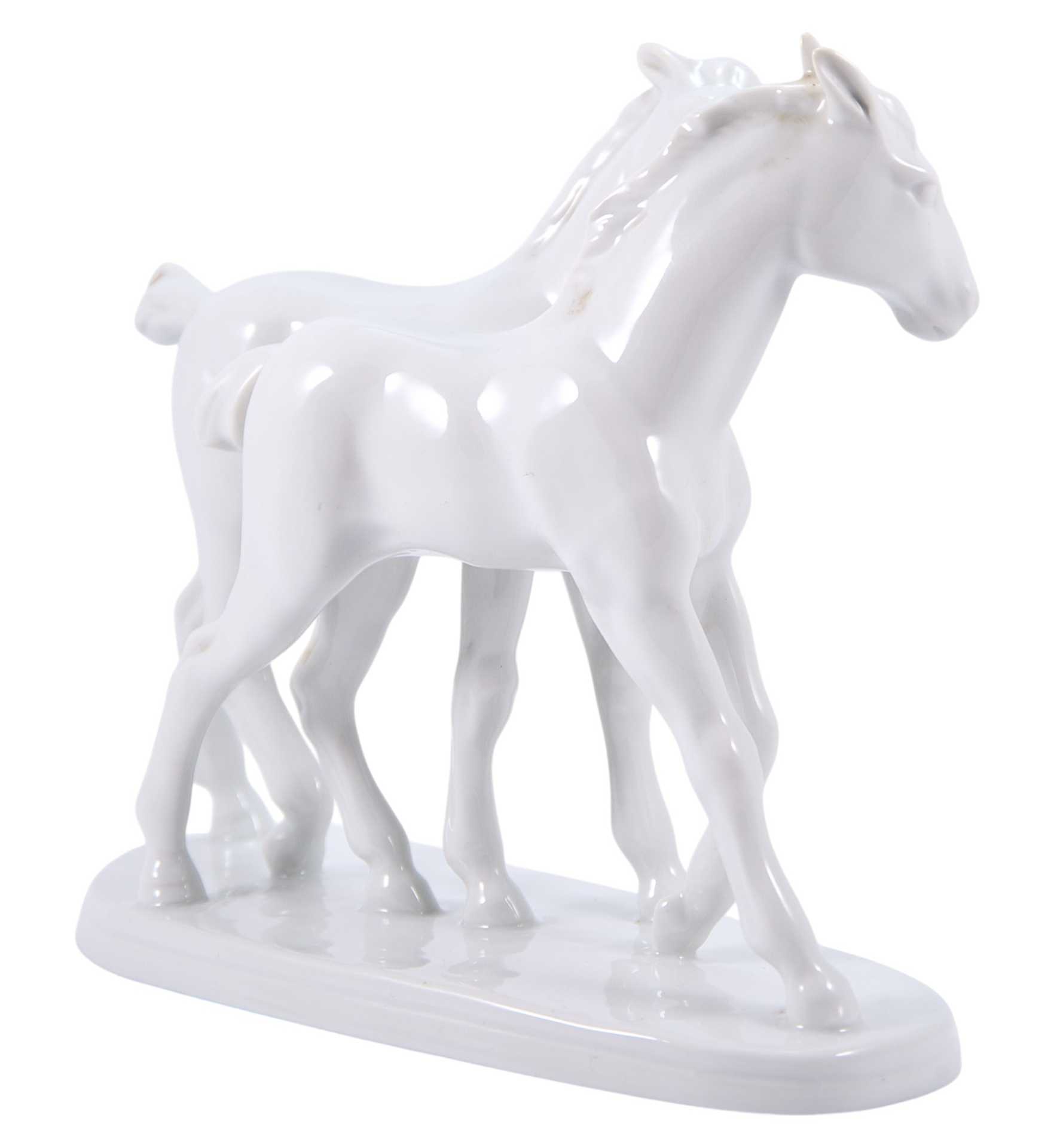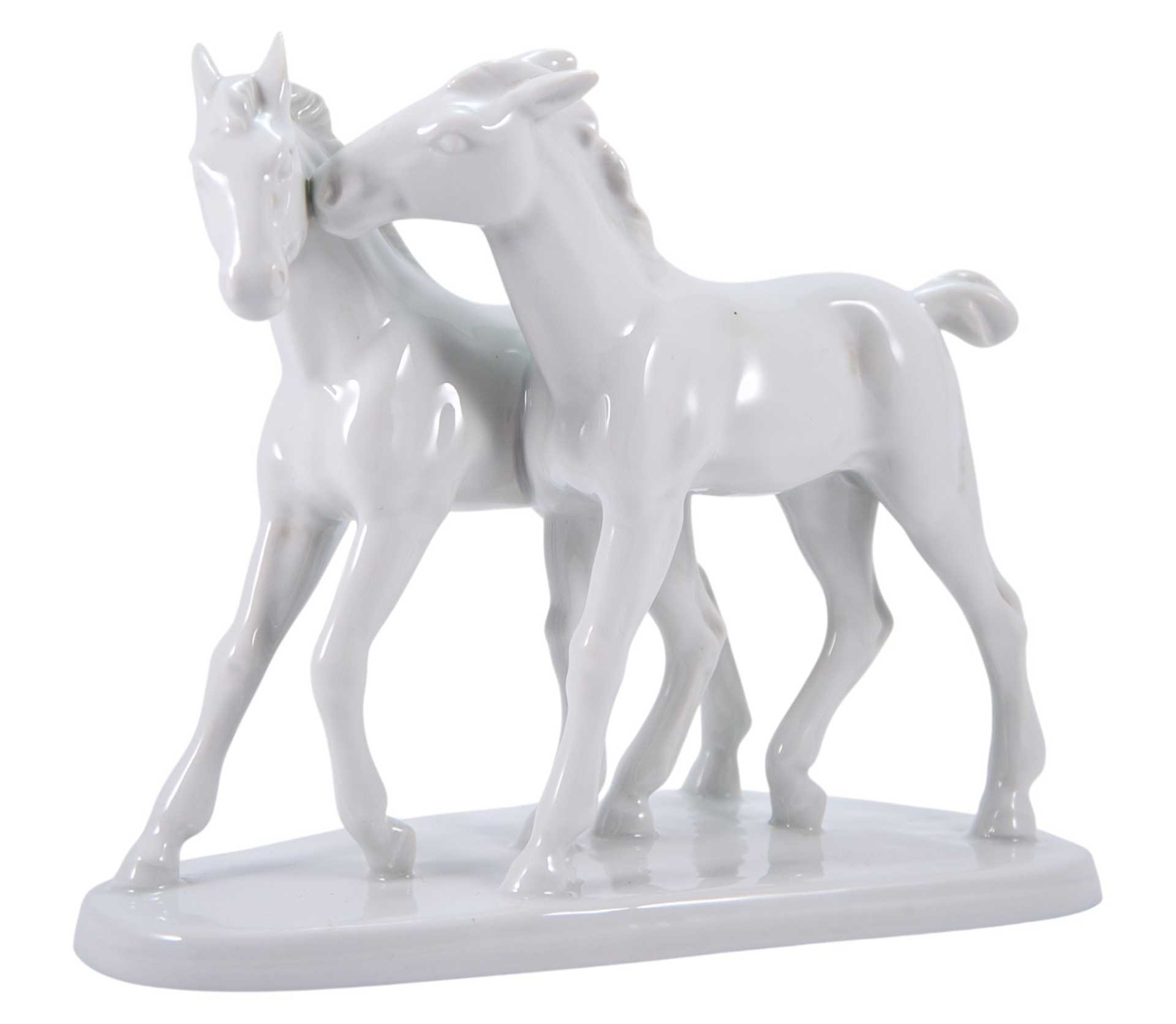 Скульптура двух жеребят. На основании клеймо изготовителя — фарфоровой фабрикиPorzellanfabrik Gerold & Со. Подмаркой штамп, ставившийся на изделиях завода после 1949 г.: «Made in West Germany». Porzellanfabrik Gerold & Со.