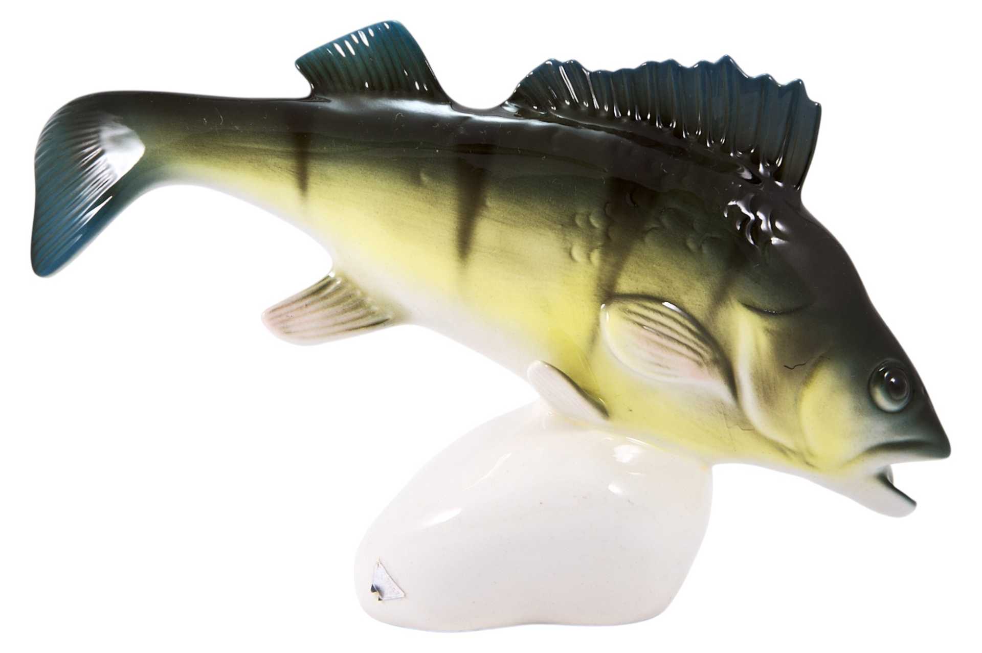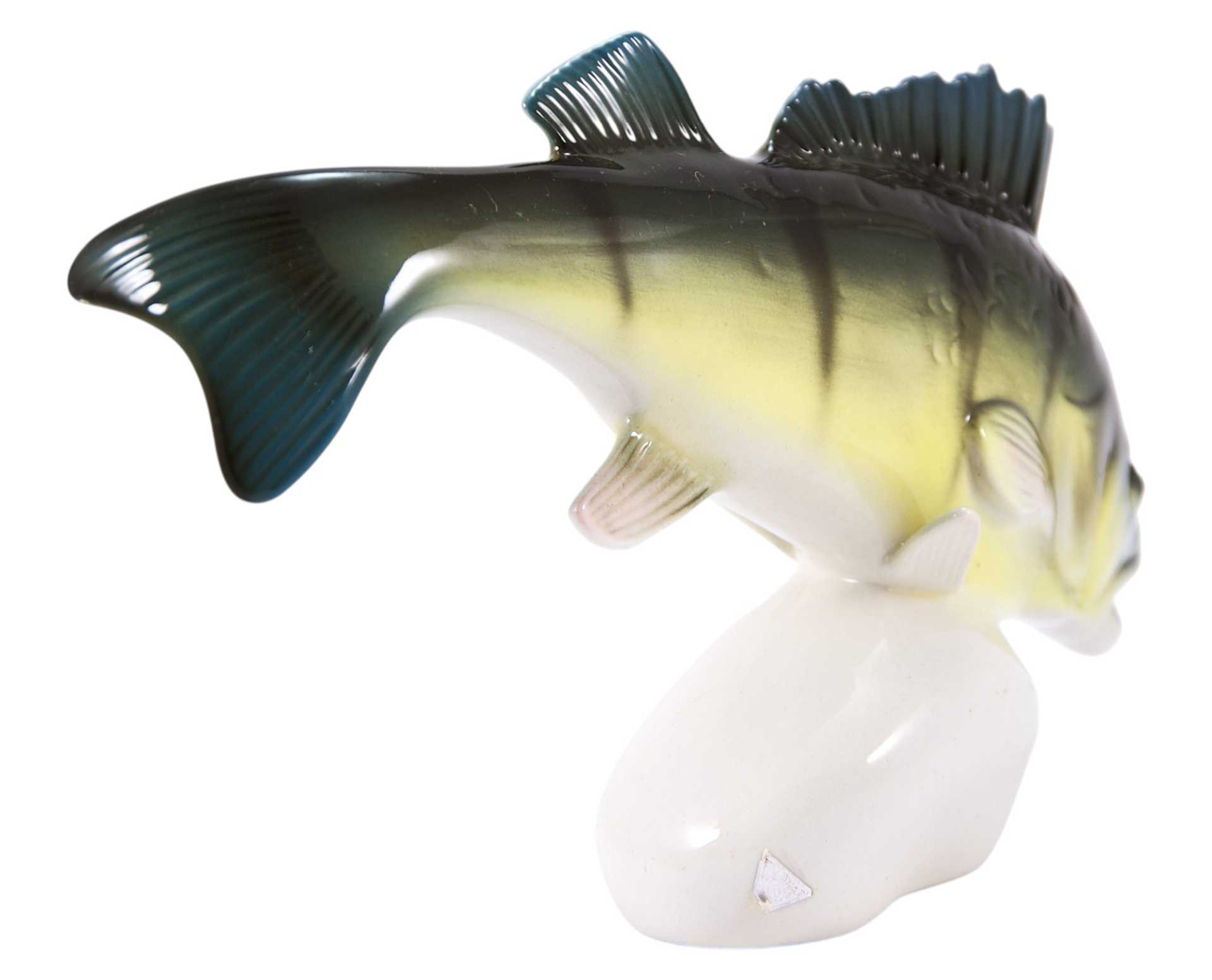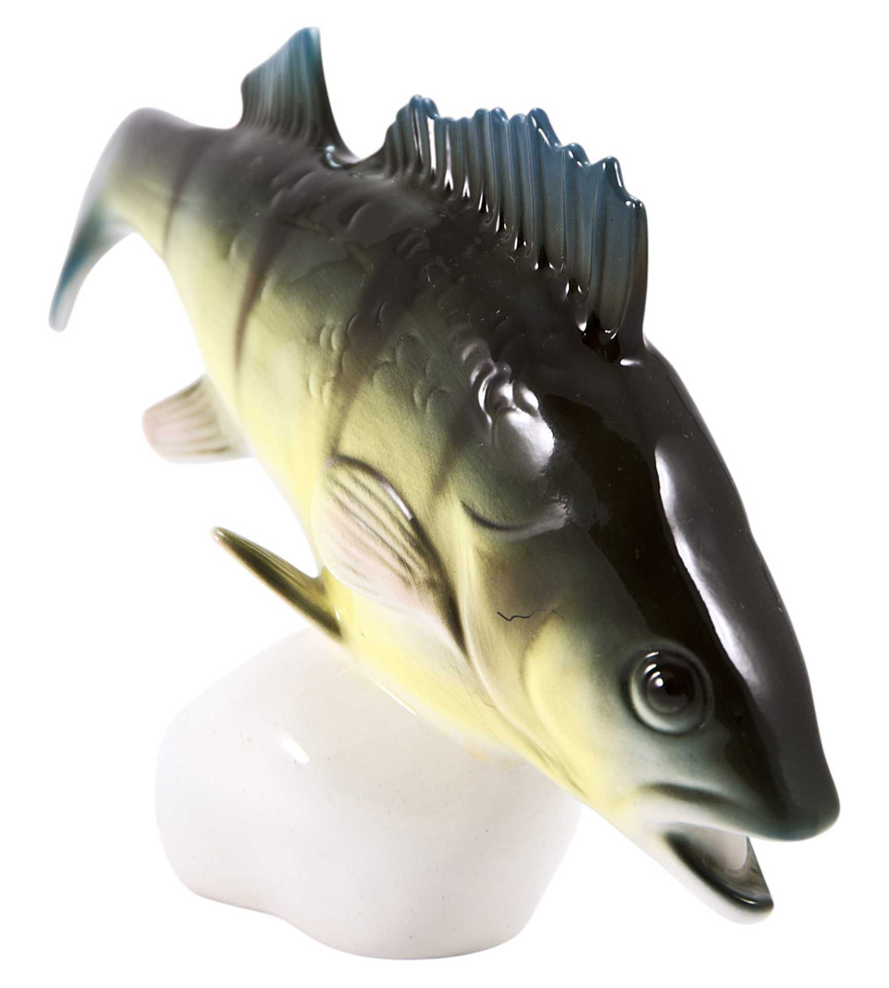 Скульптура речного окуня. Скульптура принадлежит к серии фигур представляющих речных рыб, изготавливавшихся чешской фарфоровой фабрики Royal Dux в период с 1946 по 1990 гг. На основании обозначение - (сертифицированный товарный знак). «В тесте» производственные обозначения: «640 / 79 / 10» Фарфоровая фабрика Royal Dux (Чехословакия).