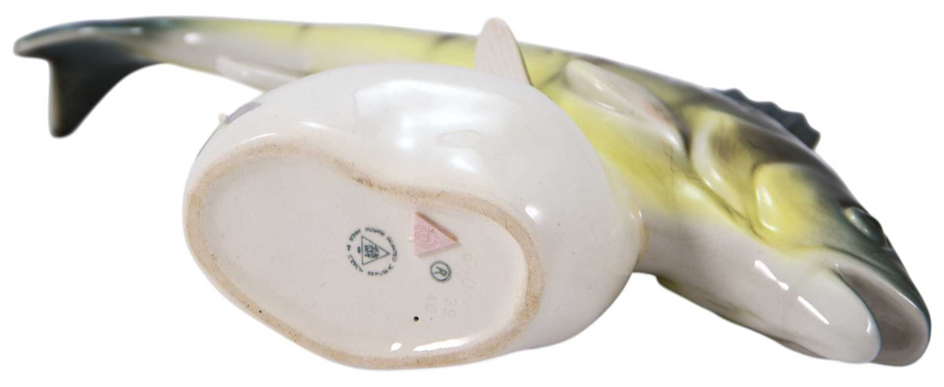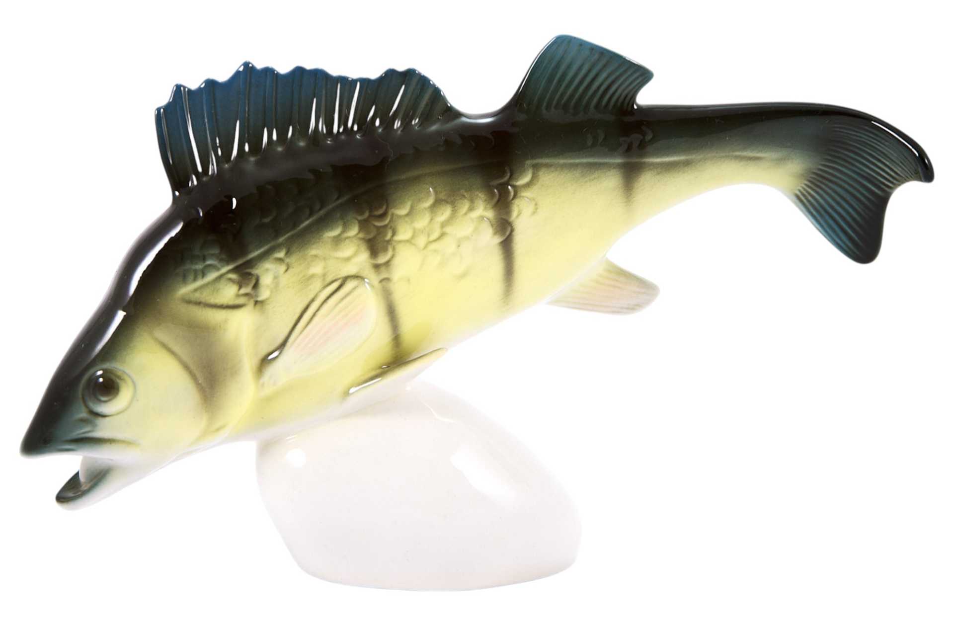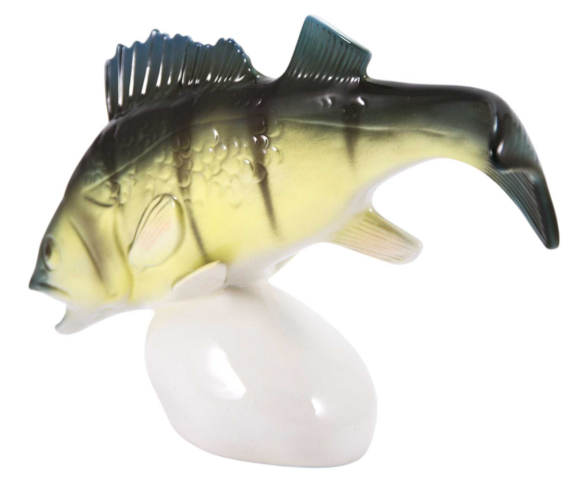 Скульптура речного окуня. Скульптура принадлежит к серии фигур представляющих речных рыб, изготавливавшихся чешской фарфоровой фабрики Royal Dux в период с 1946 по 1990 гг. На основании обозначение - (сертифицированный товарный знак). «В тесте» производственные обозначения: «640 / 79 / 10» Фарфоровая фабрика Royal Dux (Чехословакия).