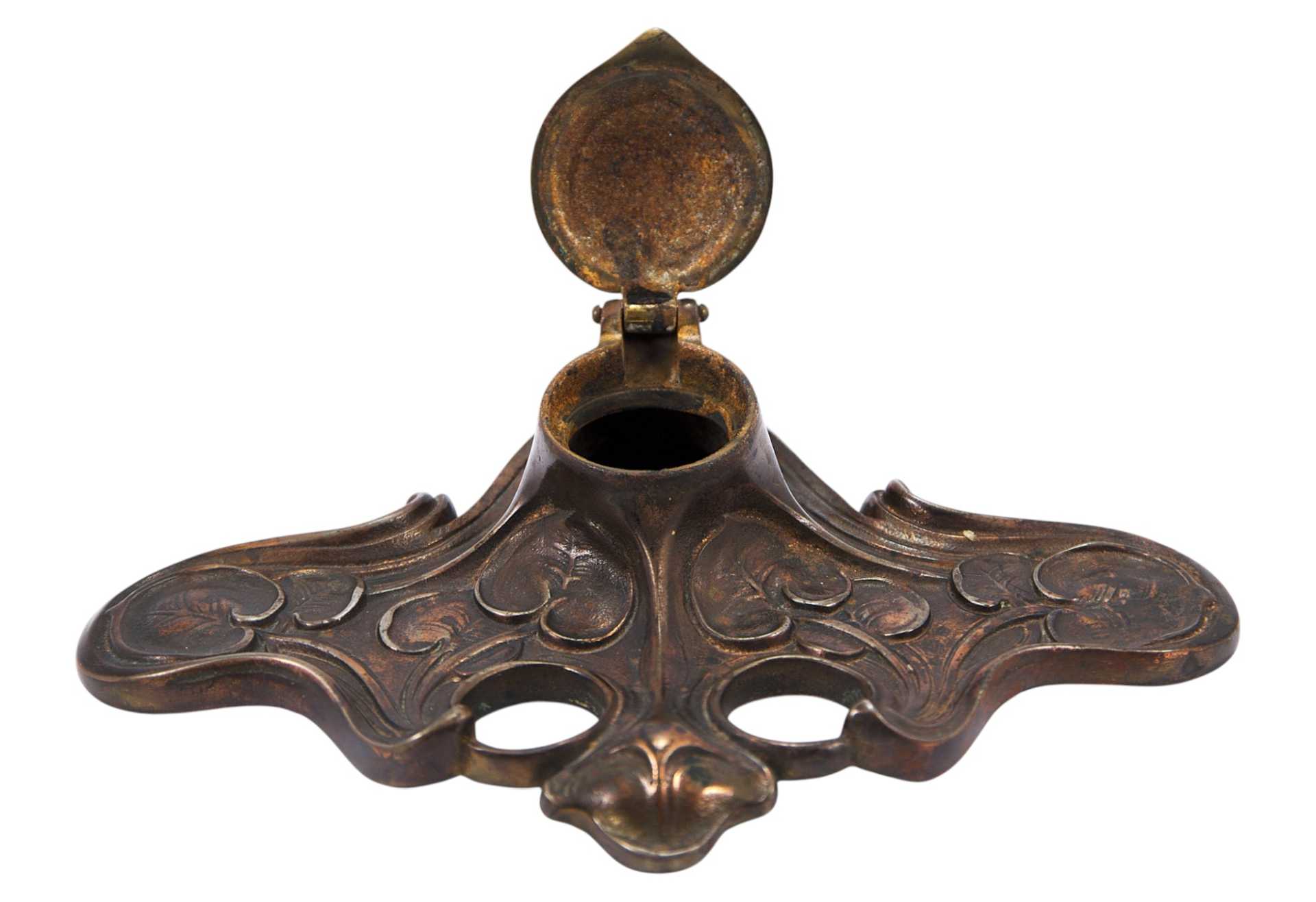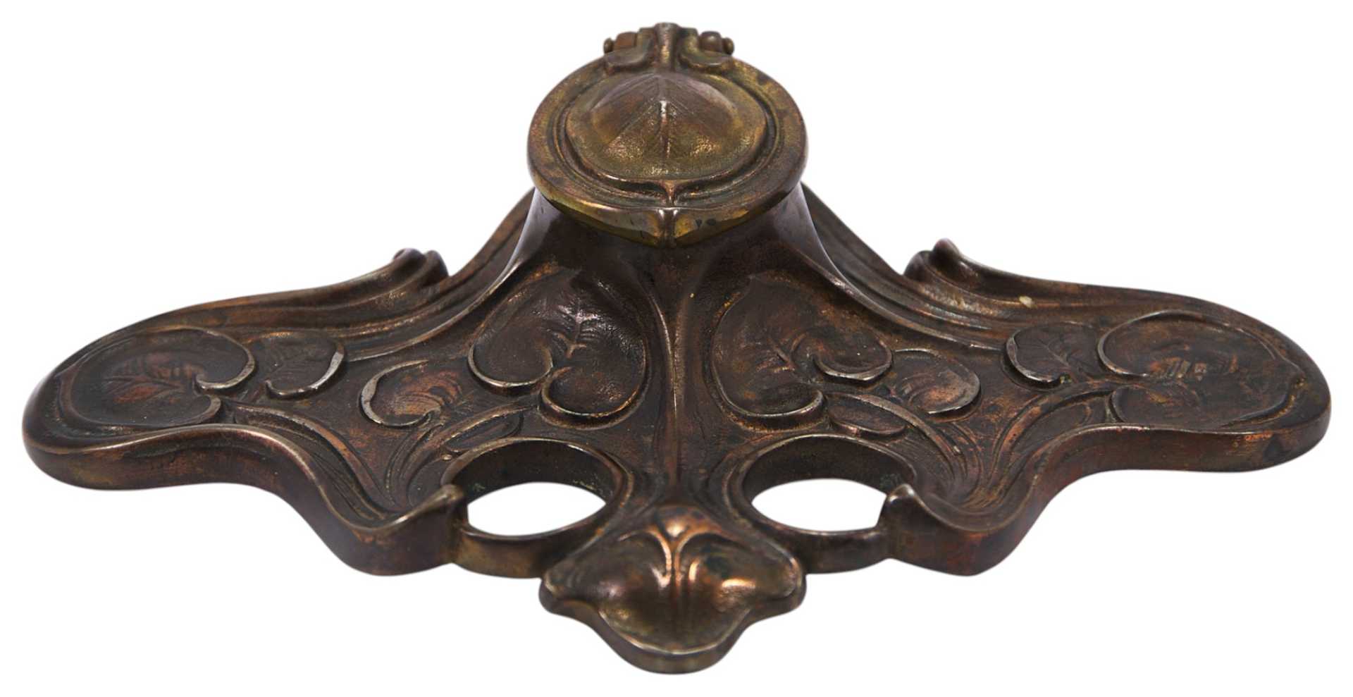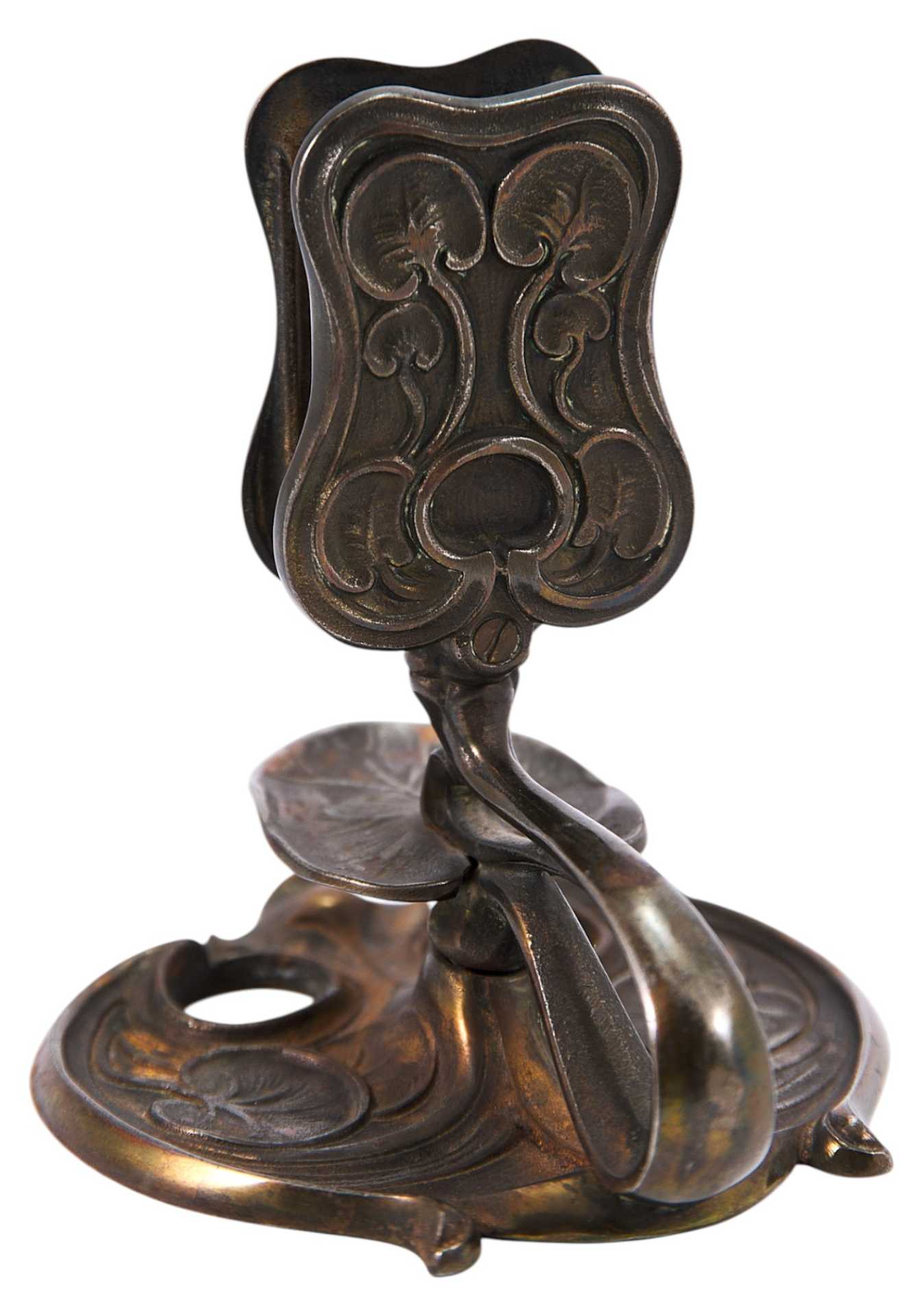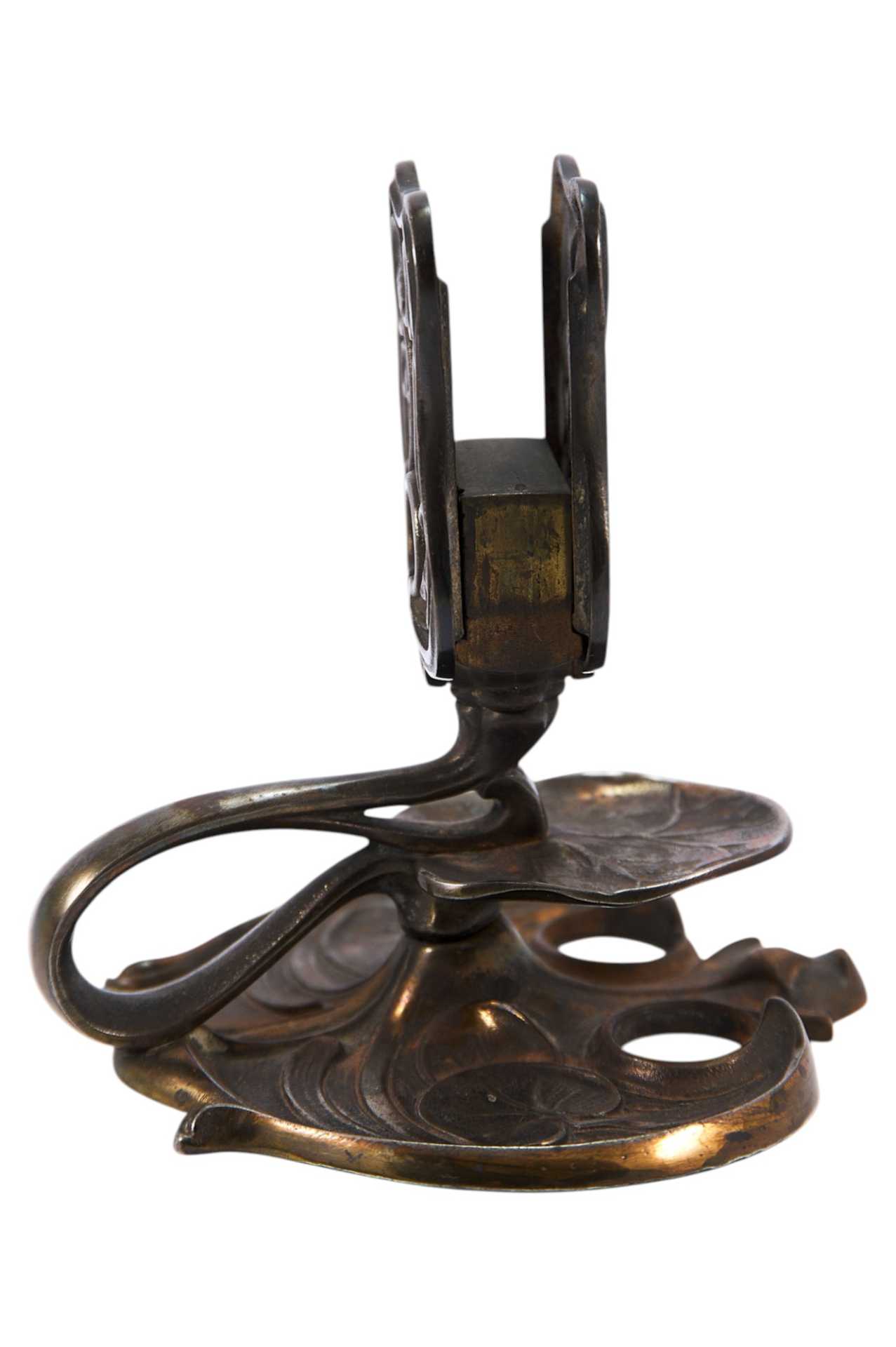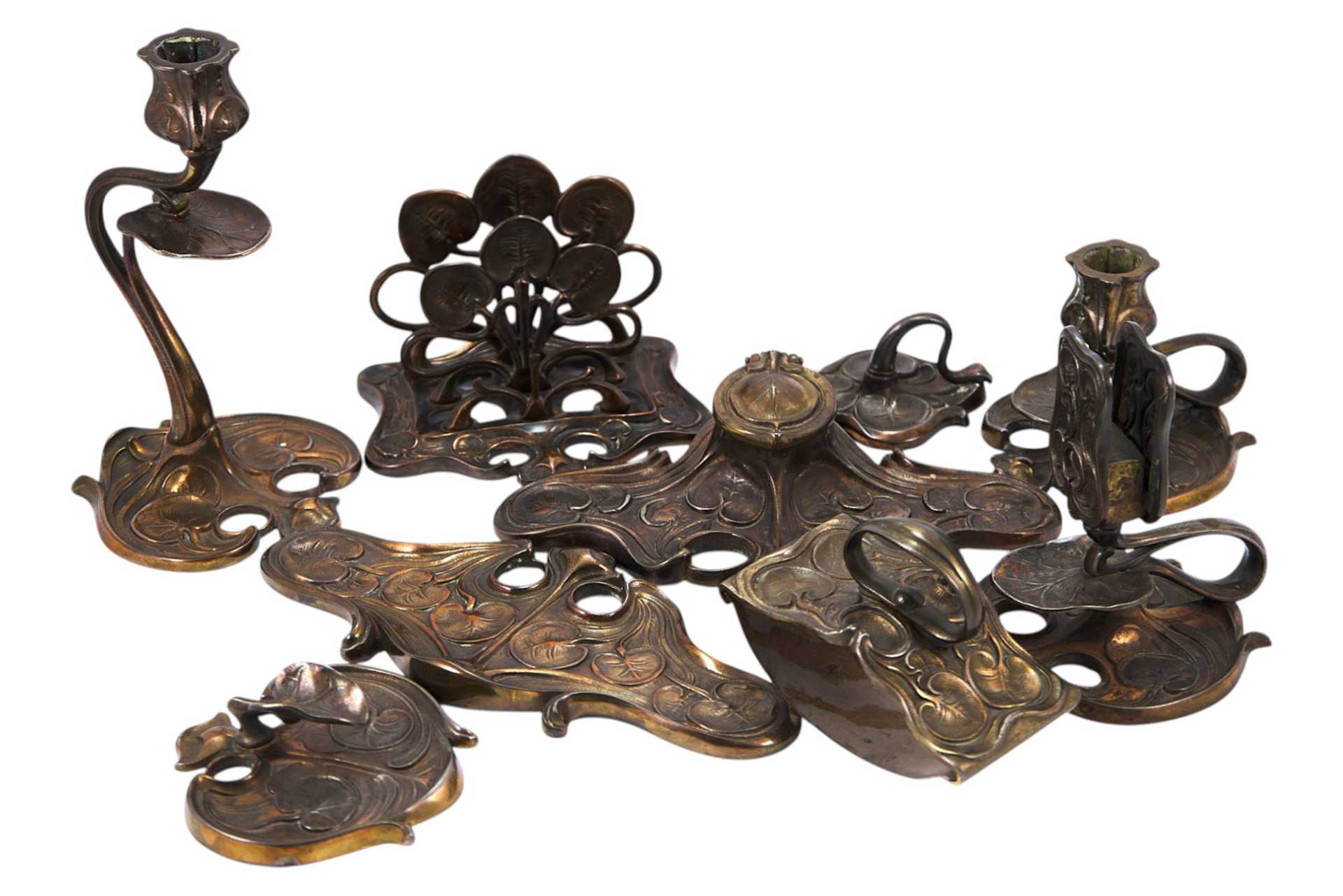 Письменный прибор состоит из девяти предметов: двух подсвечников - 21,8; 9,5 см., пепельницы - 3,8 см., пресс - бювара - 4,8 см., пресс - папье - 8,2 см., спичечницы - 13,6 см., чернильницы - 5,9 см, подставки под ручку - 1,8 см., подставки под бумагу — 12,2 см. Приборы имеют ажурные волнистые линии по борту и украшены рельефными листьями. Имеется клеймо в рамке: изображение солнце с лучами и птицы на колесе над инициалами «ДЖ».