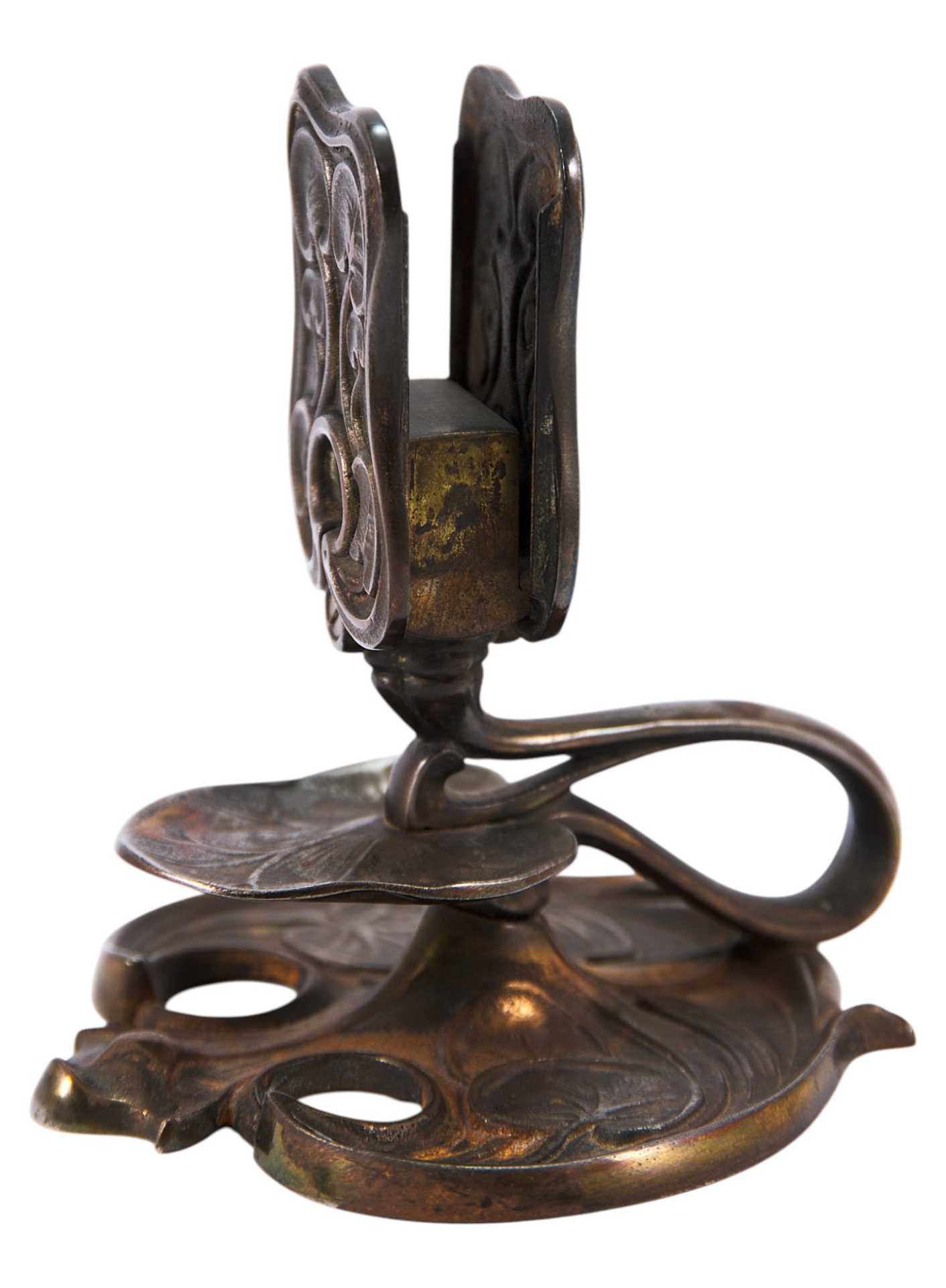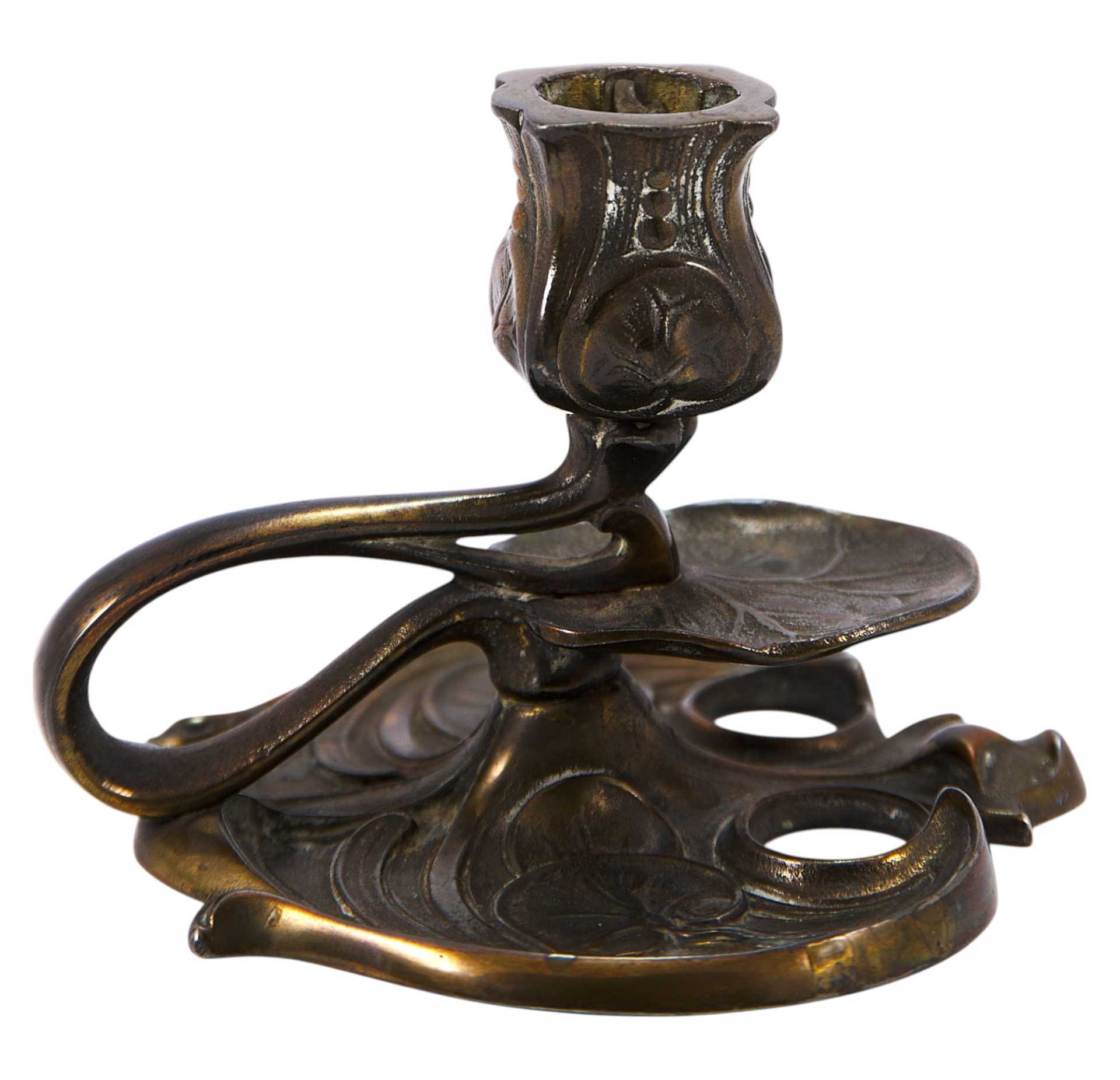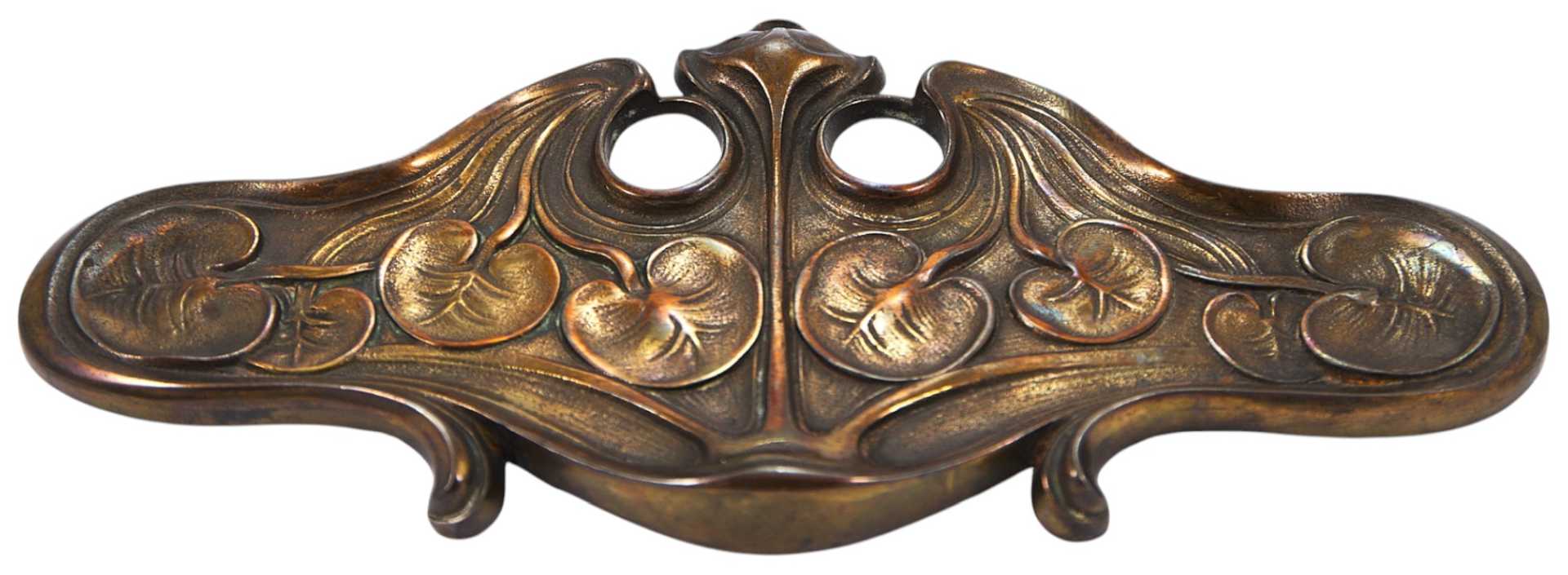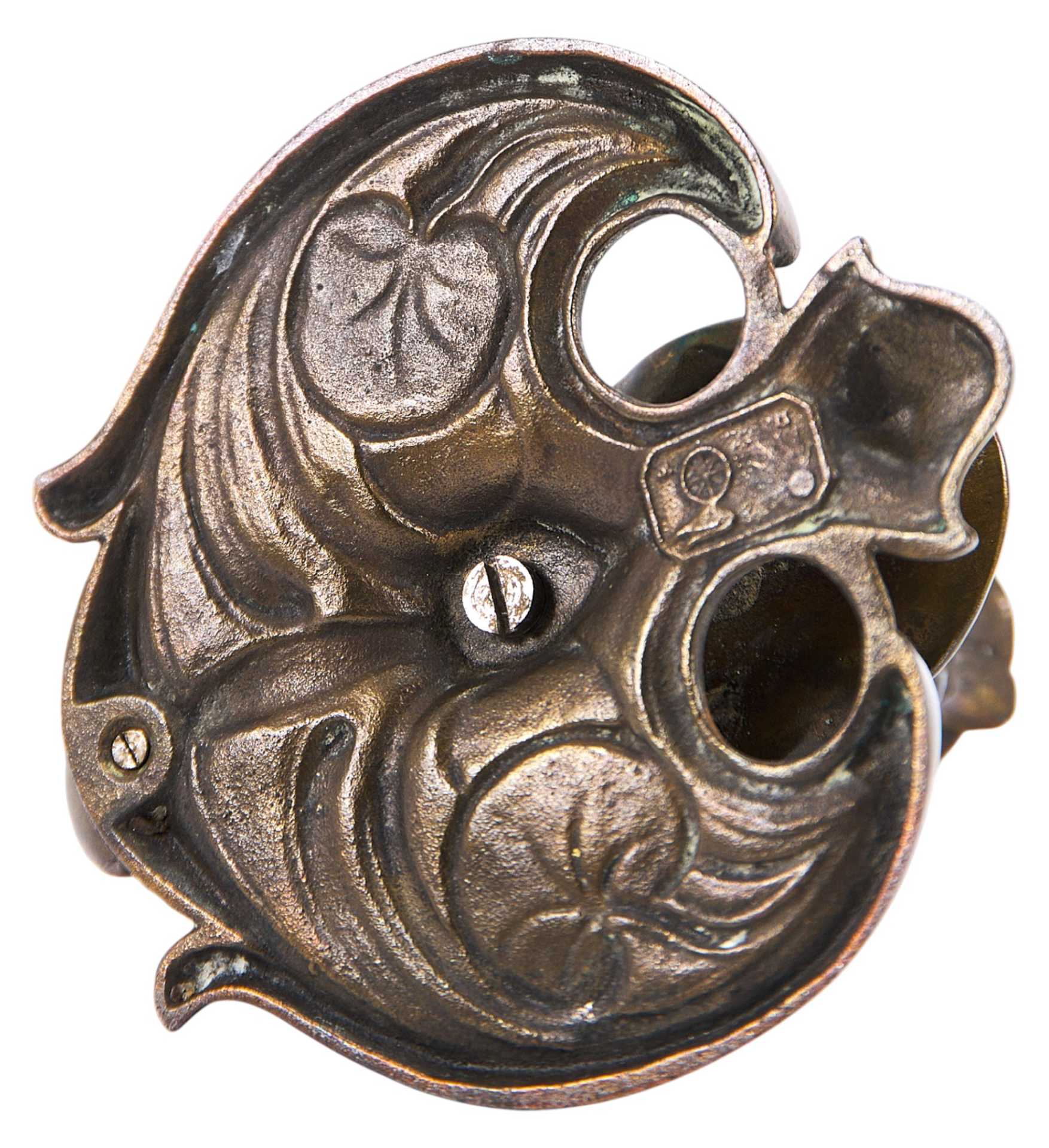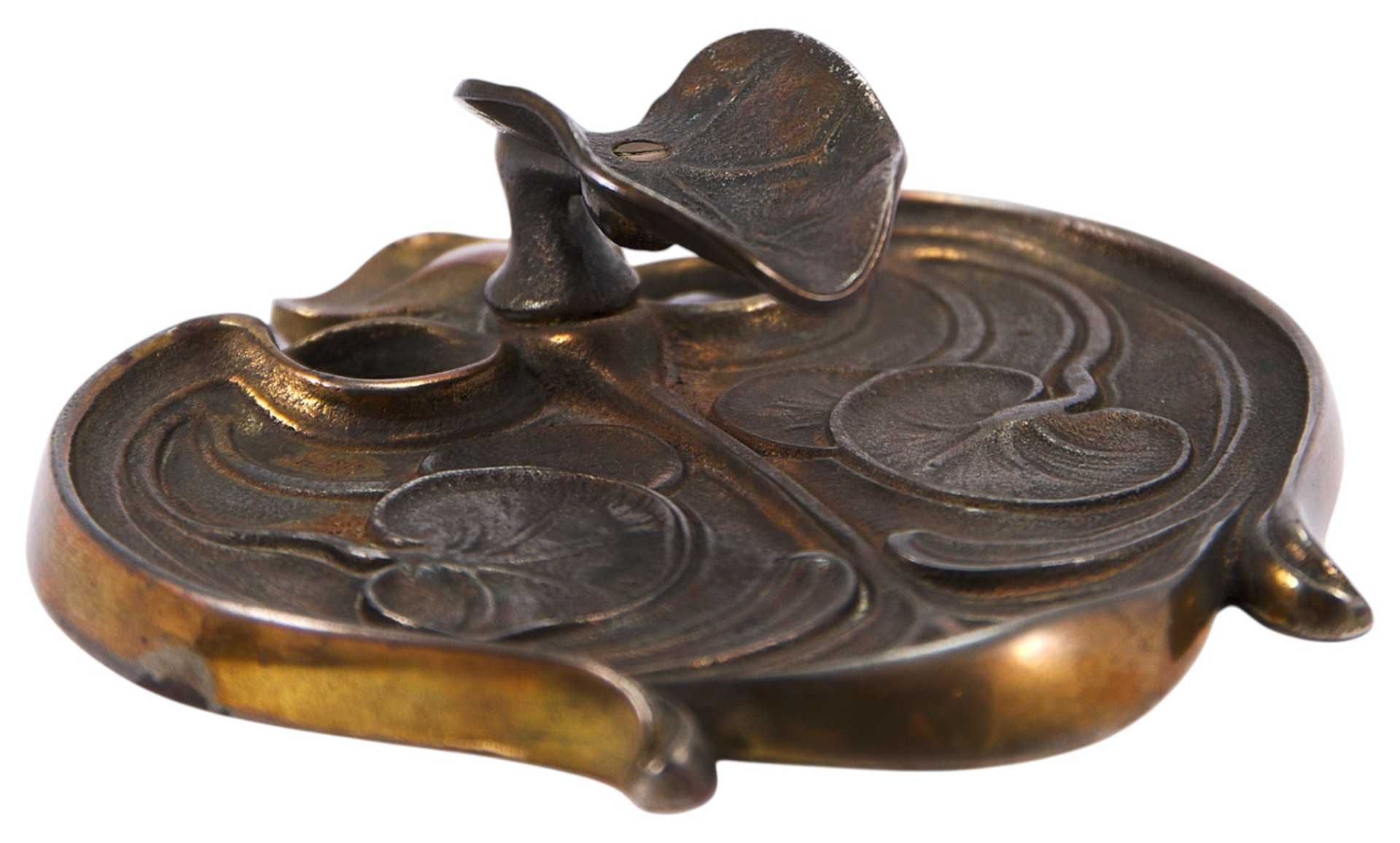 Письменный прибор состоит из девяти предметов: двух подсвечников - 21,8; 9,5 см., пепельницы - 3,8 см., пресс - бювара - 4,8 см., пресс - папье - 8,2 см., спичечницы - 13,6 см., чернильницы - 5,9 см, подставки под ручку - 1,8 см., подставки под бумагу — 12,2 см. Приборы имеют ажурные волнистые линии по борту и украшены рельефными листьями. Имеется клеймо в рамке: изображение солнце с лучами и птицы на колесе над инициалами «ДЖ».