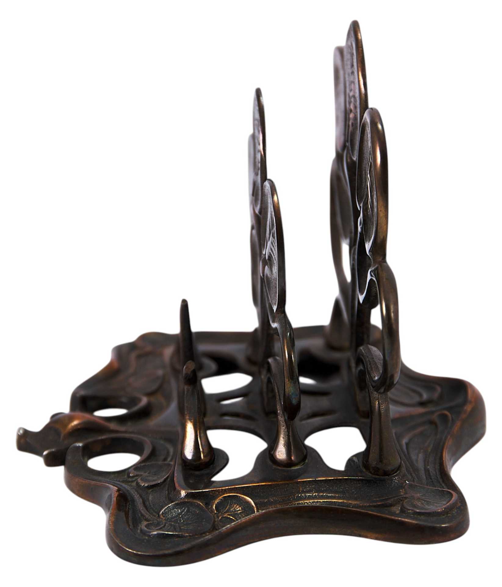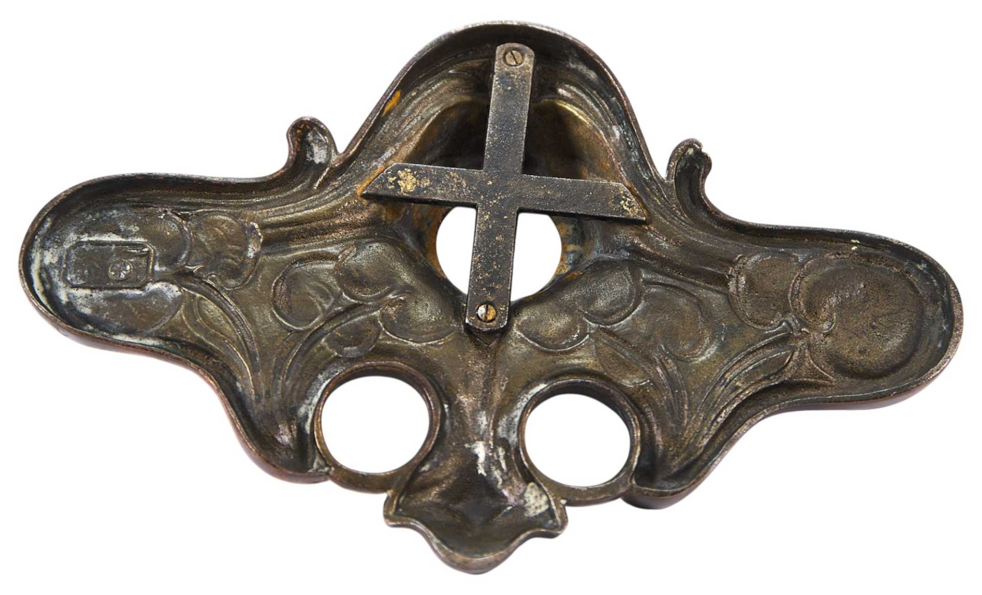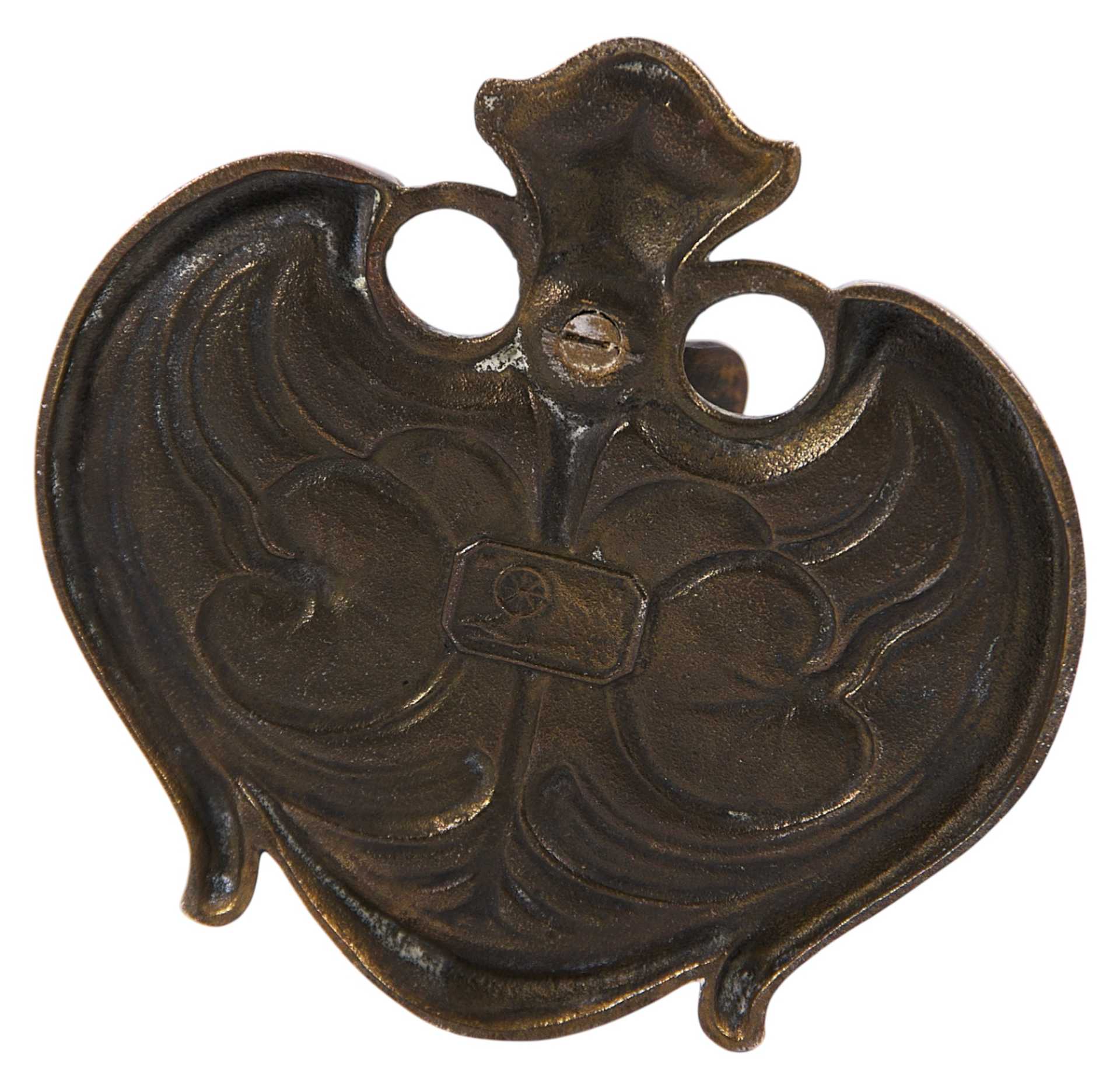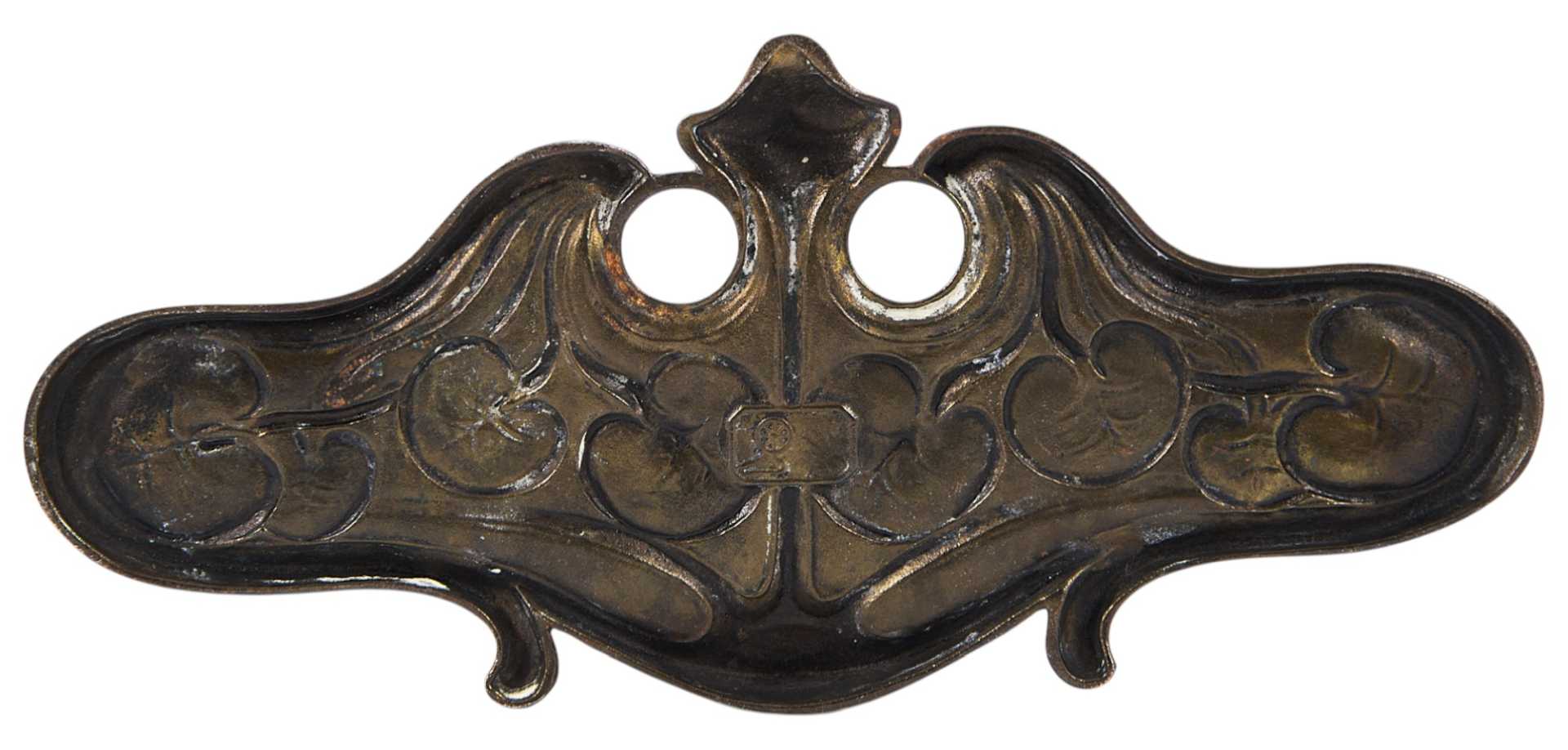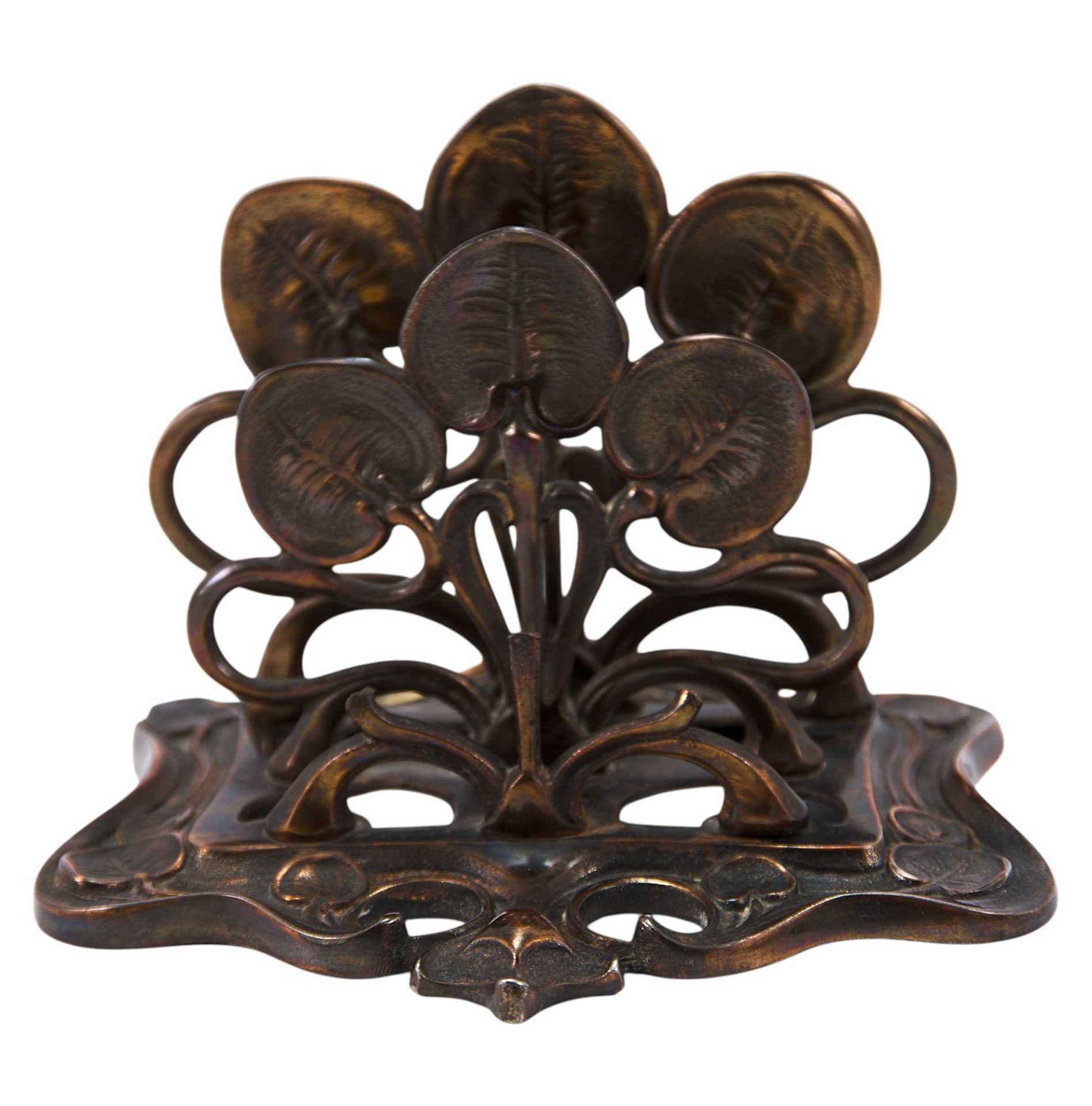 Письменный прибор состоит из девяти предметов: двух подсвечников - 21,8; 9,5 см., пепельницы - 3,8 см., пресс - бювара - 4,8 см., пресс - папье - 8,2 см., спичечницы - 13,6 см., чернильницы - 5,9 см, подставки под ручку - 1,8 см., подставки под бумагу — 12,2 см. Приборы имеют ажурные волнистые линии по борту и украшены рельефными листьями. Имеется клеймо в рамке: изображение солнце с лучами и птицы на колесе над инициалами «ДЖ».