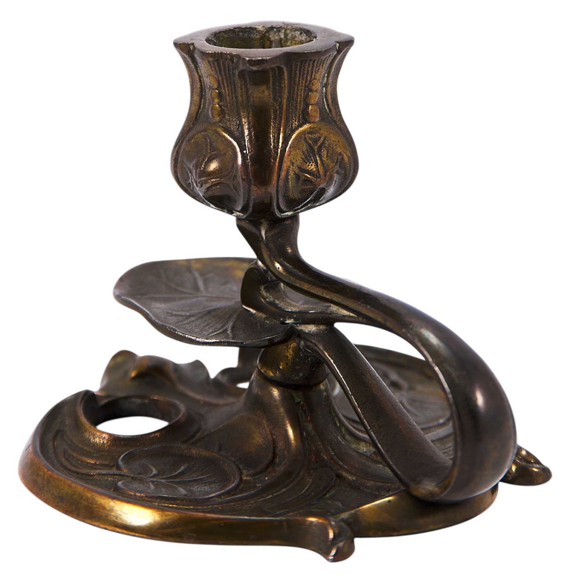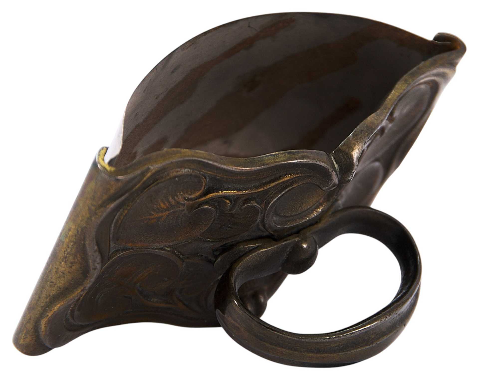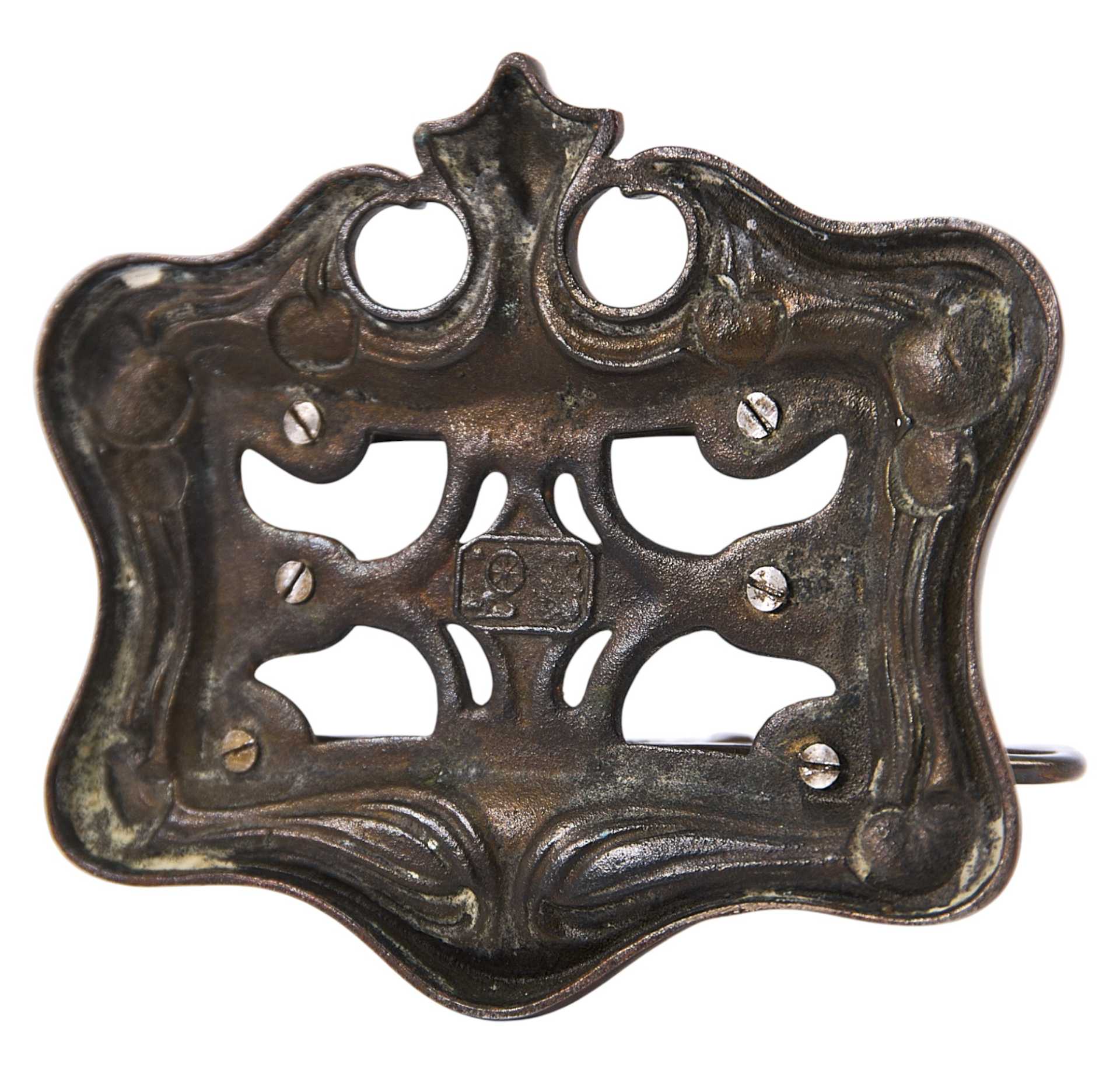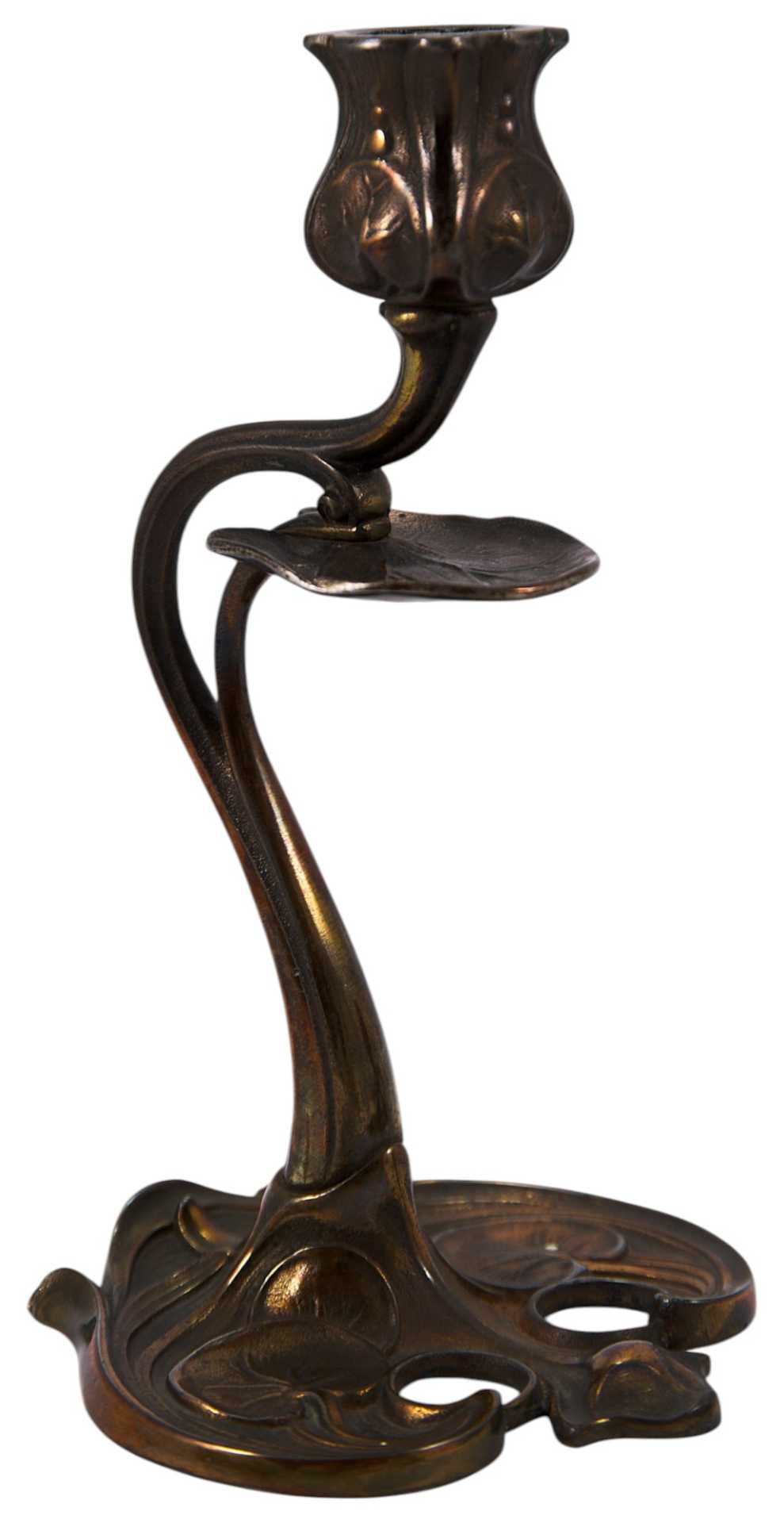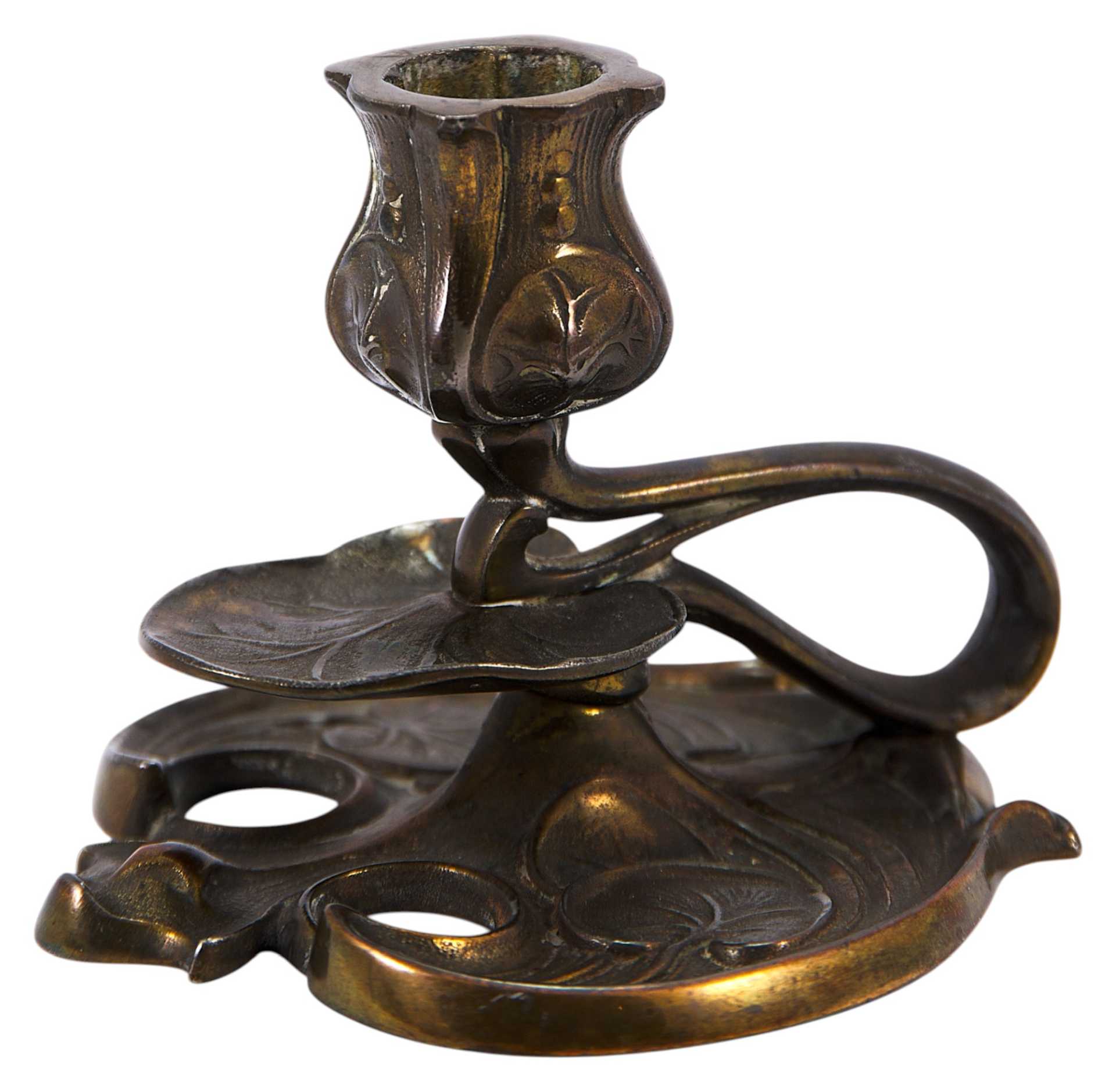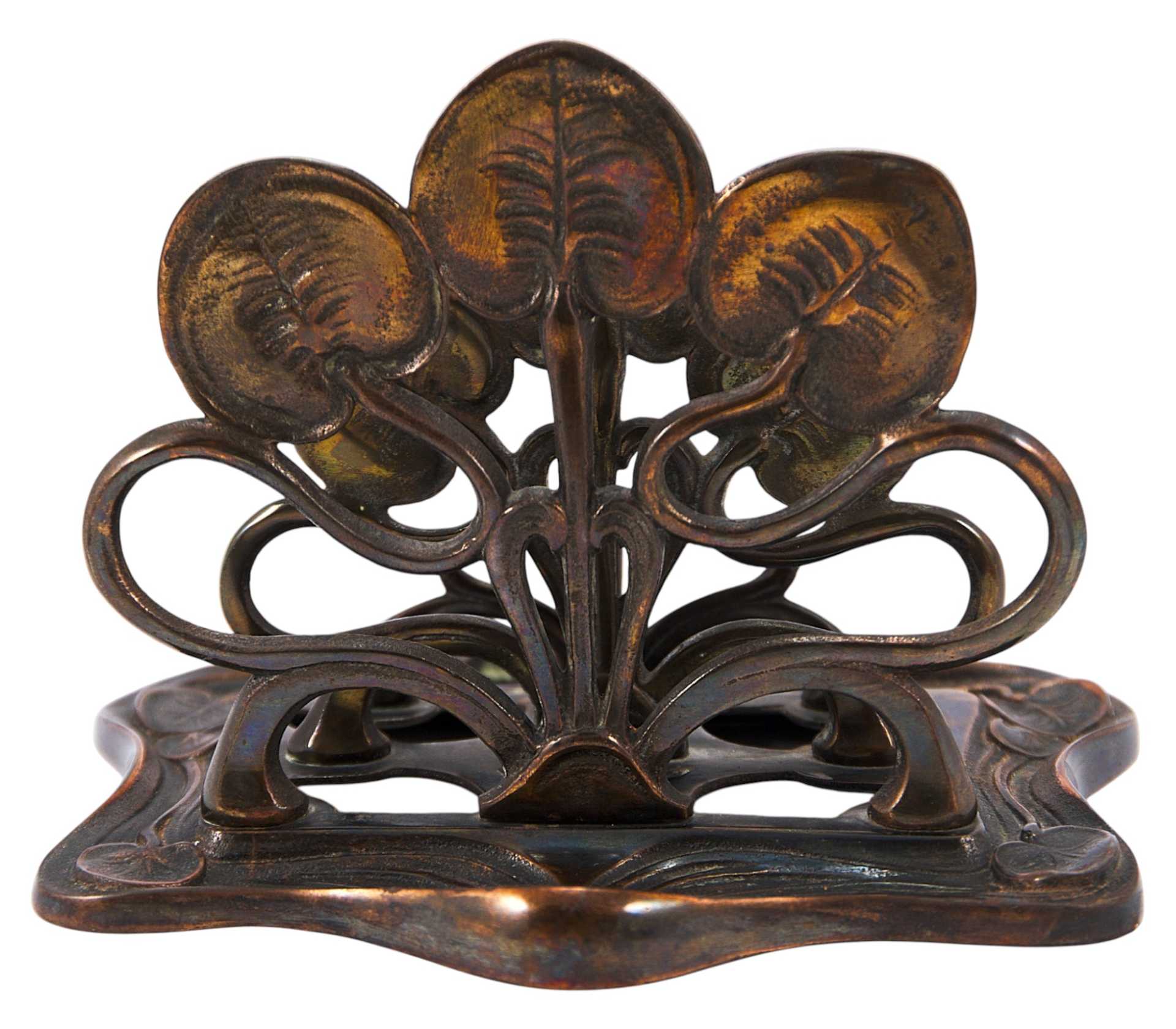 Письменный прибор состоит из девяти предметов: двух подсвечников - 21,8; 9,5 см., пепельницы - 3,8 см., пресс - бювара - 4,8 см., пресс - папье - 8,2 см., спичечницы - 13,6 см., чернильницы - 5,9 см, подставки под ручку - 1,8 см., подставки под бумагу — 12,2 см. Приборы имеют ажурные волнистые линии по борту и украшены рельефными листьями. Имеется клеймо в рамке: изображение солнце с лучами и птицы на колесе над инициалами «ДЖ».