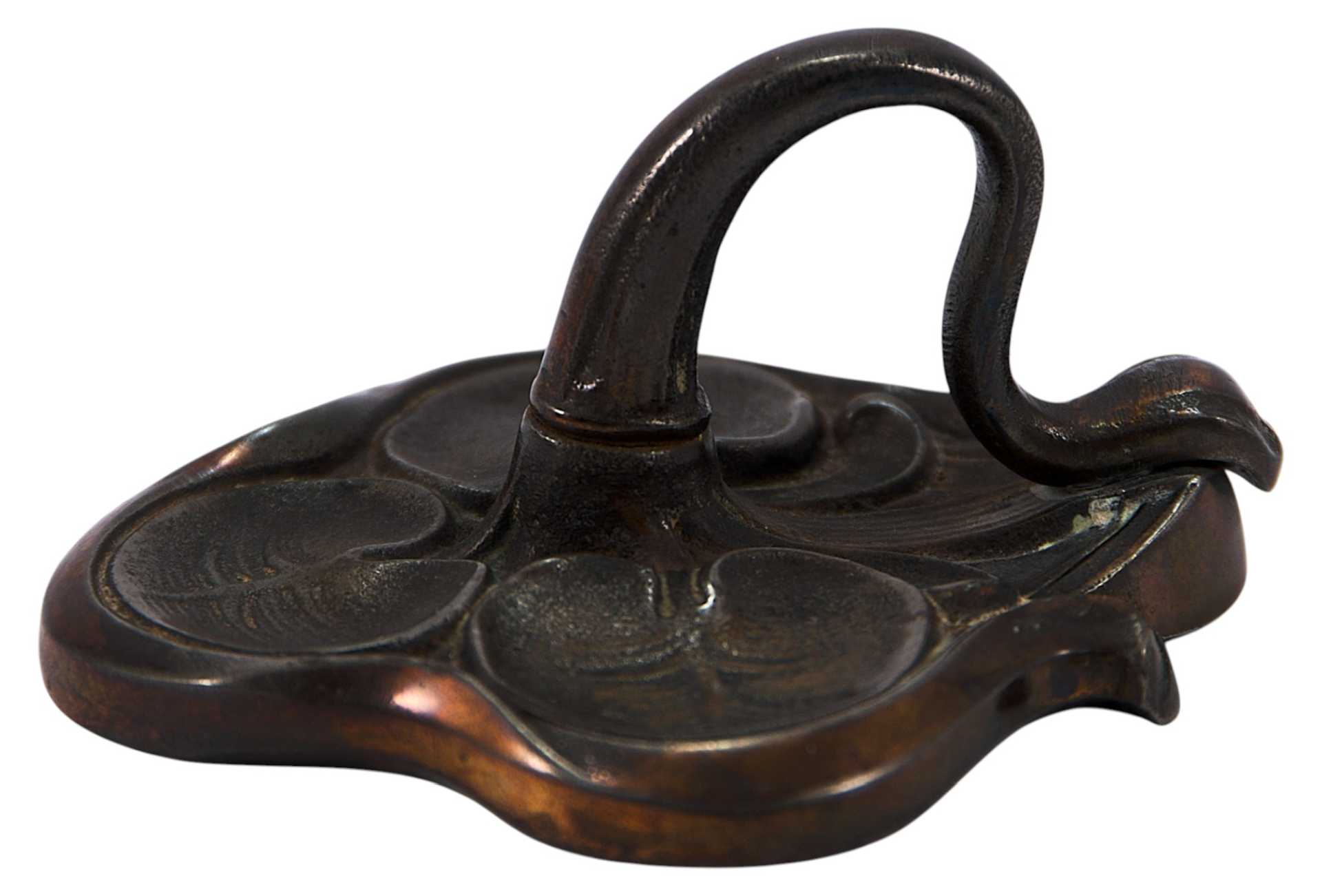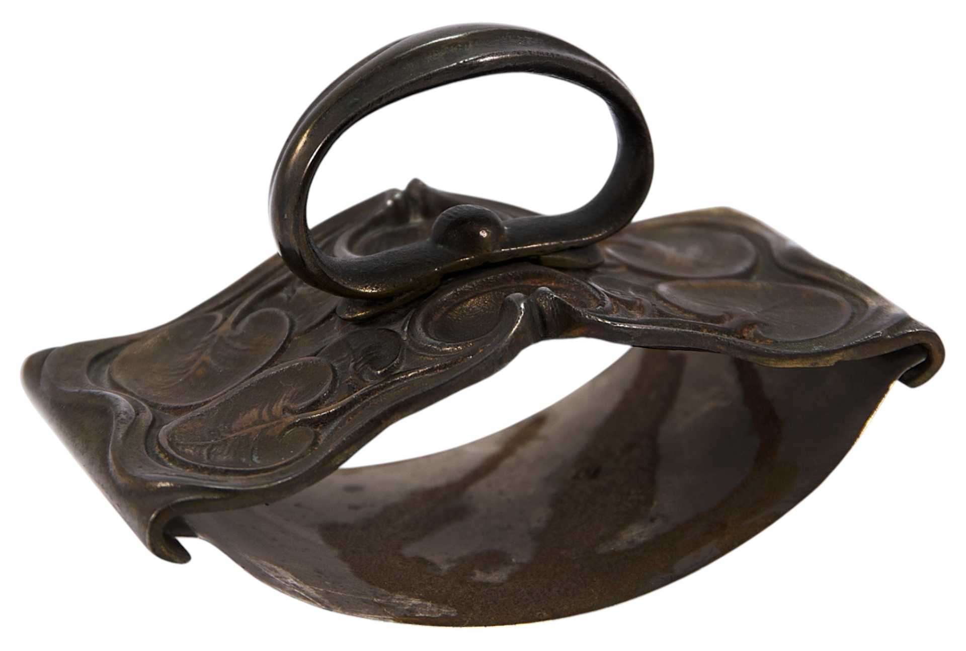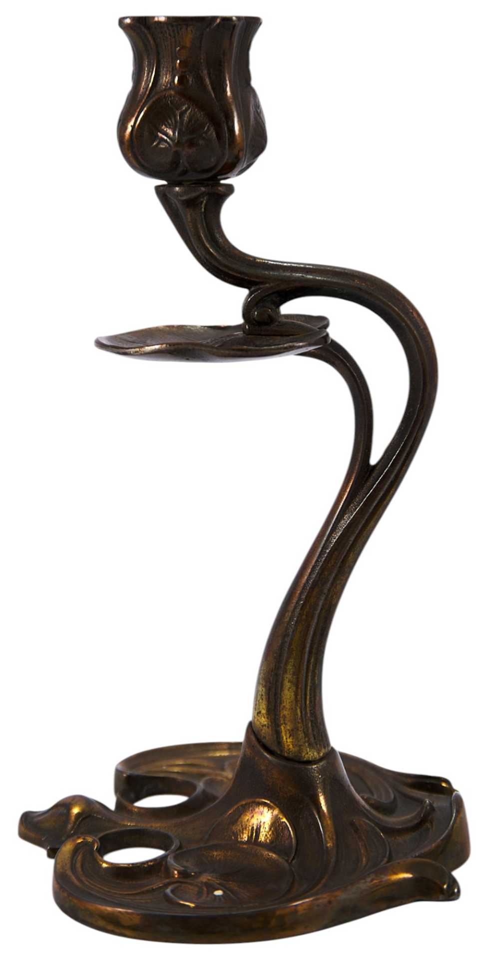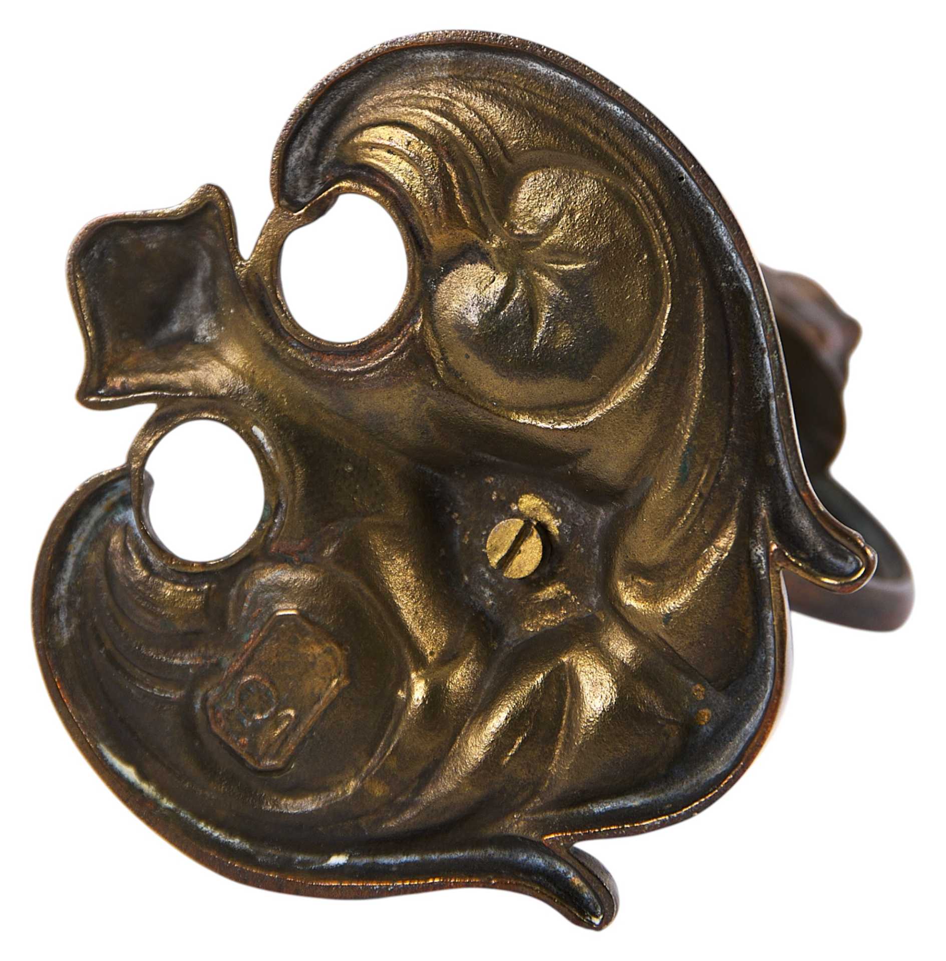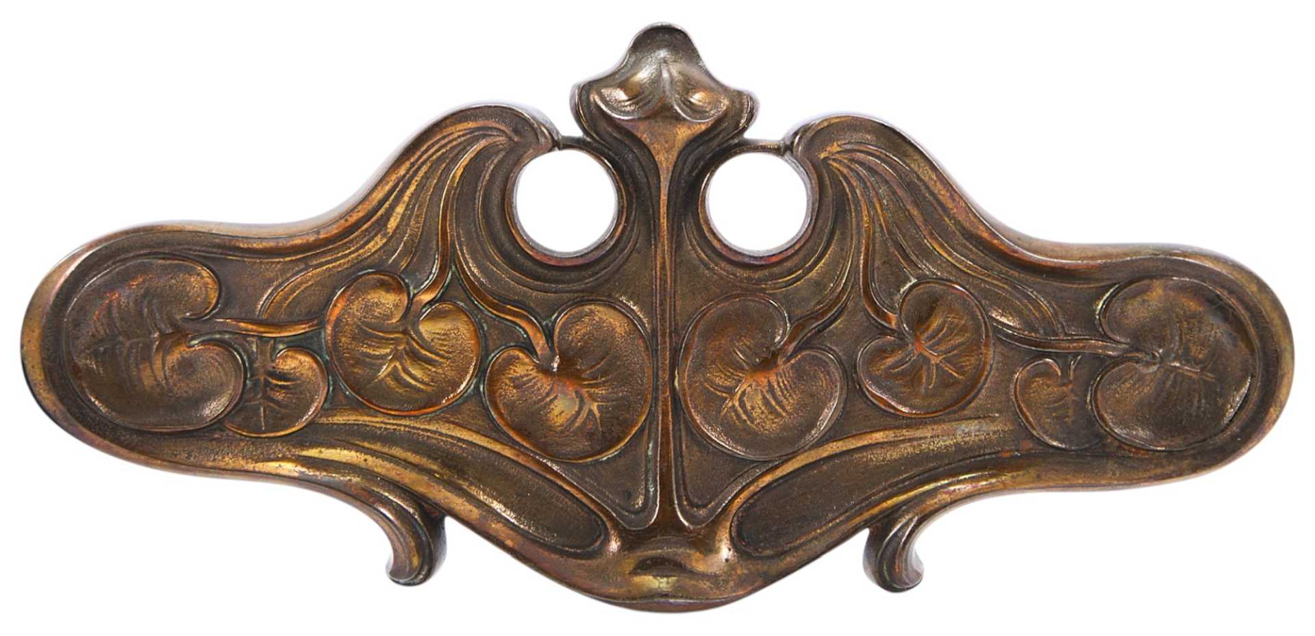 Письменный прибор состоит из девяти предметов: двух подсвечников - 21,8; 9,5 см., пепельницы - 3,8 см., пресс - бювара - 4,8 см., пресс - папье - 8,2 см., спичечницы - 13,6 см., чернильницы - 5,9 см, подставки под ручку - 1,8 см., подставки под бумагу — 12,2 см. Приборы имеют ажурные волнистые линии по борту и украшены рельефными листьями. Имеется клеймо в рамке: изображение солнце с лучами и птицы на колесе над инициалами «ДЖ».