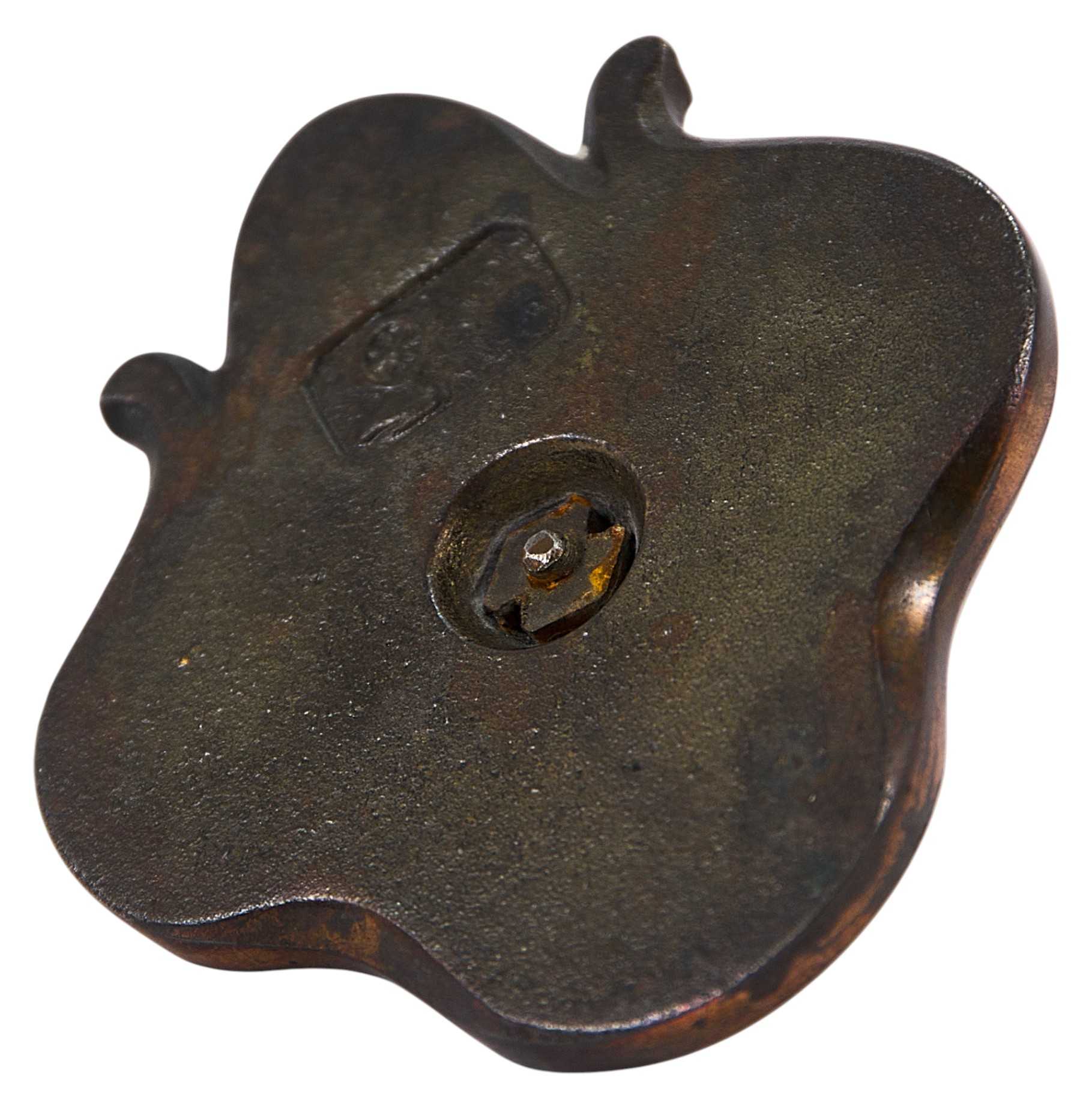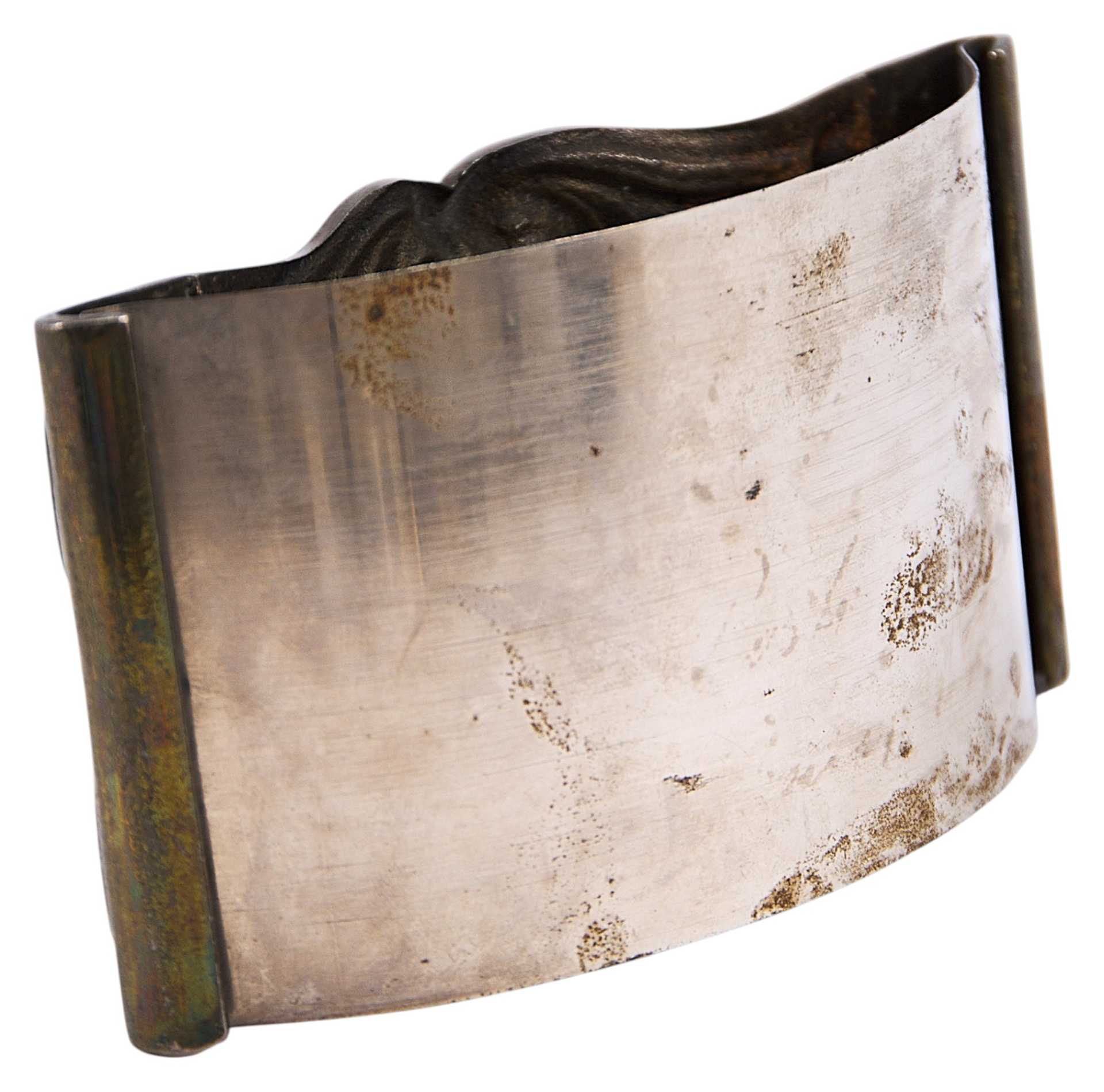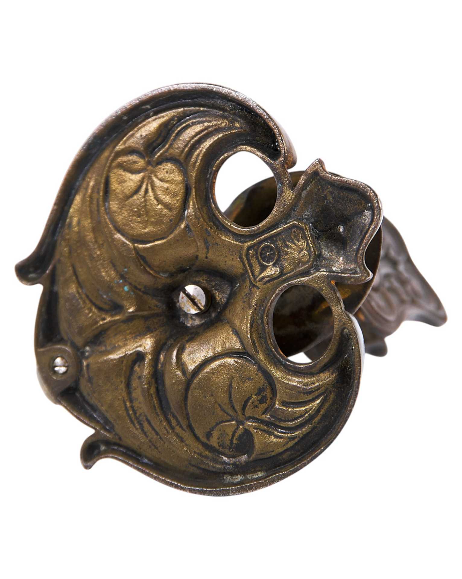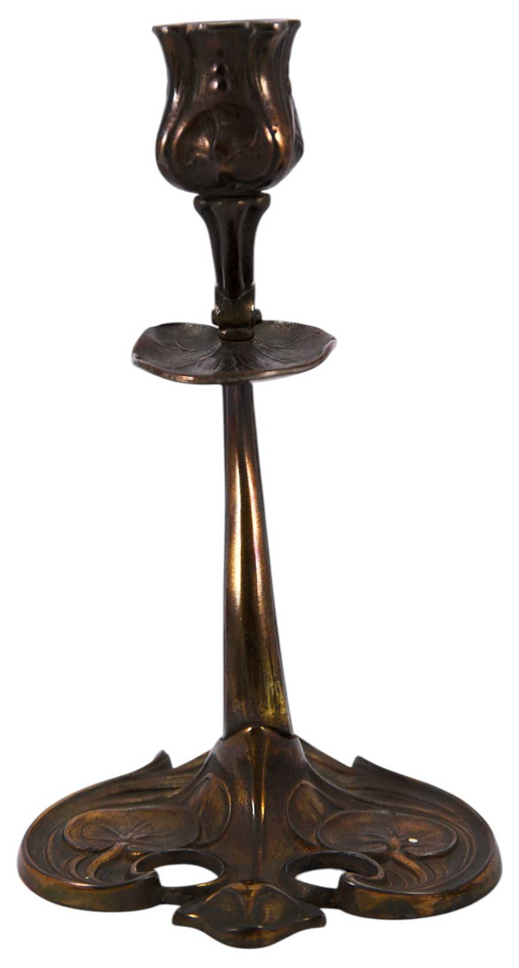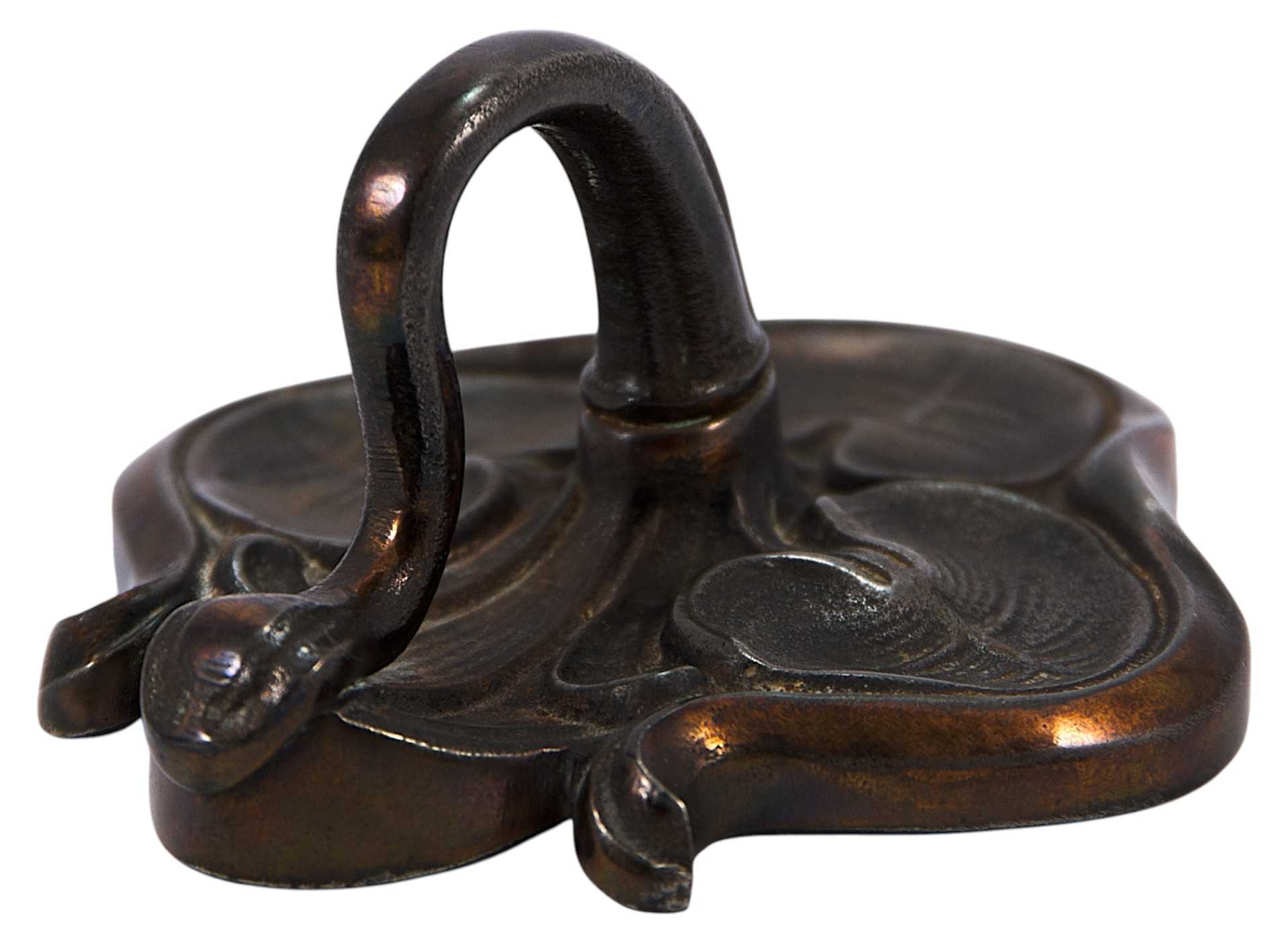 Письменный прибор состоит из девяти предметов: двух подсвечников - 21,8; 9,5 см., пепельницы - 3,8 см., пресс - бювара - 4,8 см., пресс - папье - 8,2 см., спичечницы - 13,6 см., чернильницы - 5,9 см, подставки под ручку - 1,8 см., подставки под бумагу — 12,2 см. Приборы имеют ажурные волнистые линии по борту и украшены рельефными листьями. Имеется клеймо в рамке: изображение солнце с лучами и птицы на колесе над инициалами «ДЖ».