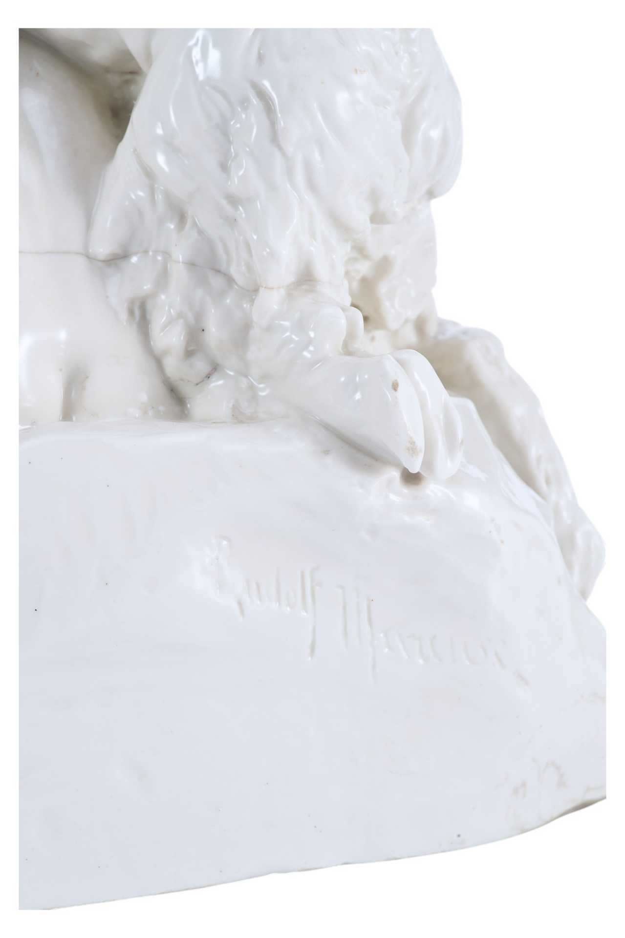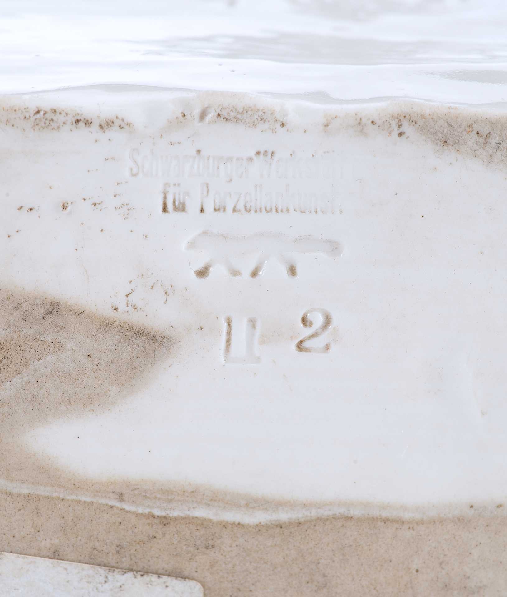 На основании клеймо фарфоровой фабрики Унтервайсбах ставившееся с 1908 поп 1938 гг.: «Schwarzburger Werkstätten fur Porzellankuns», изображение лисы, бегущей влево, серийные отметки. На основании подпись автора: «Rudolf Marcuse».