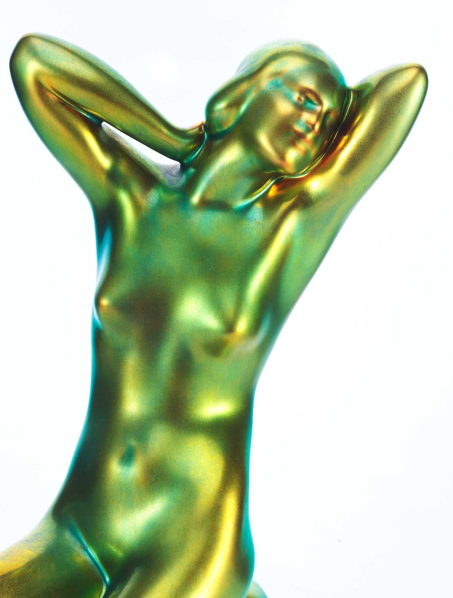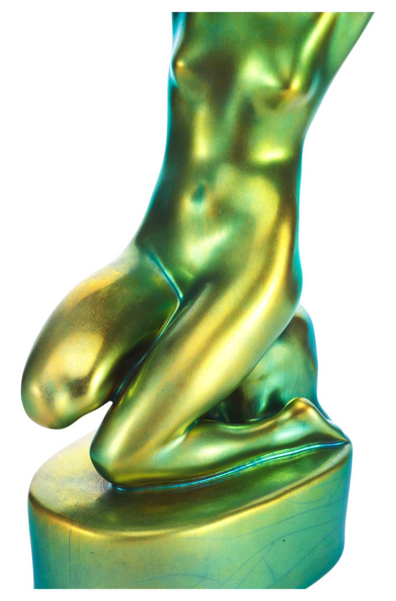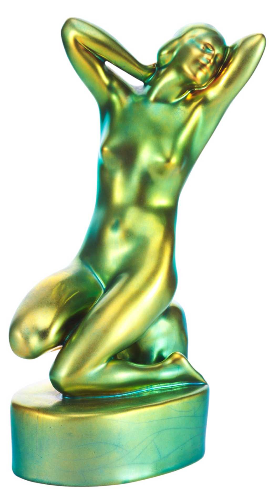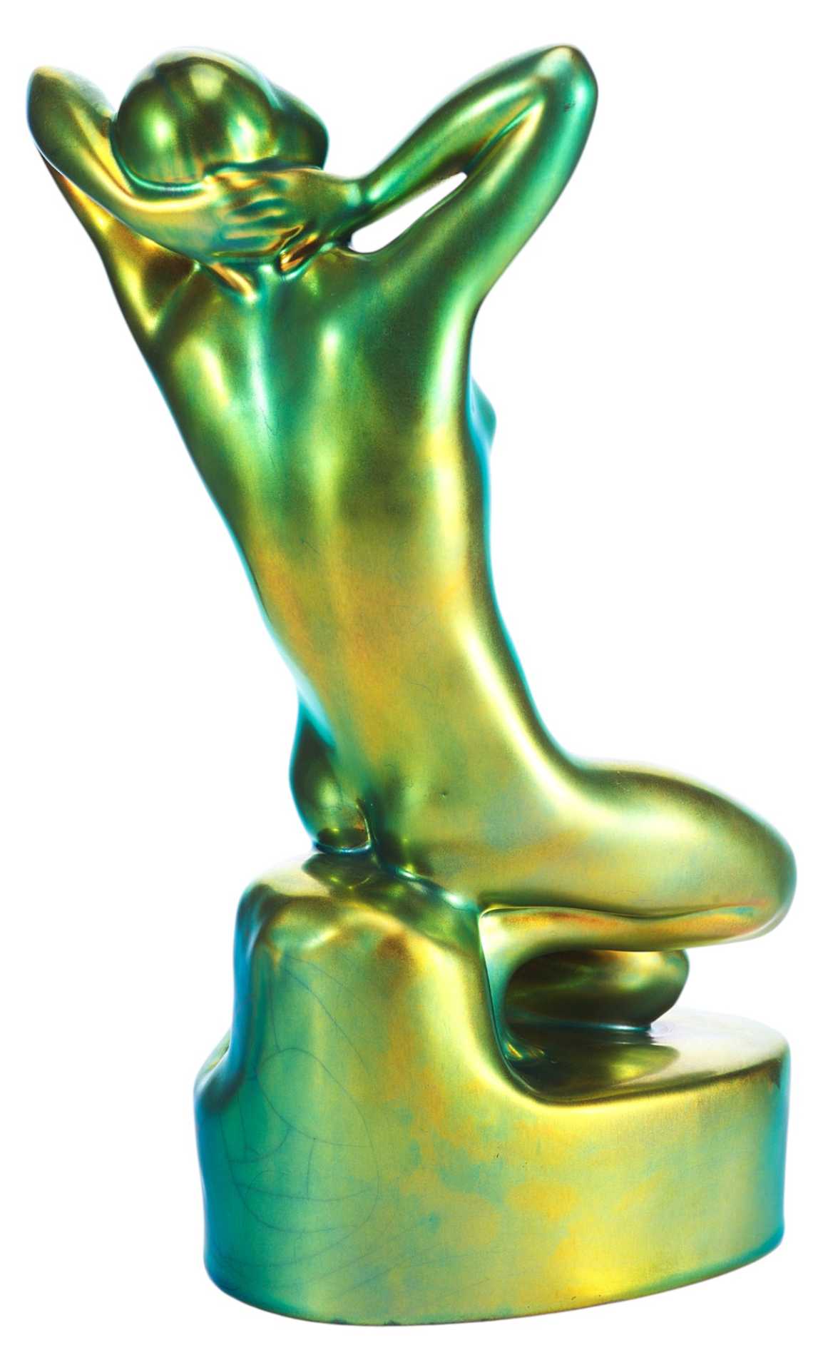 Фарфоровая скульптура обнаженной девушки. Поверхность фигуры покрыта эозином, от чего она имеет металлический зеленоватый оттенок.