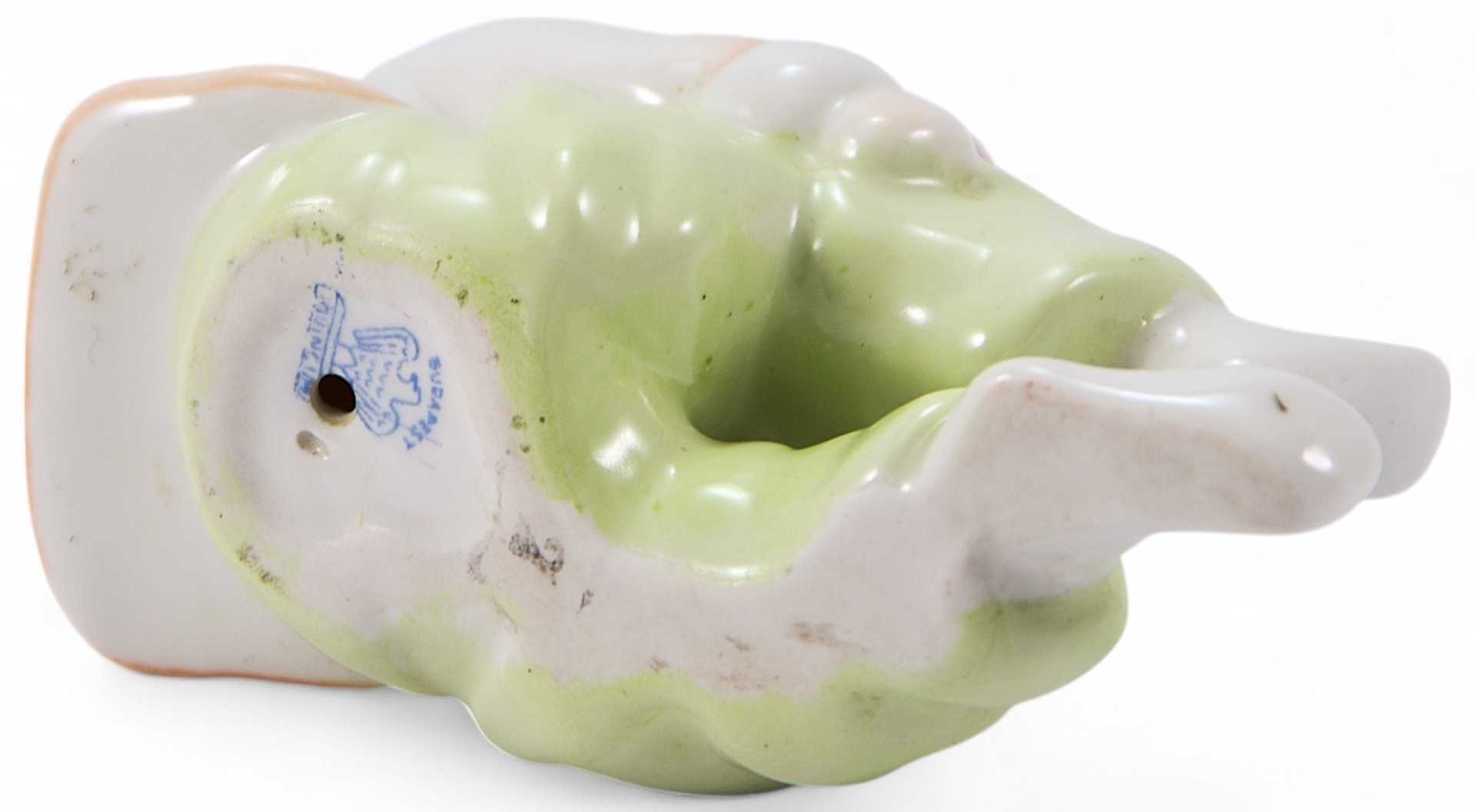 скульптура сидящей девочки поправляющей свои штаны. На основании клеймо фарфоровой фабрики Акуинкум (Aquincum) использующееся с середины XX в. - изображение орла сидящего на плите с названием фабрики-производителя, над ним