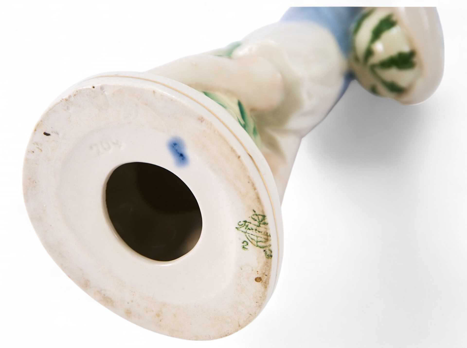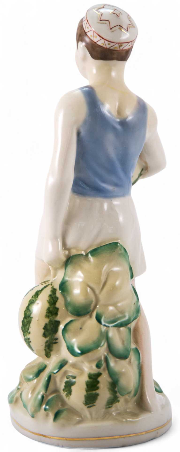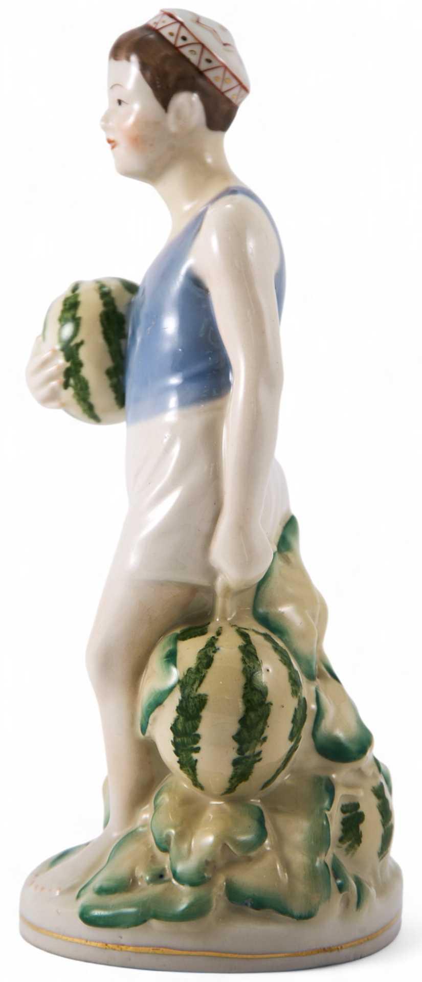 На дне статуэтки присутствует клеймо Городницкого фарфорового завода, ставившееся на изделиях в период с 1955 по 1959 гг. Скульптура «Мальчик с арбузами» из серии «Счастливое детство» показывает традиционно-советский образ юного мальчика-узбека в легкой одежде и характерной тюбетейке, идущего по бахче с радостным воодушевленным лицом и несущего арбуз. Легкое и веселое настроение композиции передано удачно. Статуэтка украшена золочением. Клеймо подлинное. Его наличие, а также стилистические особенности скульптуры позволяют сделать вывод, что предмет был