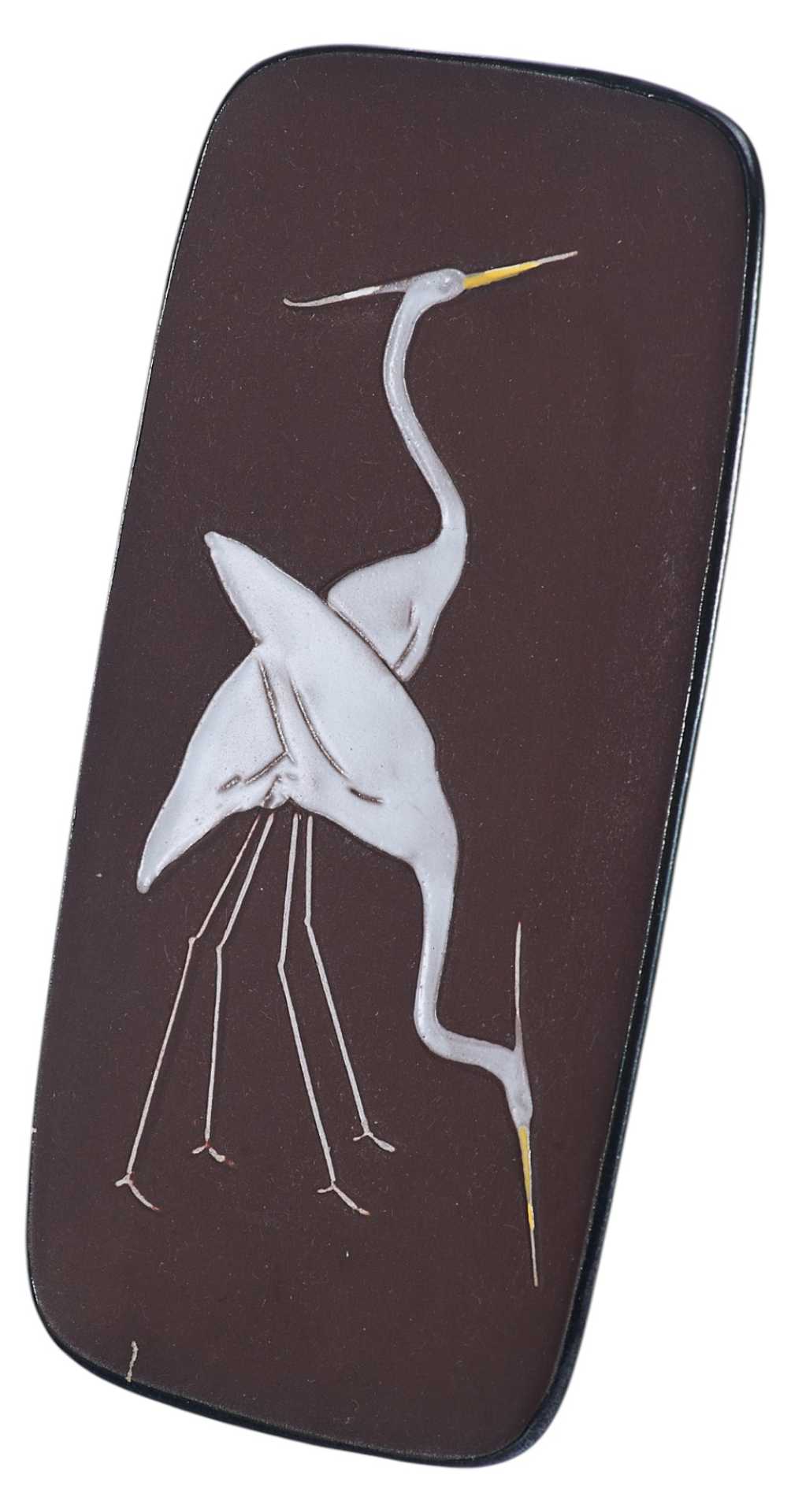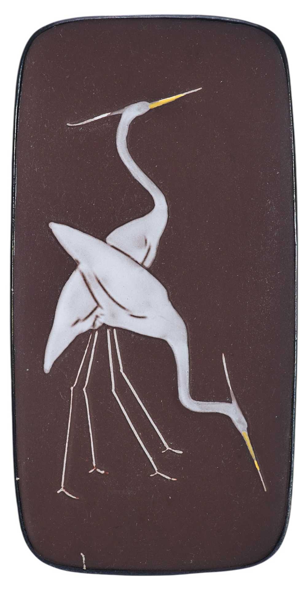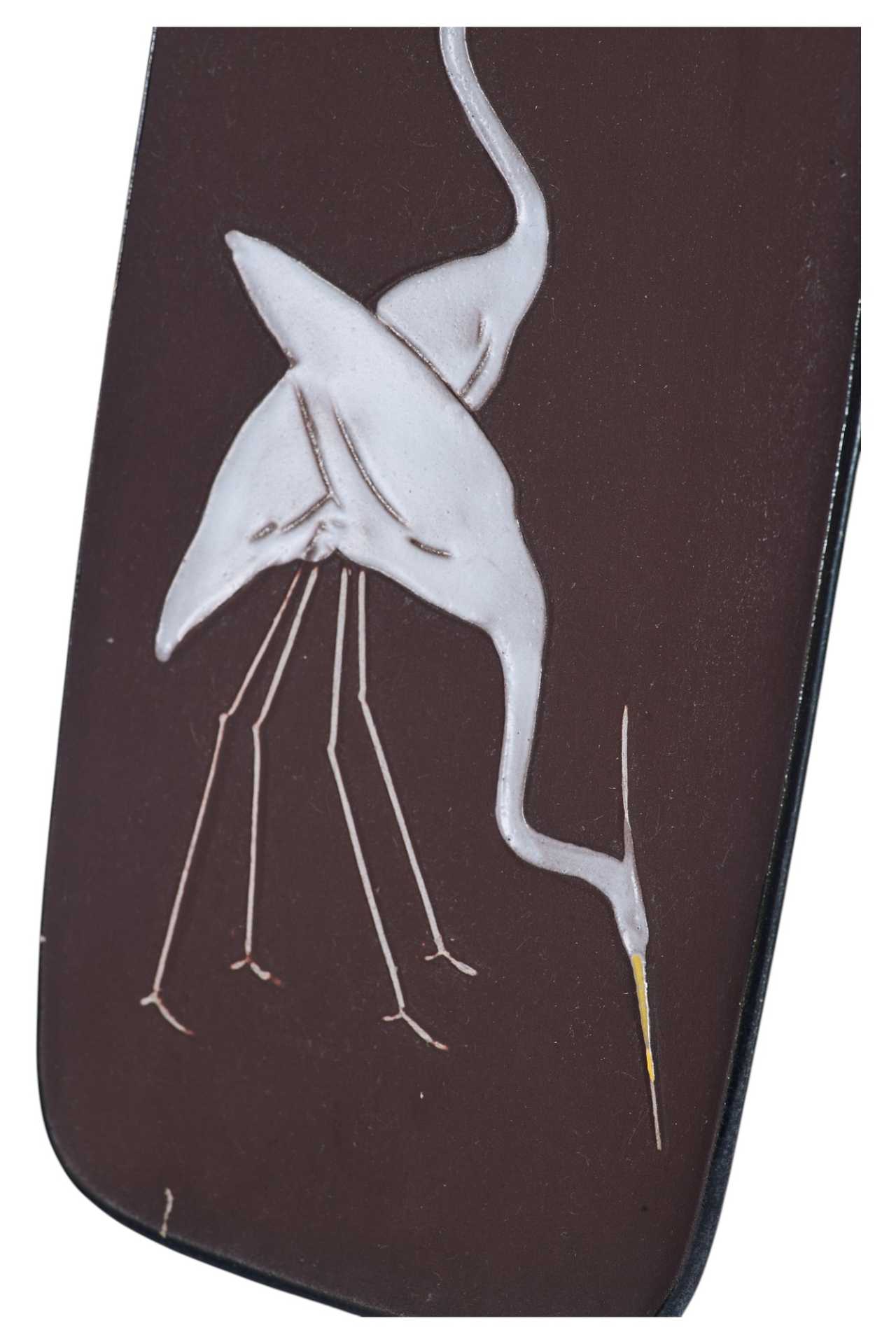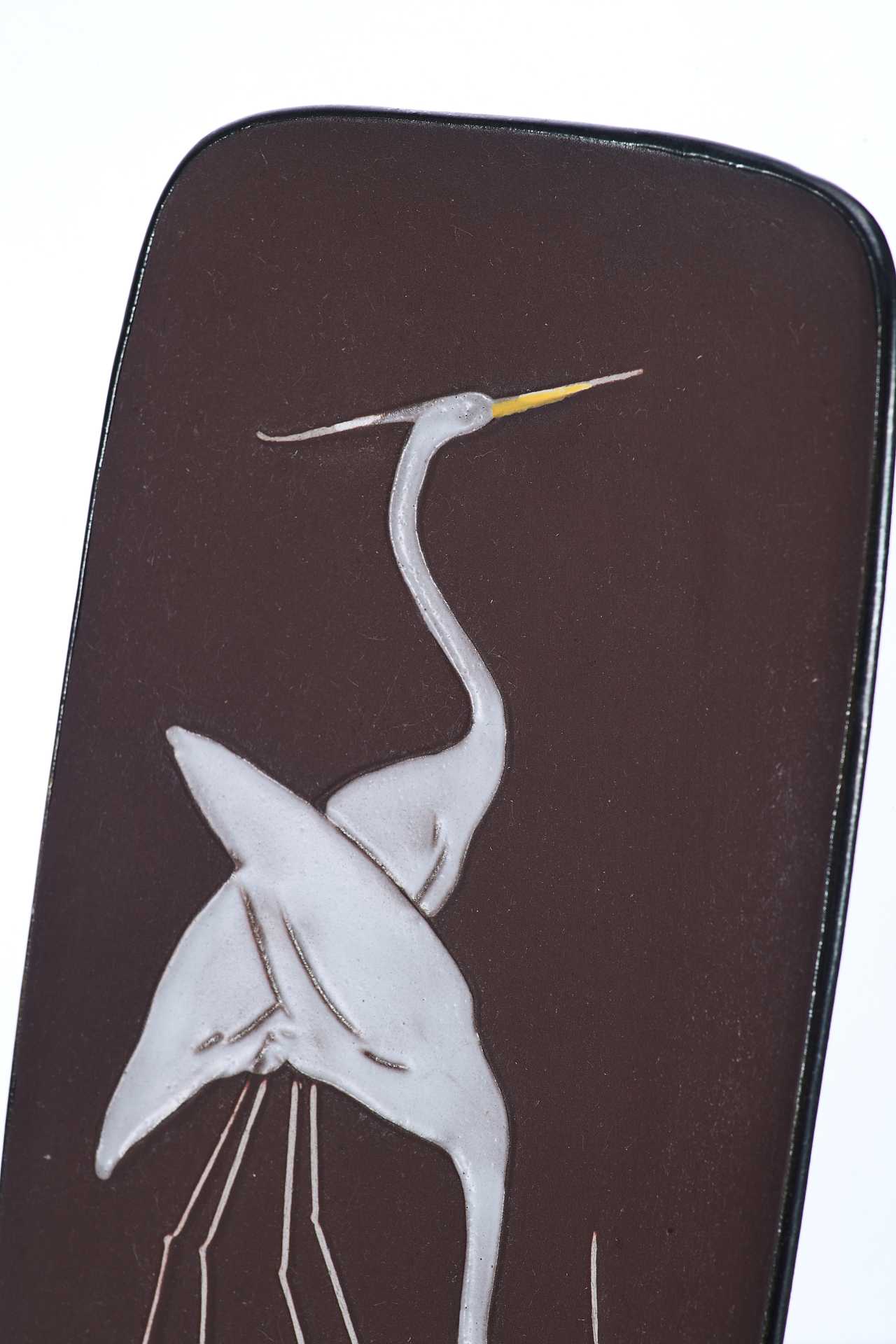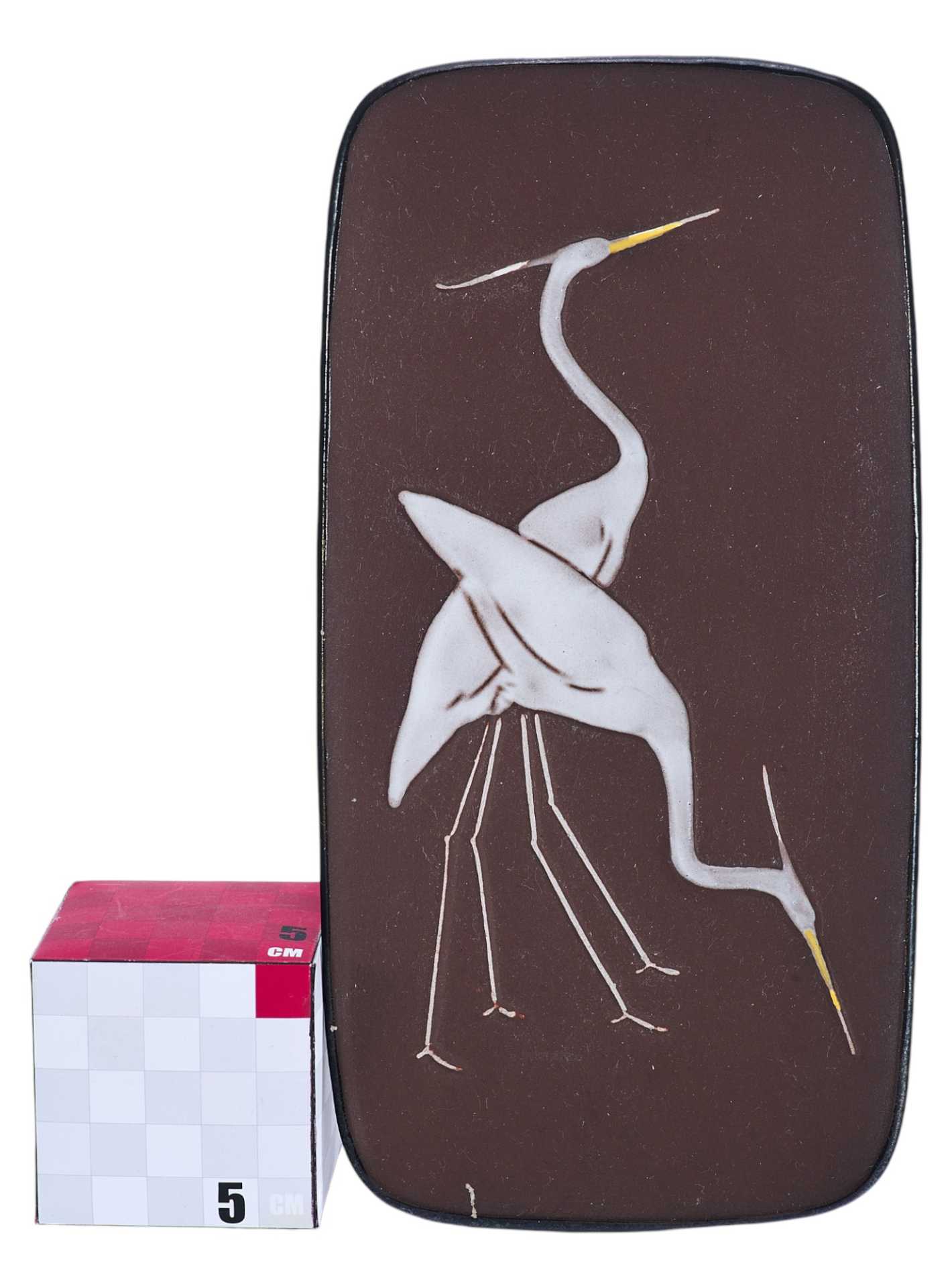 Панно имеет форму вытянутого прямоугольника со скругленными краями. На темном. фоне изображены две изящные цапли. Они стоят рядом, одна держит голову прямо, а другая наклонилась и что-то клюёт. У птиц длинные изогнутые шеи, тонкие острые клювы и ноги, похожие на тростинки.