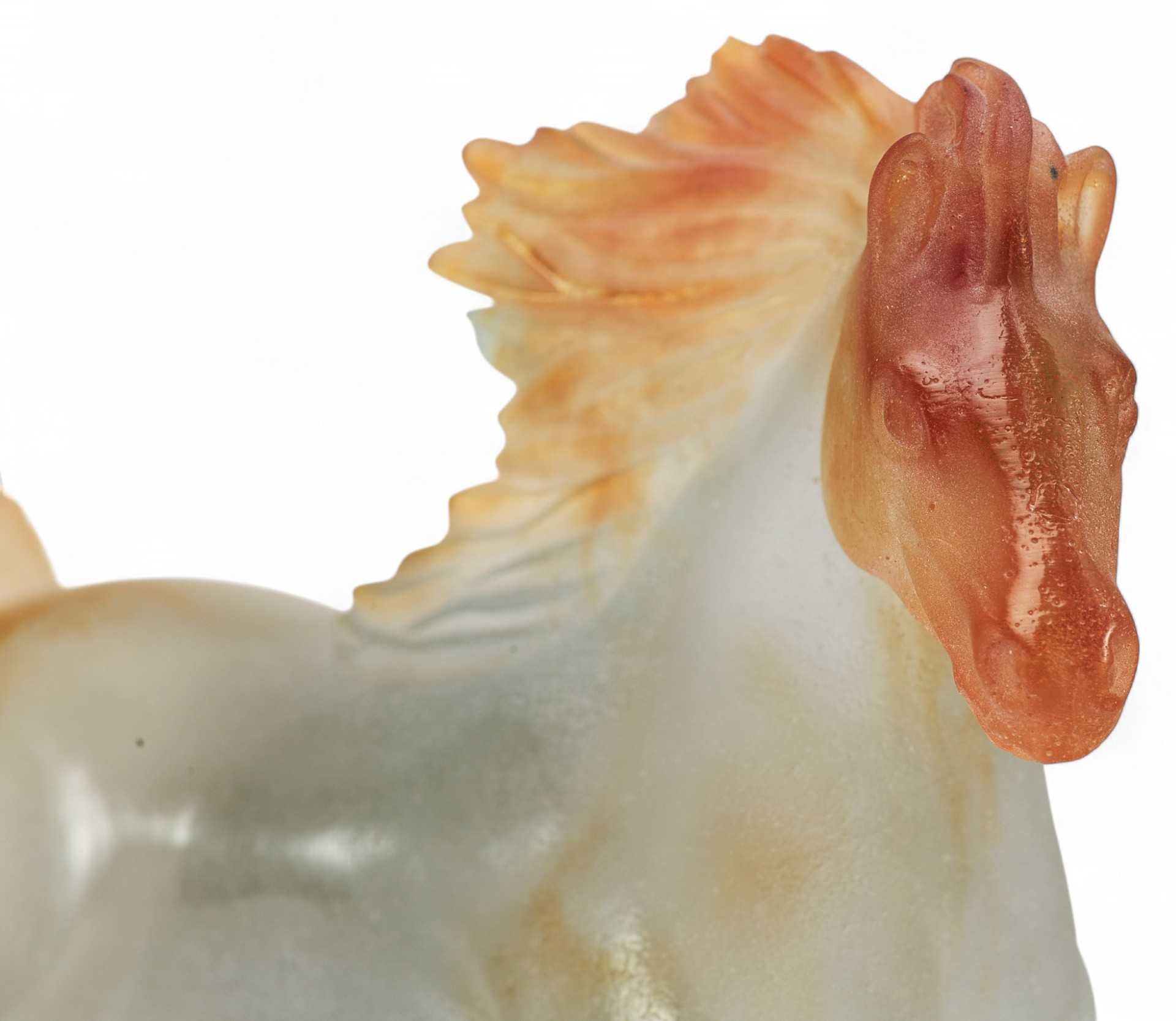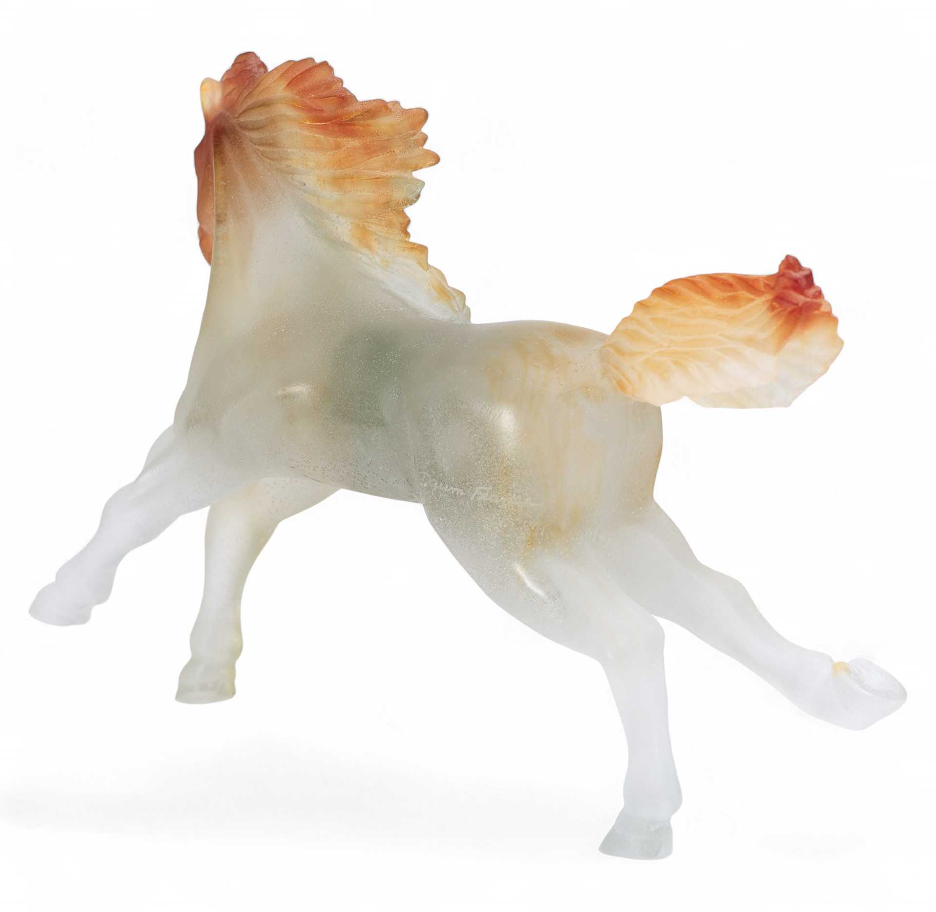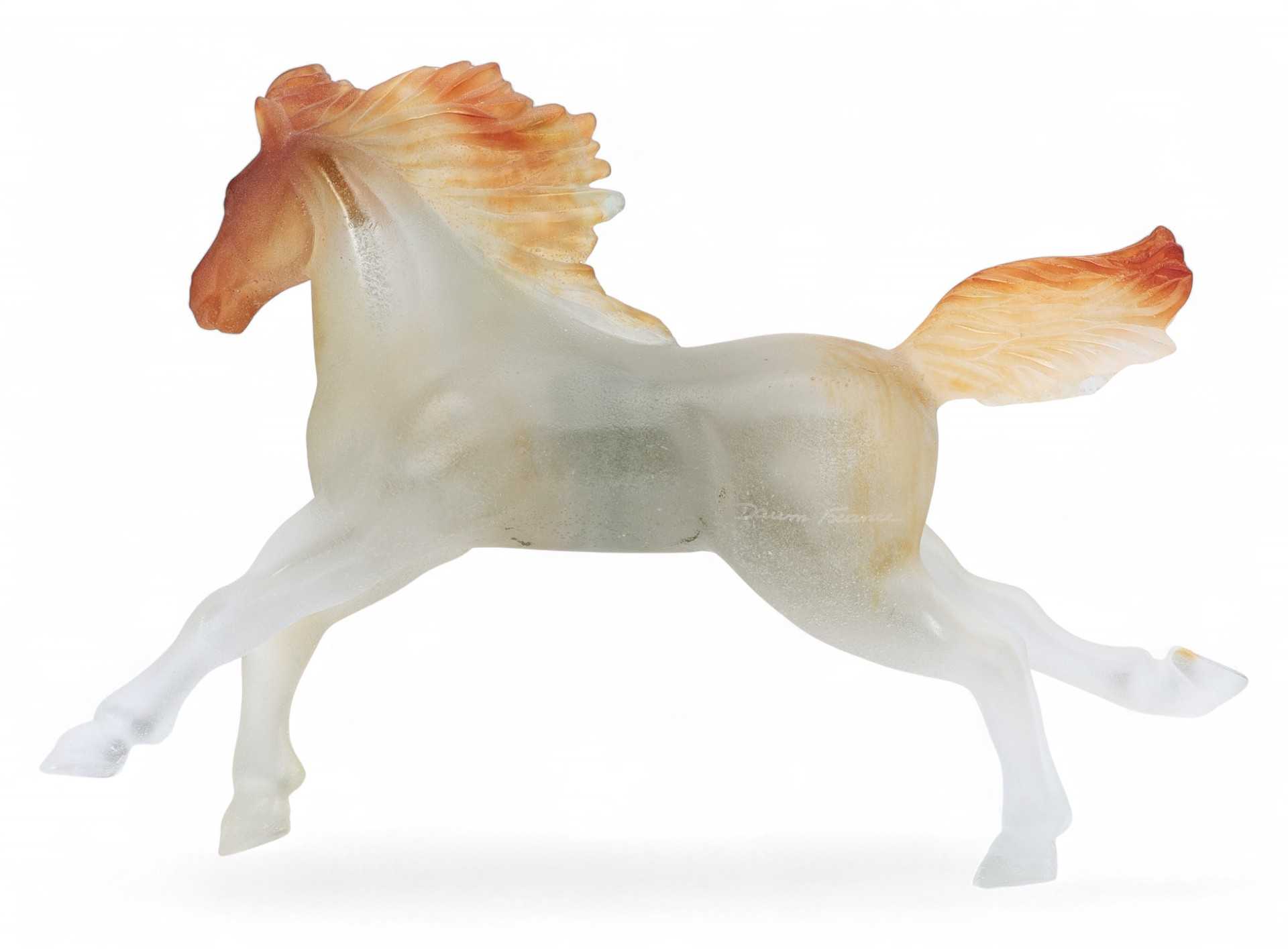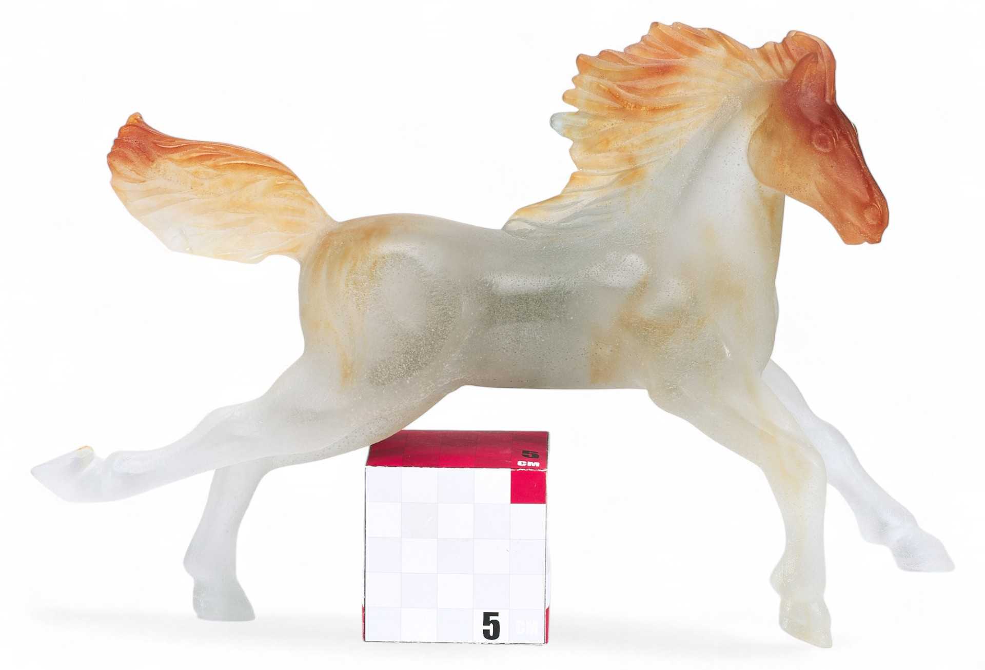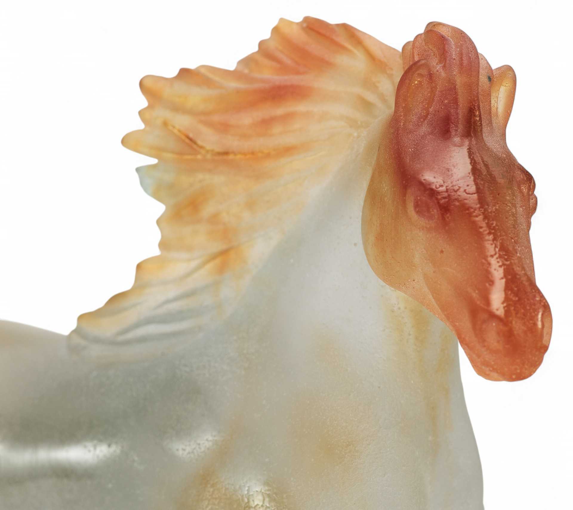 Скульптура из цветного стекла, в виде скачущего коня. Голова, грива и хвост животного окрашены в ярко оранжевый оттенок. Поверхность стекла матирована, из чего следует заключить, что фигура сделана в технике «pate-de-verre». На скульптуре выгравирована подпись: «Daum France».