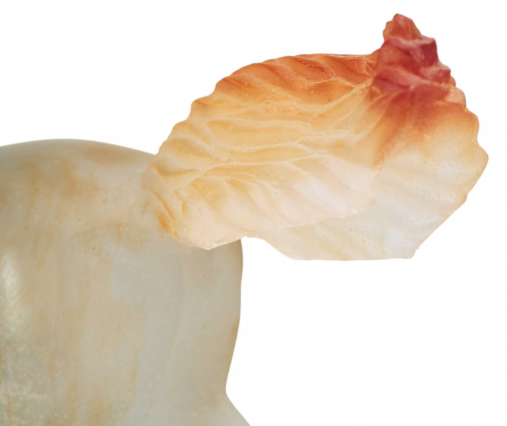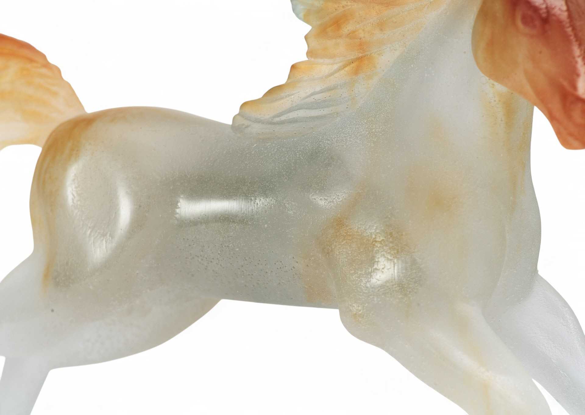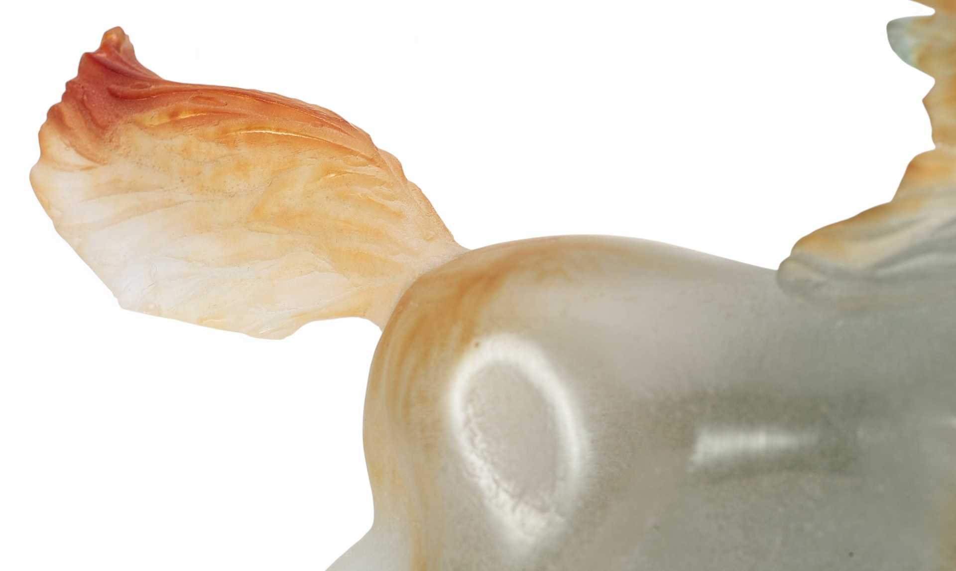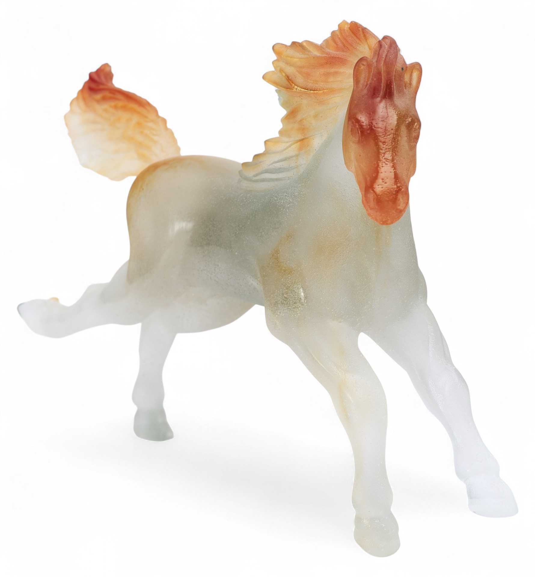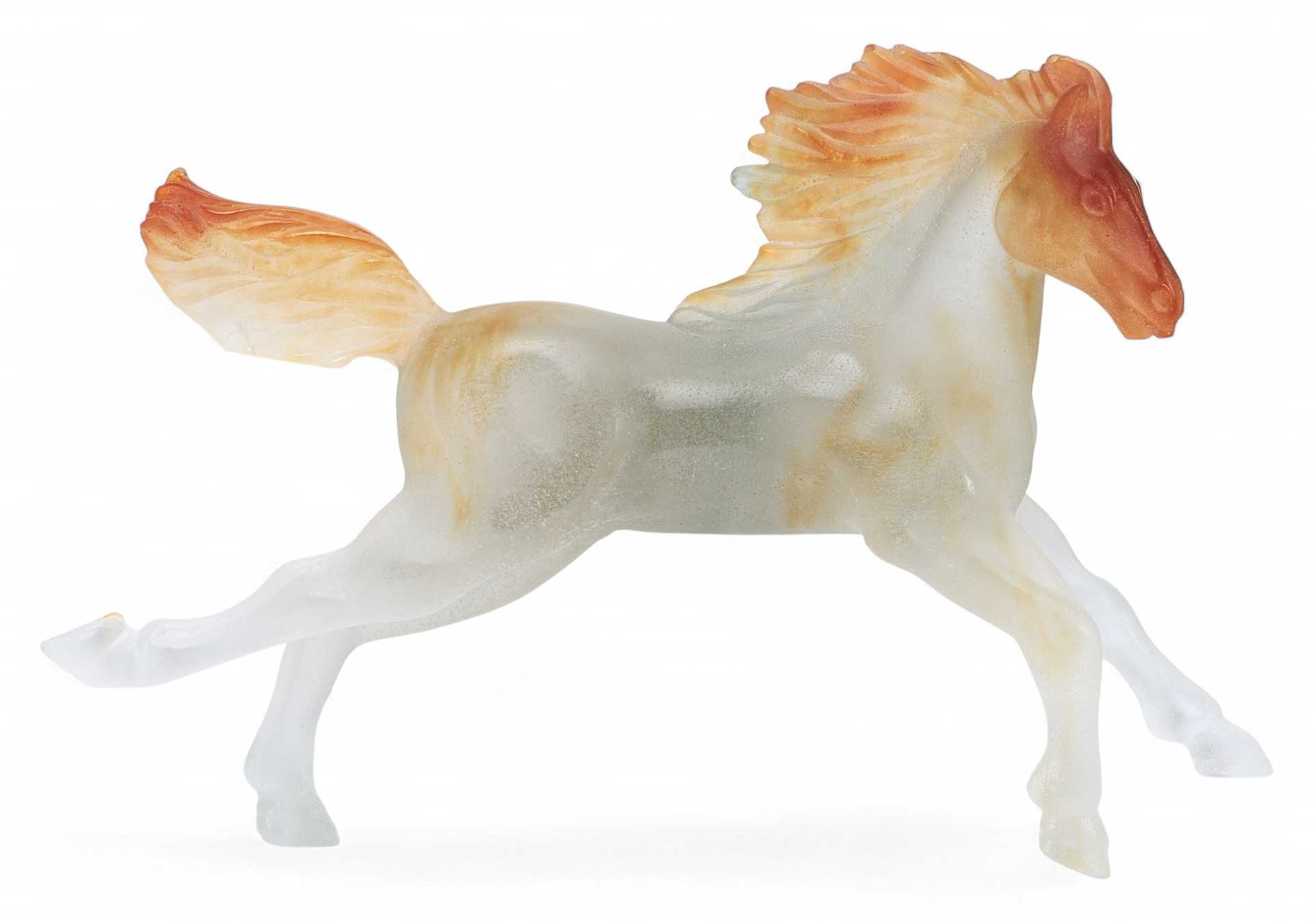 Скульптура из цветного стекла, в виде скачущего коня. Голова, грива и хвост животного окрашены в ярко оранжевый оттенок. Поверхность стекла матирована, из чего следует заключить, что фигура сделана в технике «pate-de-verre». На скульптуре выгравирована подпись: «Daum France».
