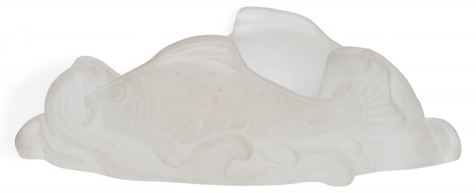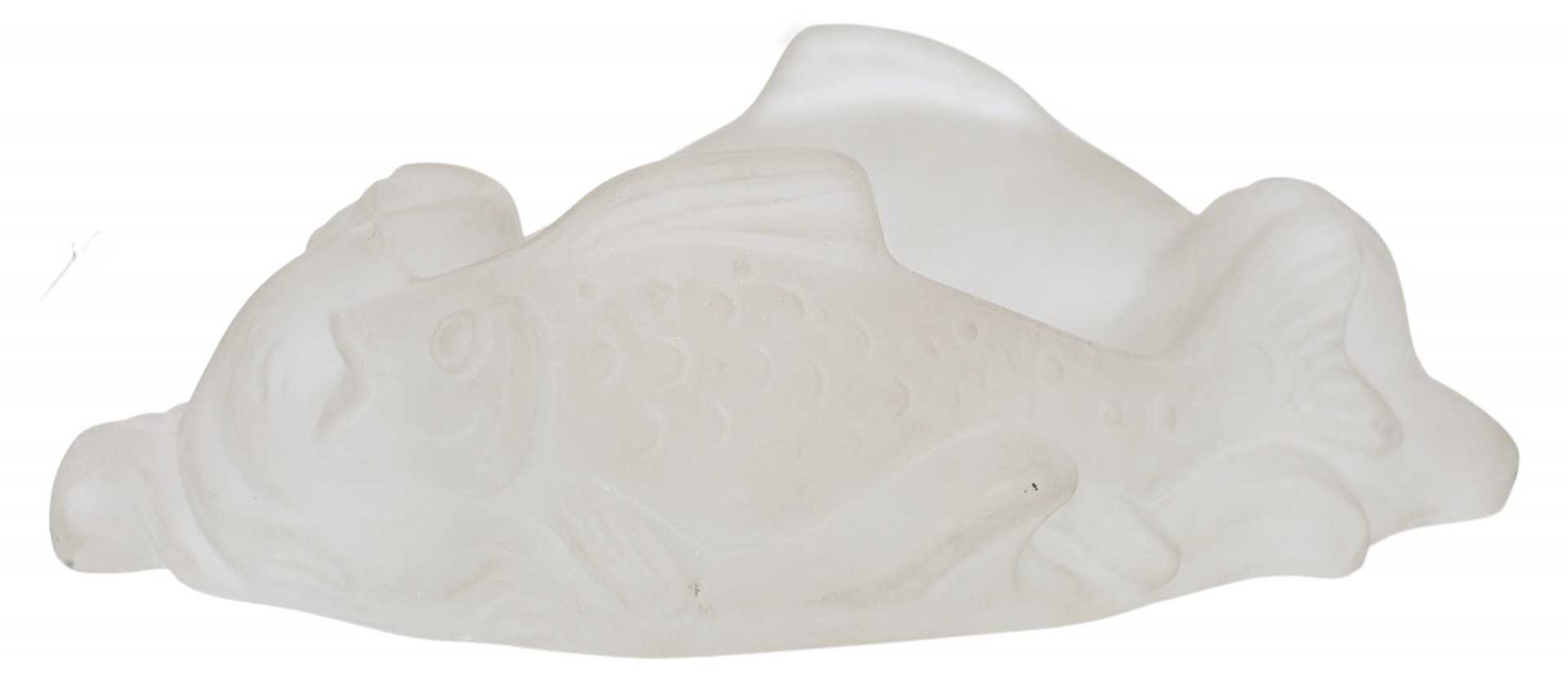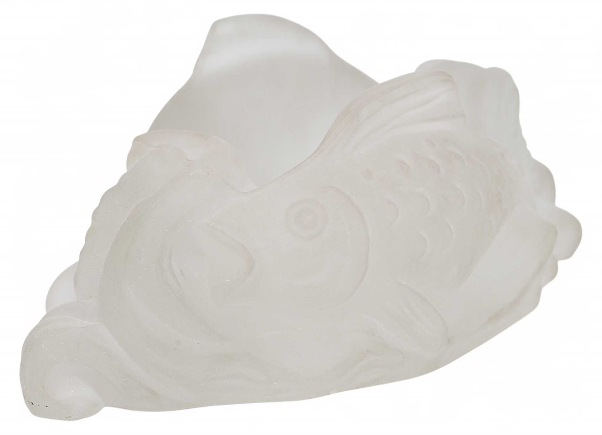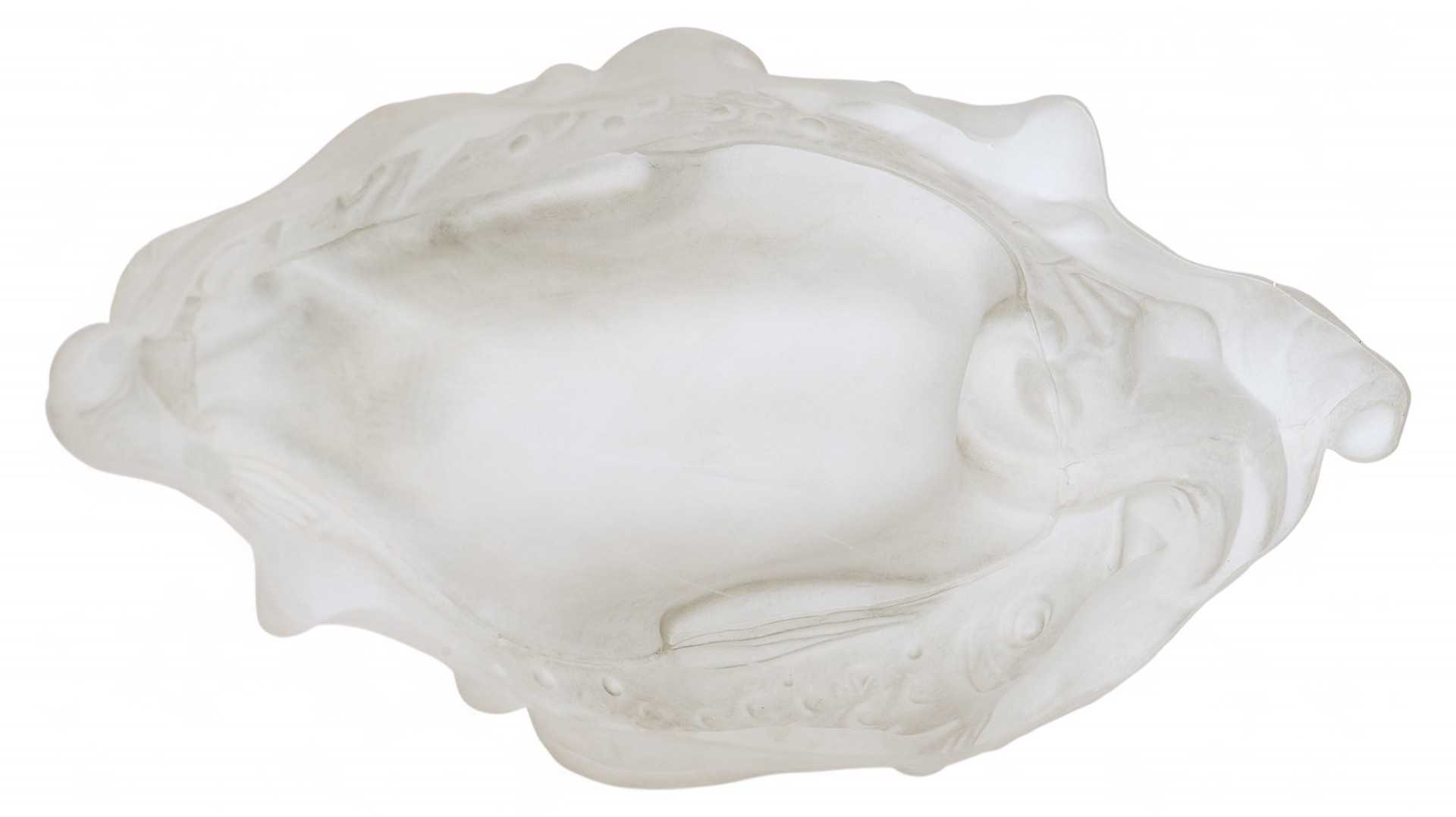 Ваза овальной формы, декорирована рельефным изображением волн и двух морских рыб. На внутренней (оборотной) стороне подставки клеймо фабрики Рене Лалика — “R. Lalique”. Клеймо подлинное.