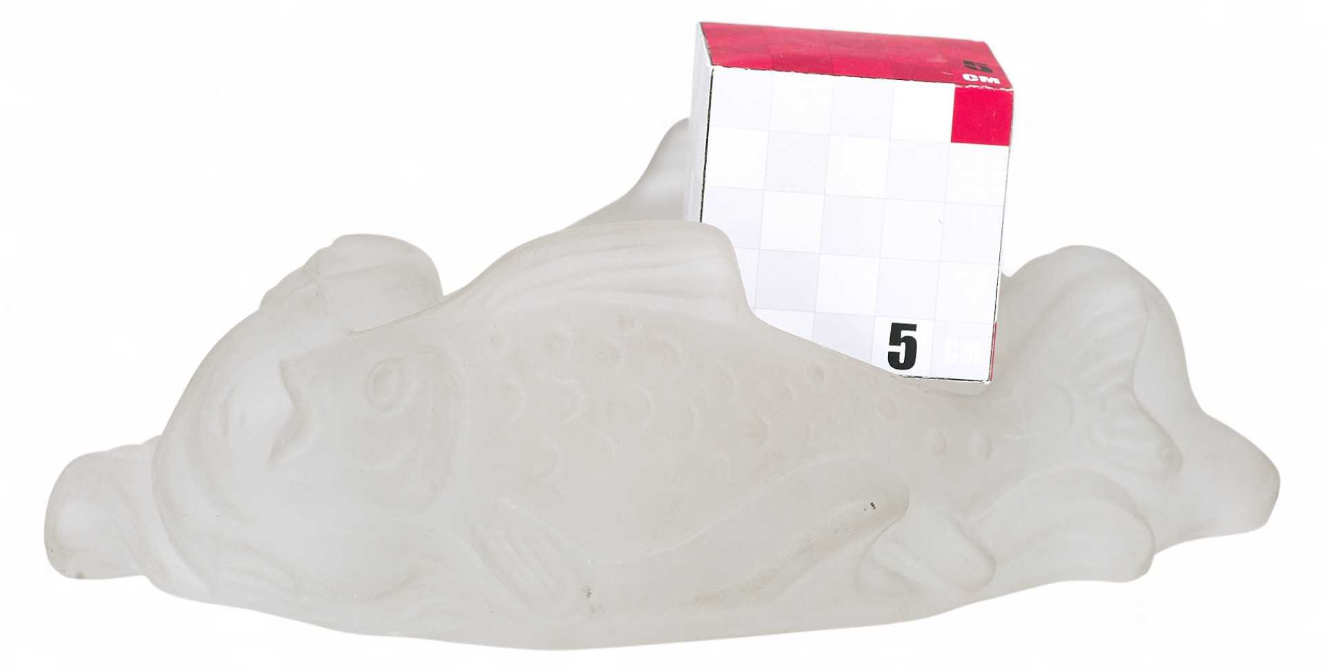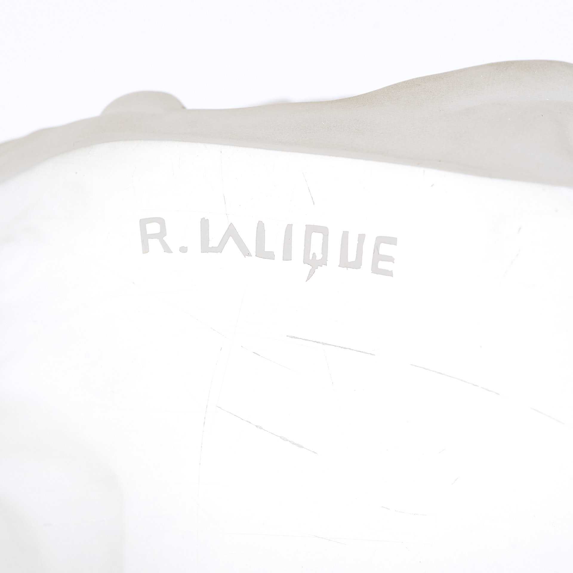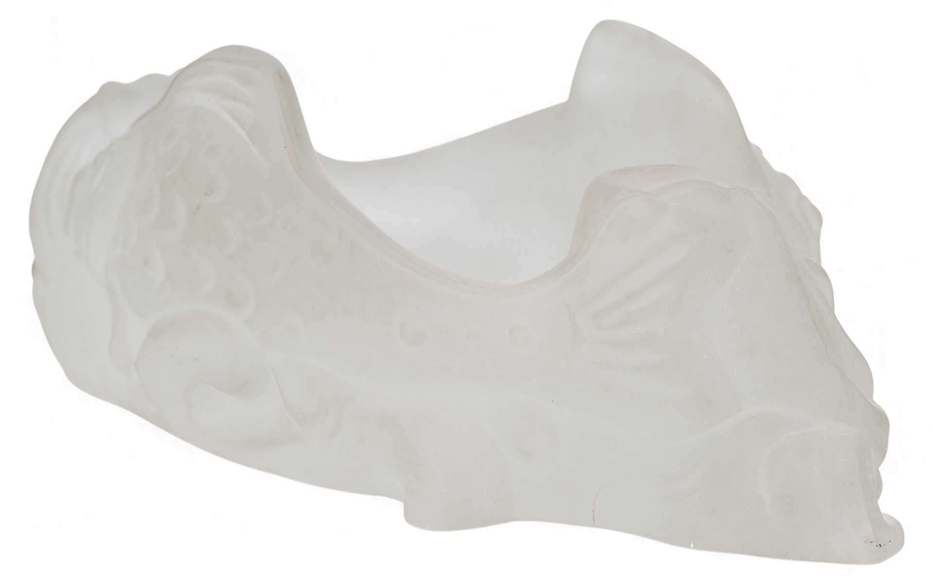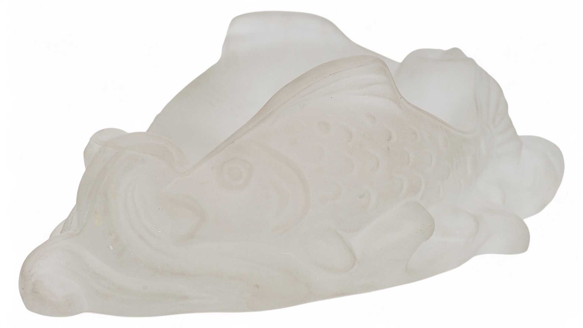 Ваза овальной формы, декорирована рельефным изображением волн и двух морских рыб. На внутренней (оборотной) стороне подставки клеймо фабрики Рене Лалика — “R. Lalique”. Клеймо подлинное.