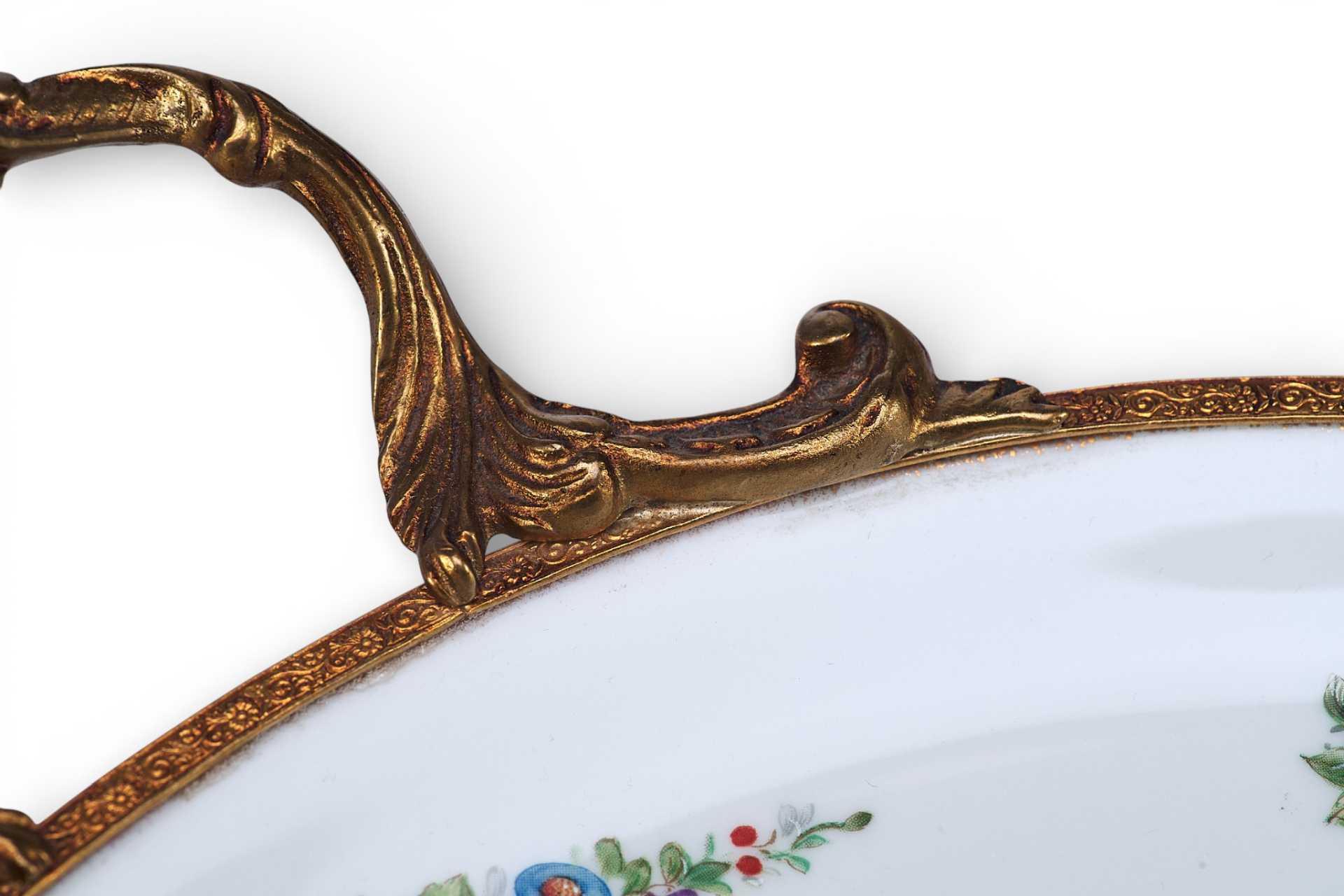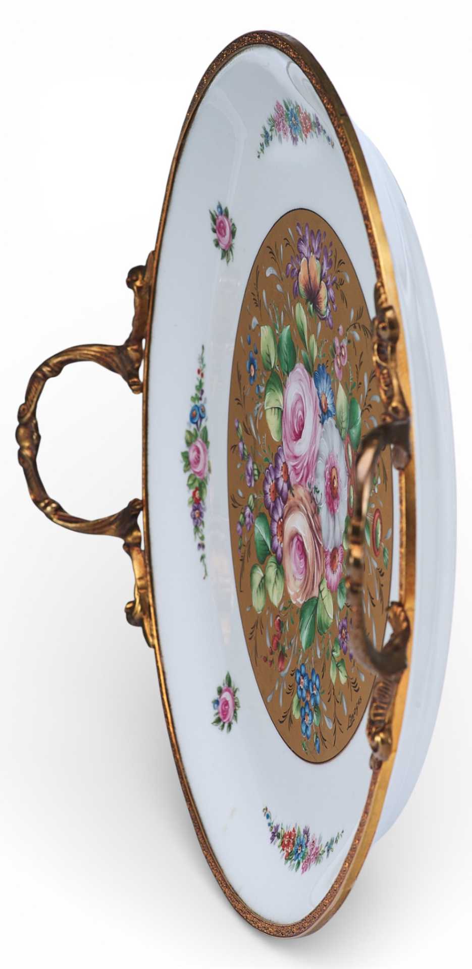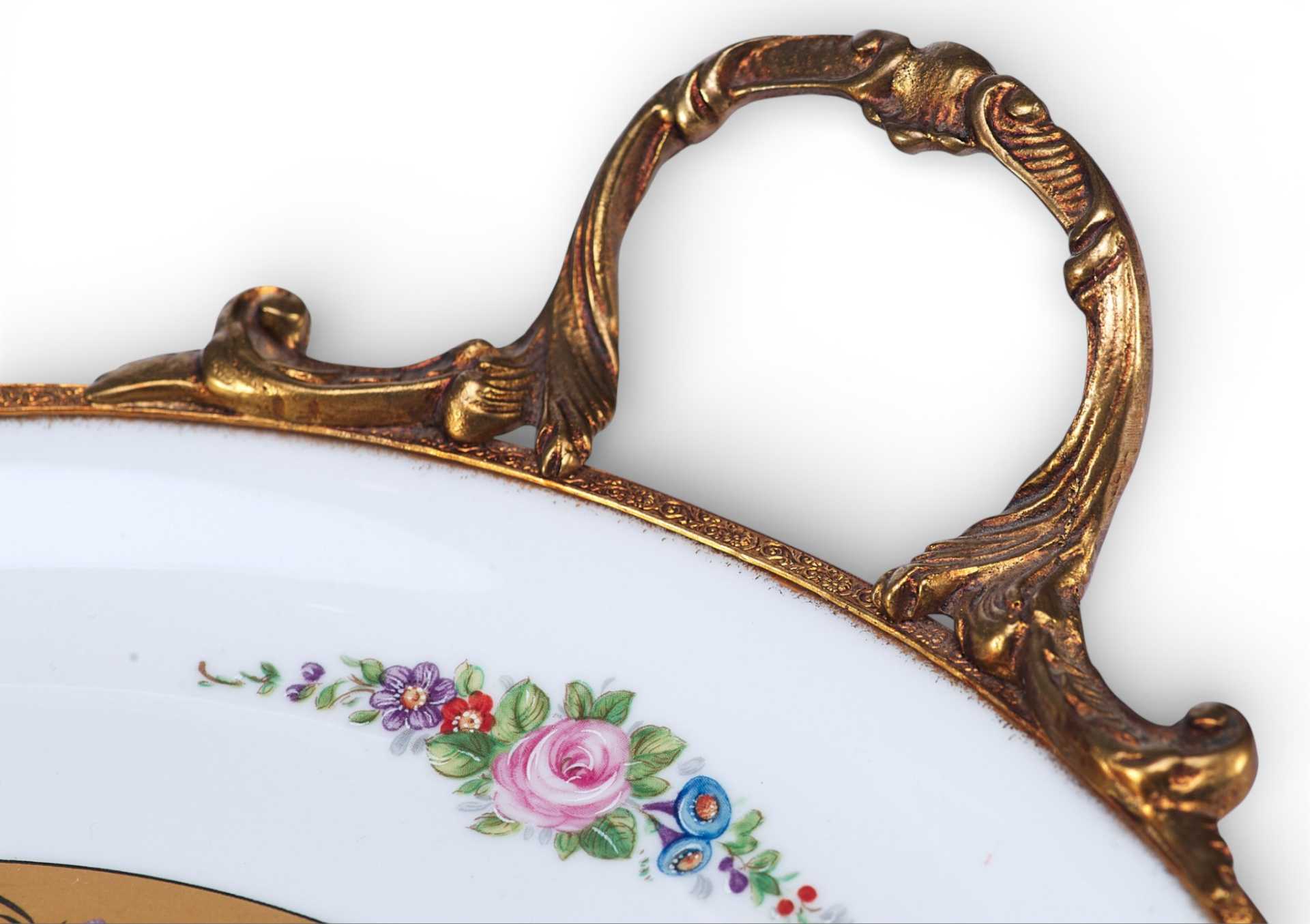 Фарфоровый декоративный.поднос, состоящий из: фарфорового блюда, украшенного цветочными гирляндами и букетами, и бронзового обрамления с изящными ручками. Художественное оформление выполнено в стилистике неостилей (свойственных для стиля Эклектики), характерных для продукции Севра периода второй половины — конца XIX в.