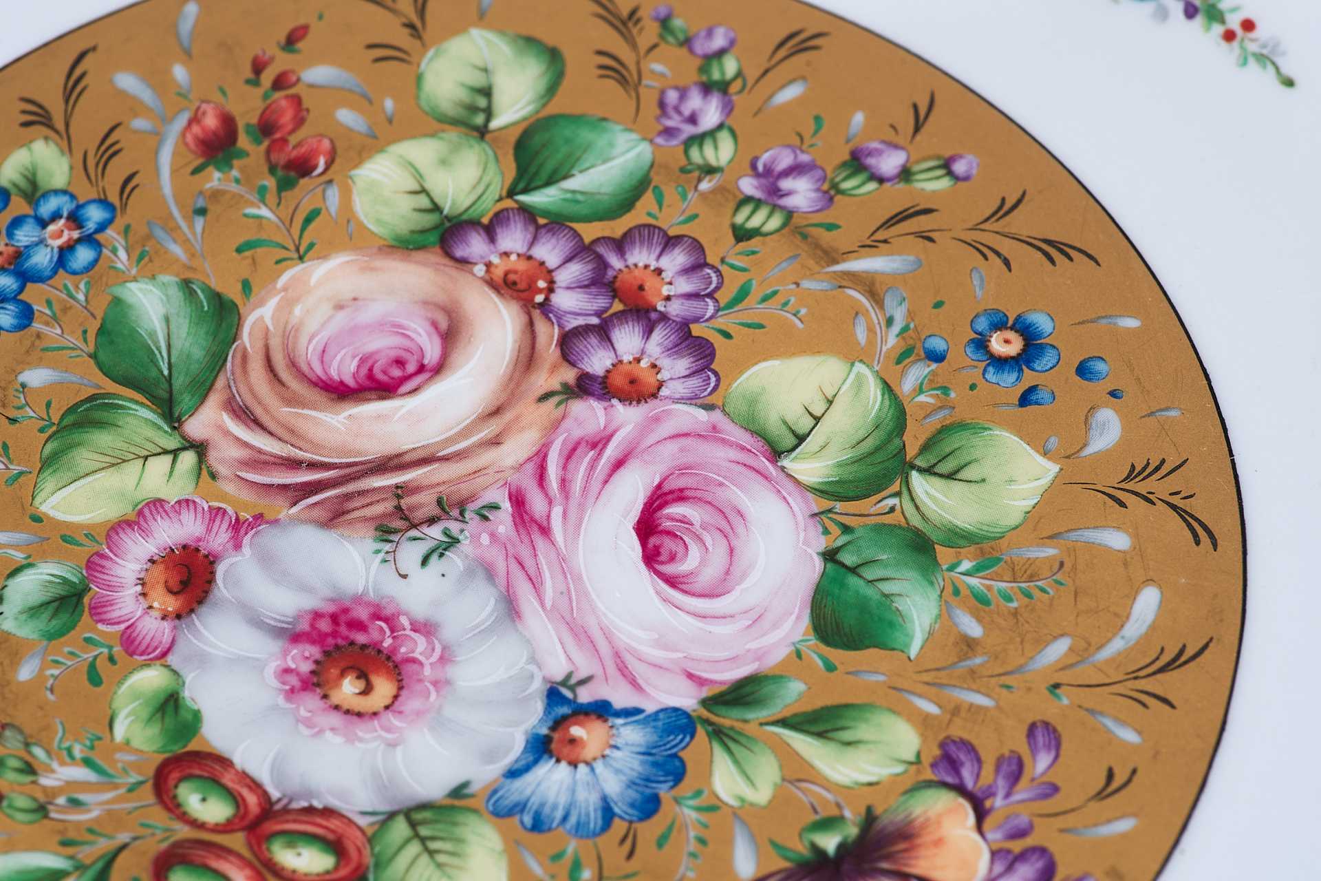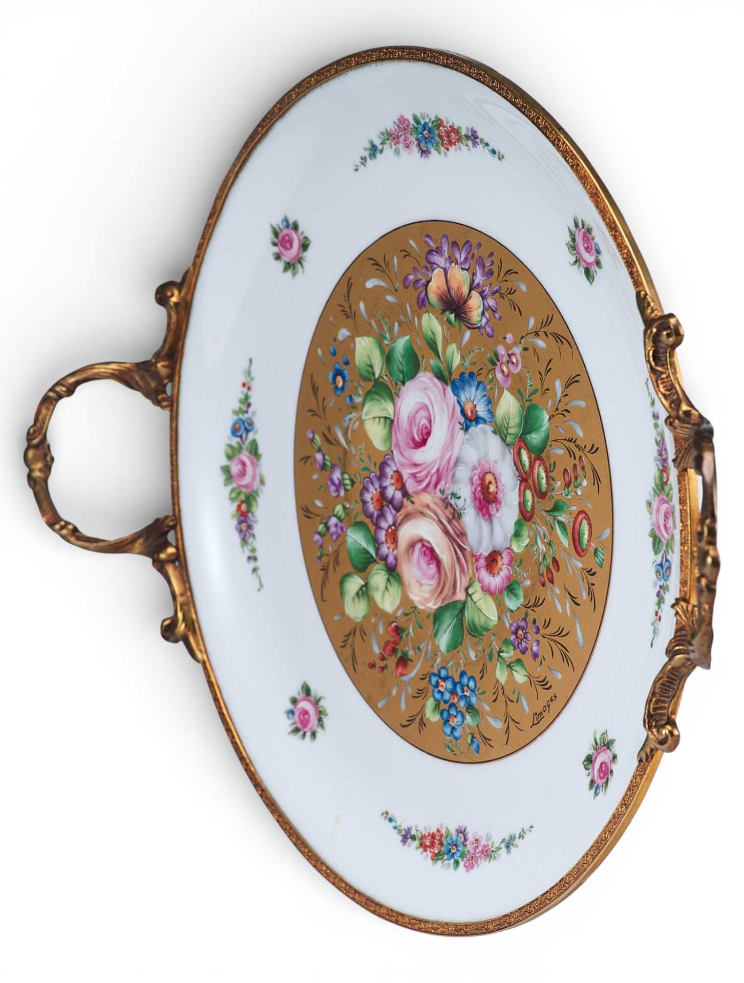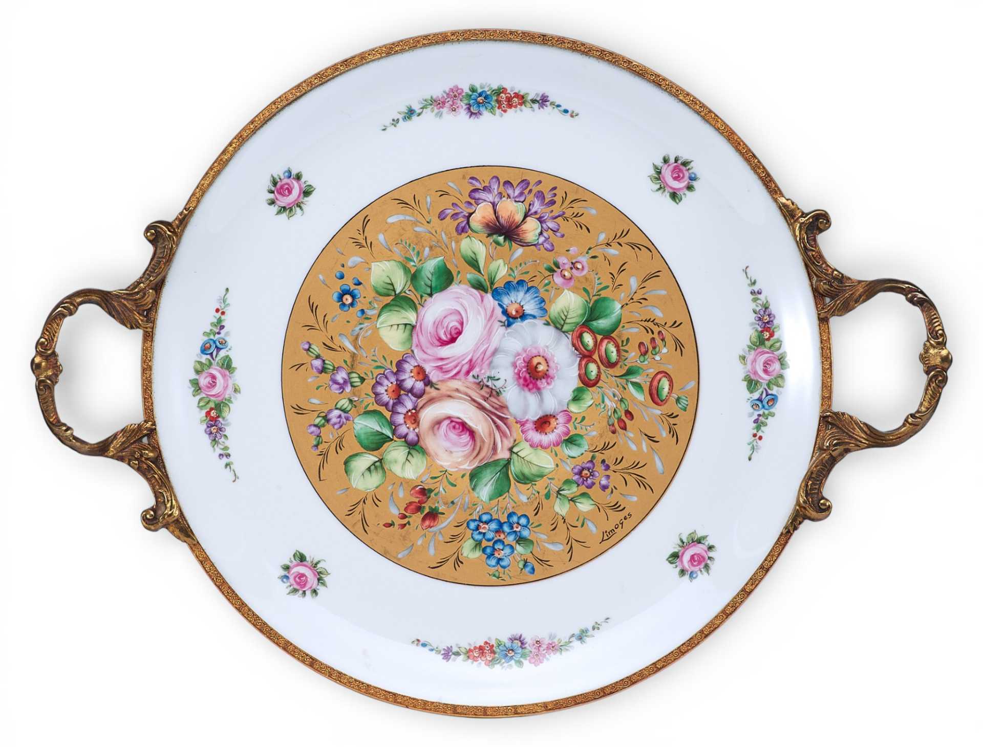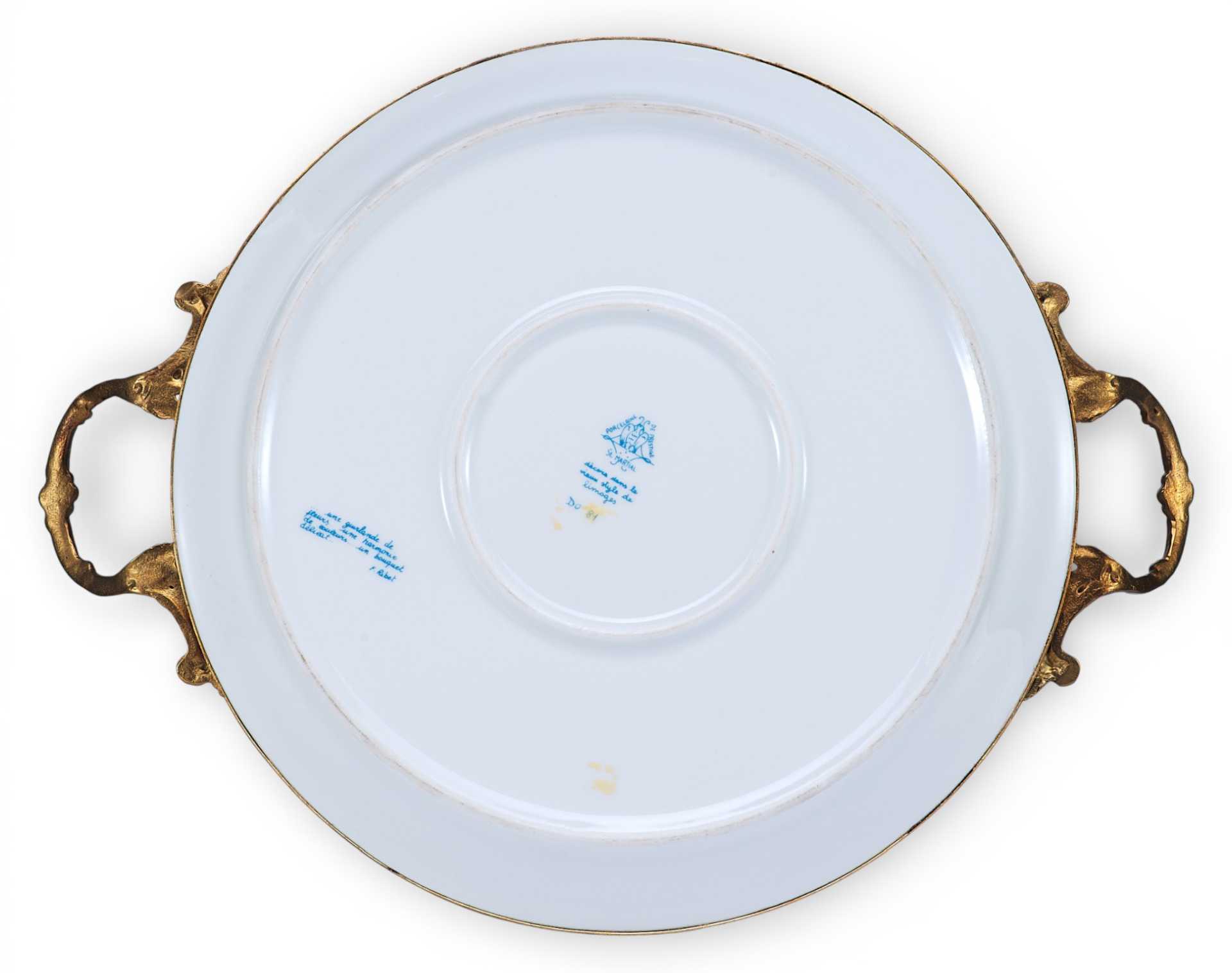 Фарфоровый декоративный.поднос, состоящий из: фарфорового блюда, украшенного цветочными гирляндами и букетами, и бронзового обрамления с изящными ручками. Художественное оформление выполнено в стилистике неостилей (свойственных для стиля Эклектики), характерных для продукции Севра периода второй половины — конца XIX в.