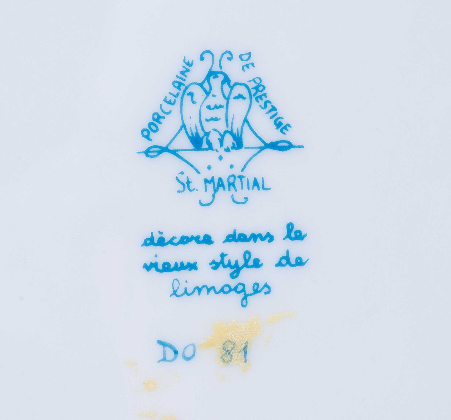 На фарфоровом блюде имеются клейма: 1. Стилизованное изображение клейма Севрской фарфоровой мануфактуры в виде сидящего орла. Надпись: «рогсеіаіпе de prestige st. Martial». Ниже надпись: Decors dans le vieux style de Limoges», серийные номера продукции.