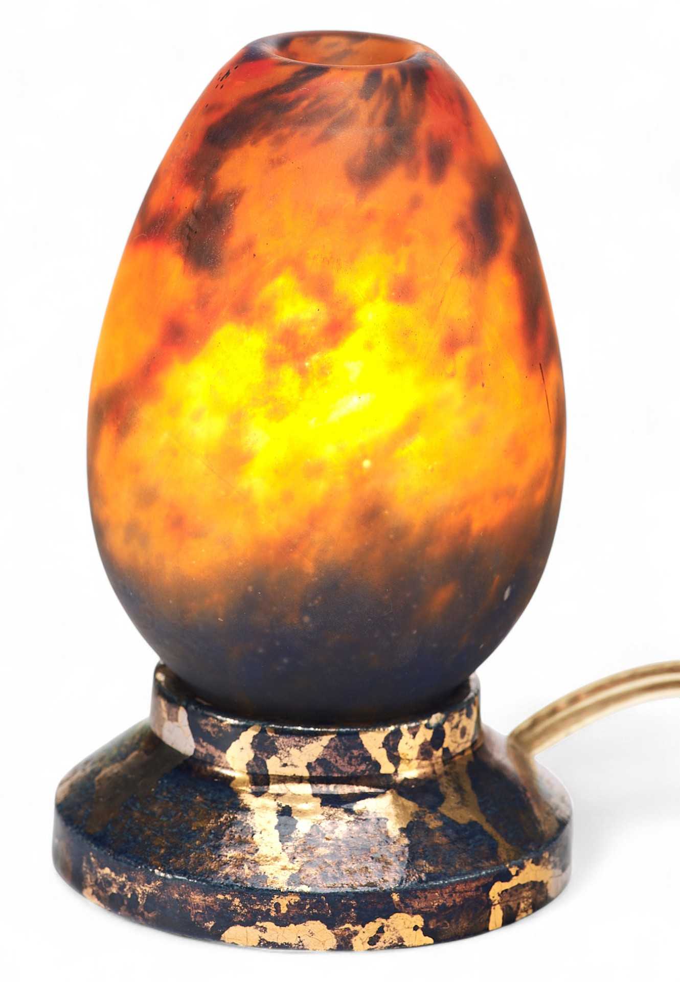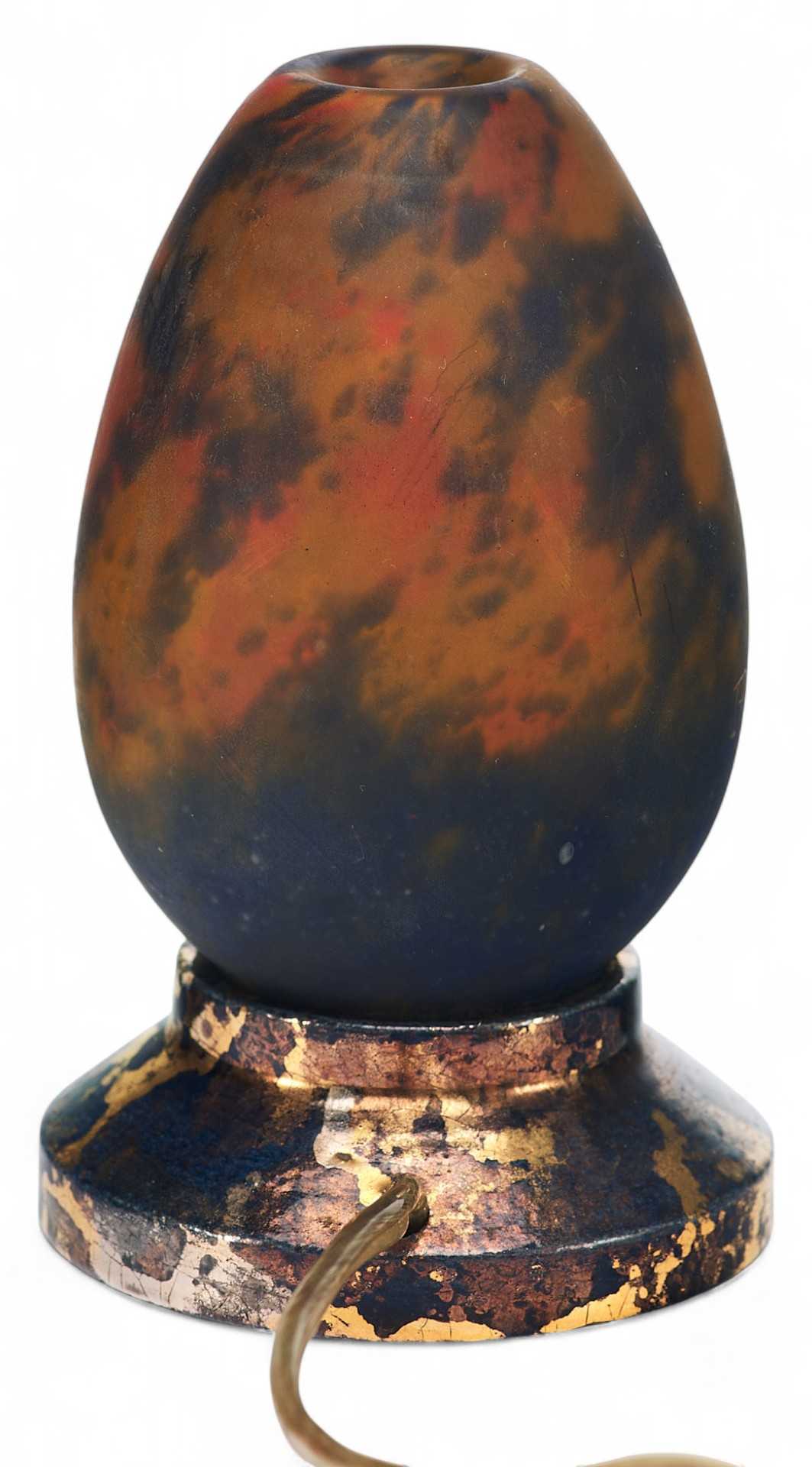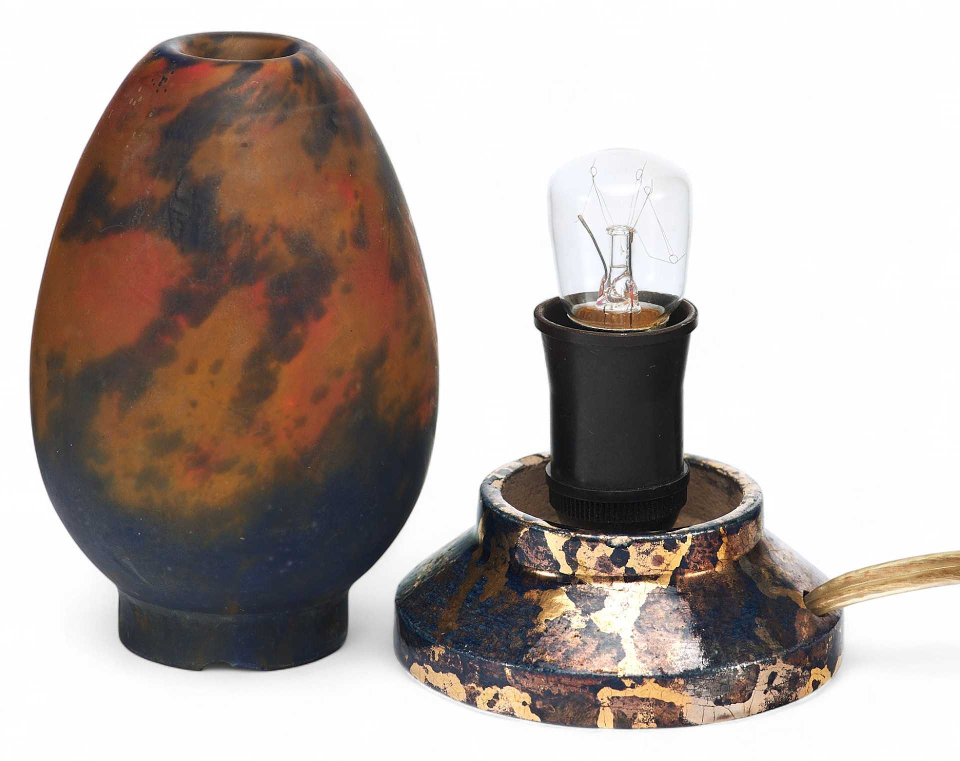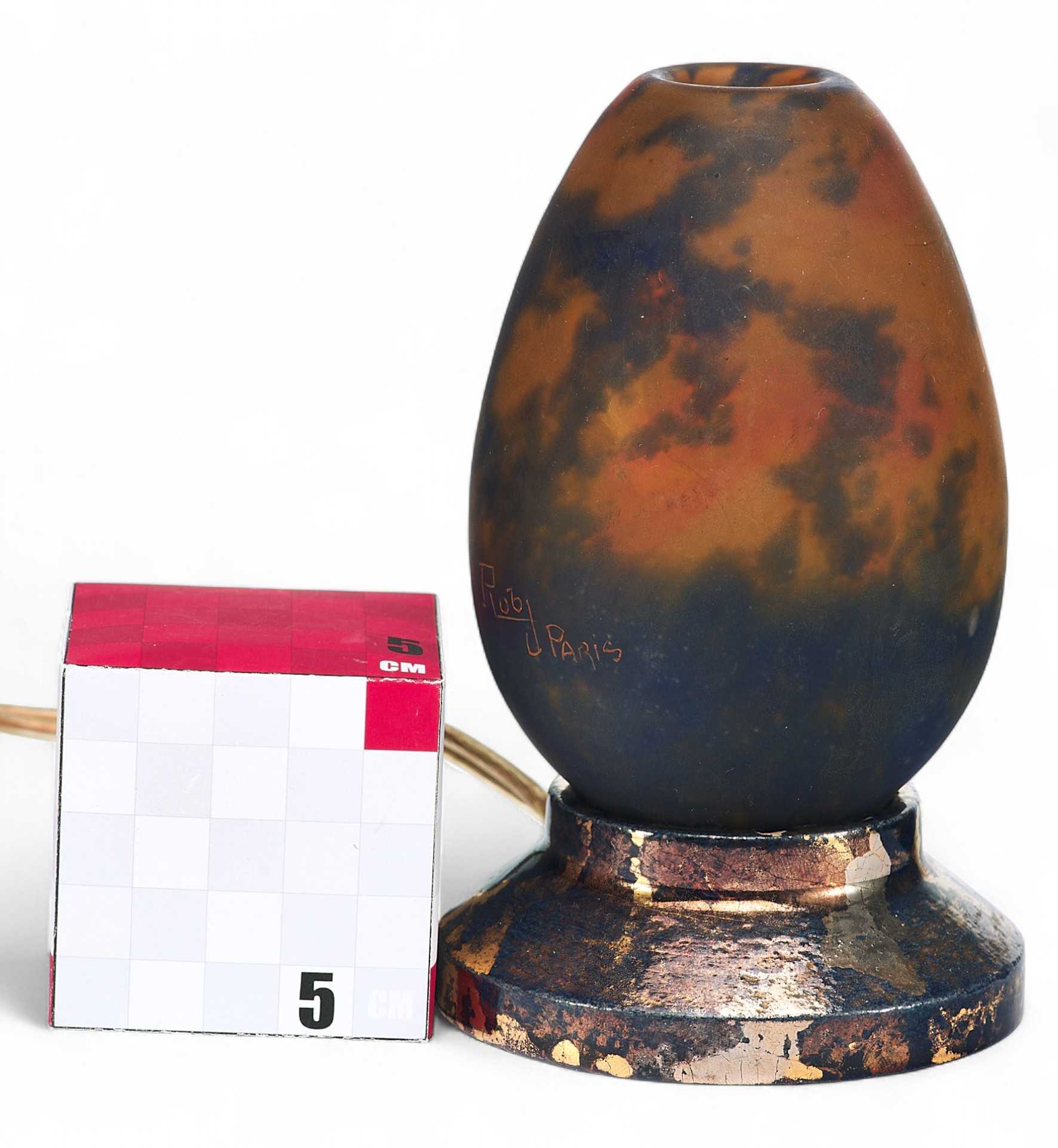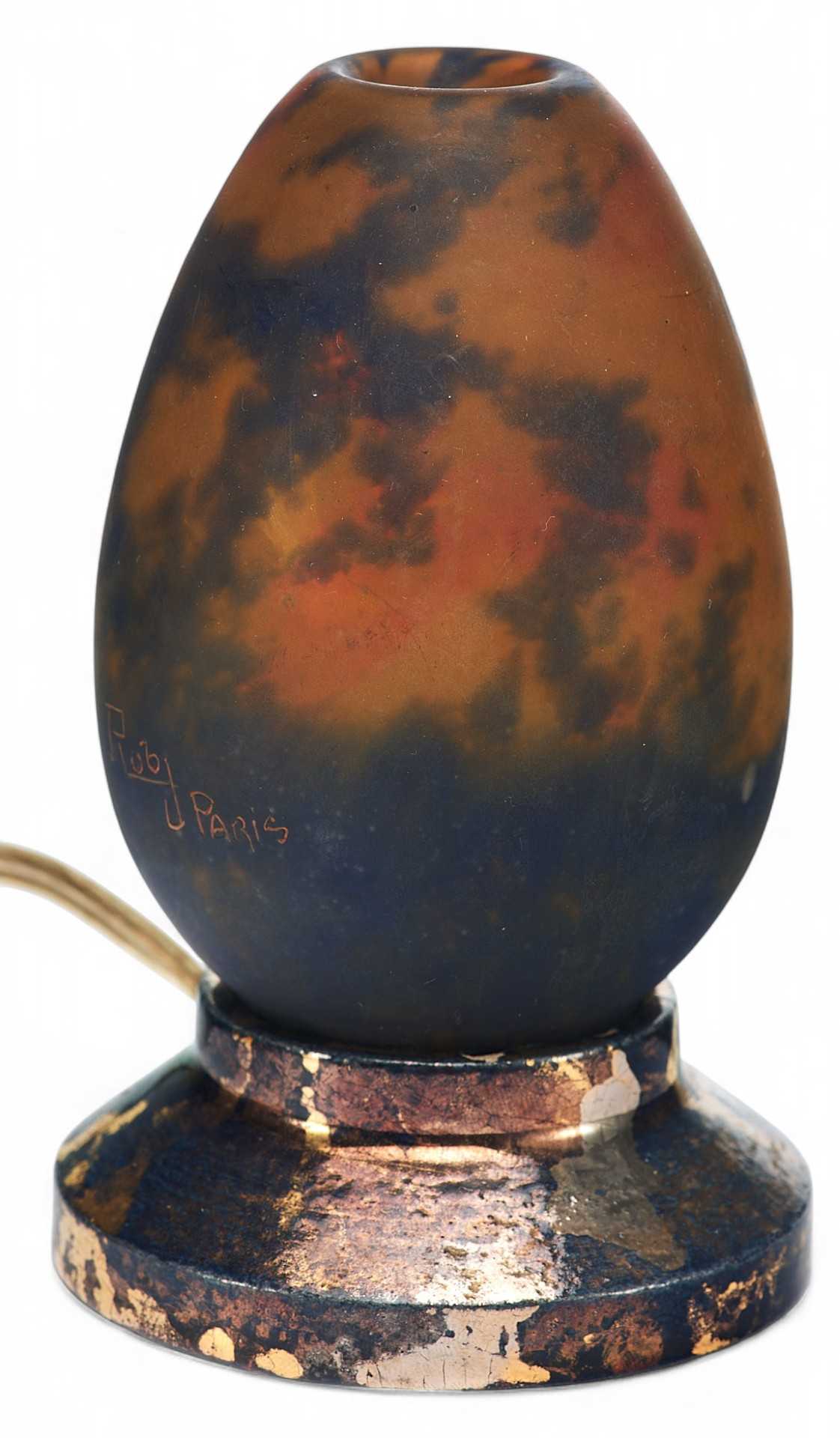 Электрическая настольная лампа, плафон которой изготовлен из цветного стекла, а основание из керамики и пластмассы. По своим художественным признакам лампа соотносится с принципами стиля ар-деко: леконичность форм, контрастное яркое оформление.