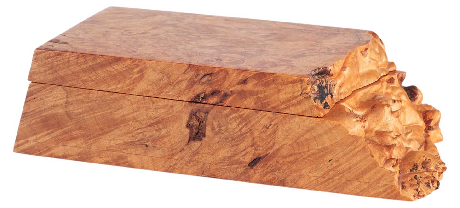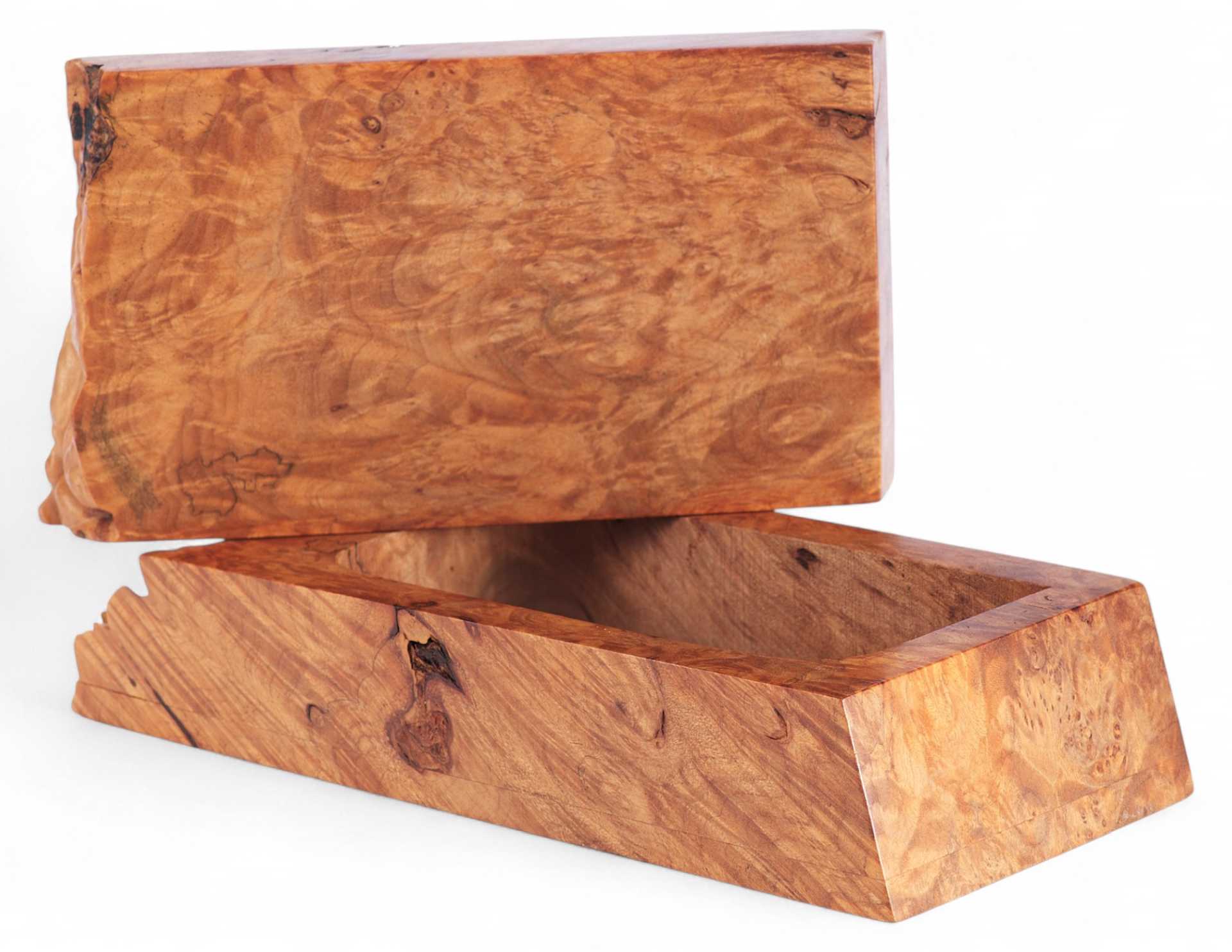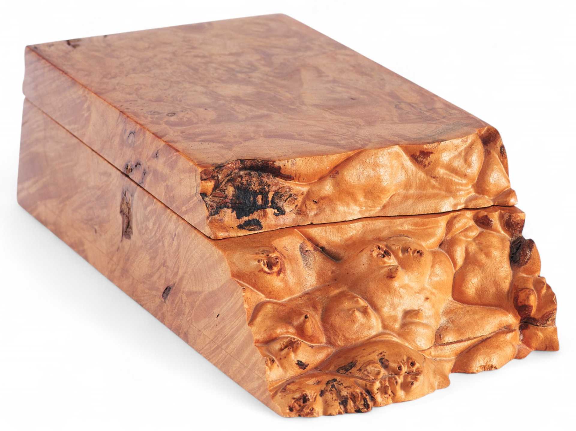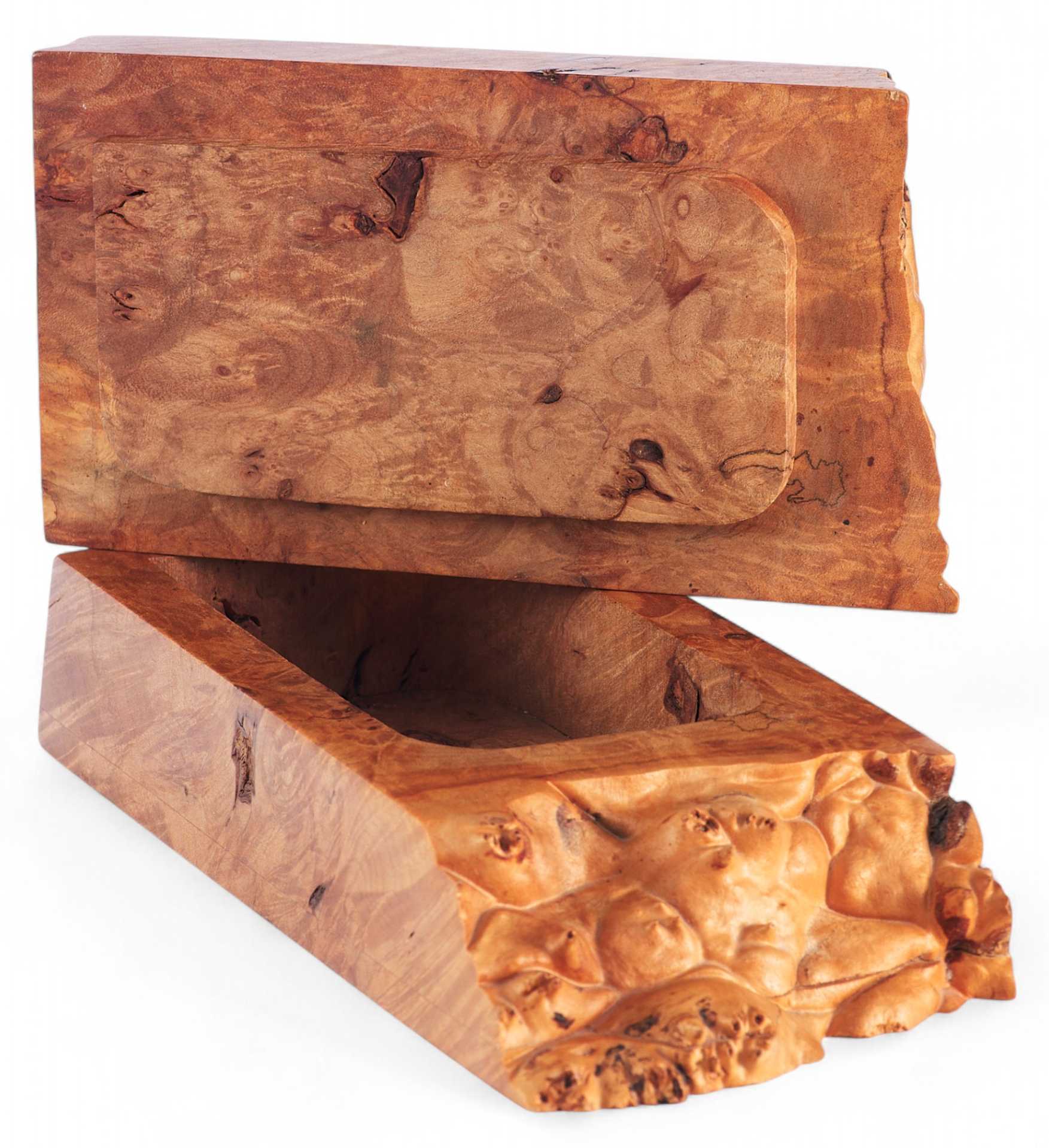 Шкатулка прямоугольной формы со съемной крышкой. Материалом для изготовления шкатулки использован кап с наростами.