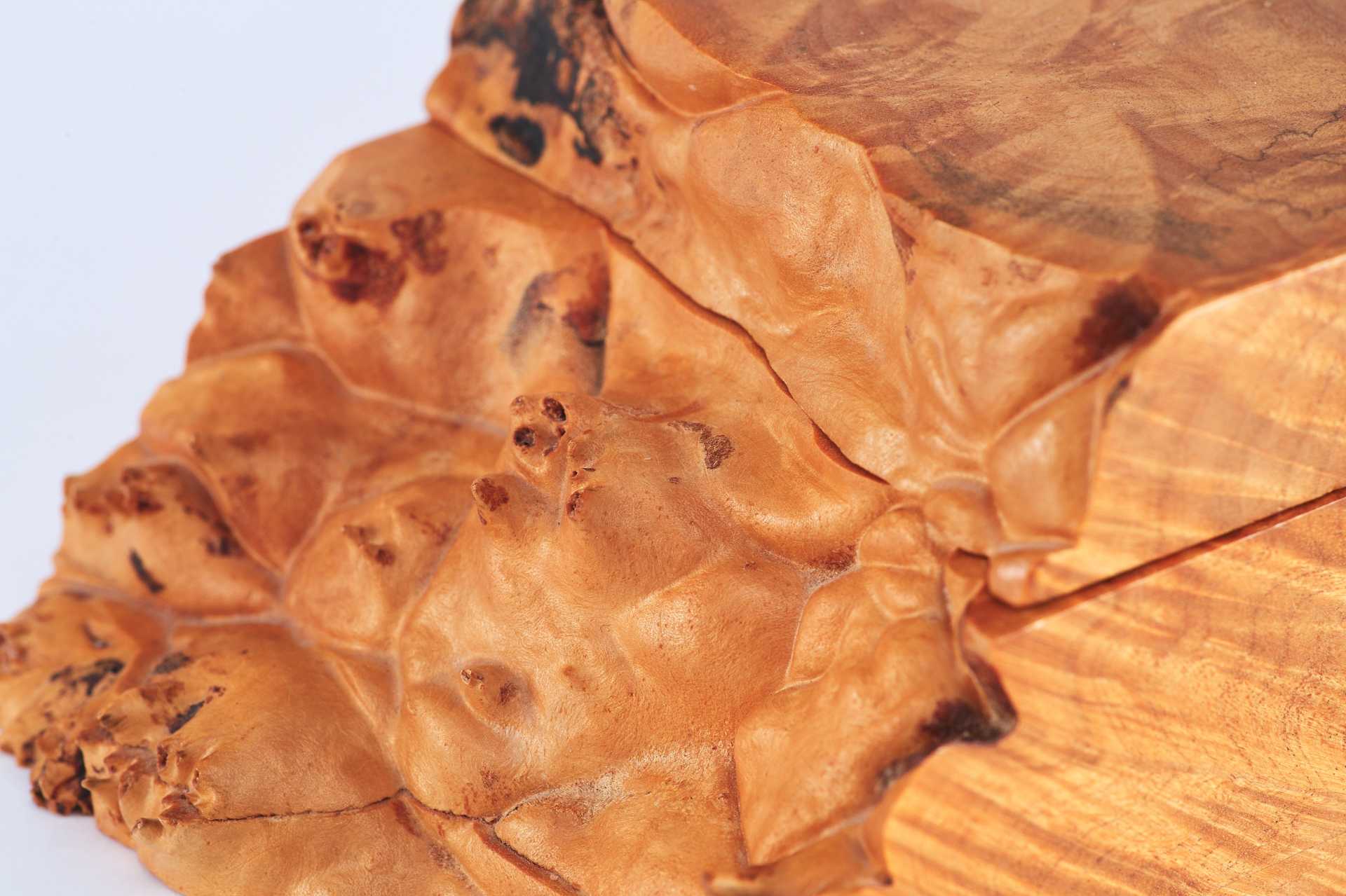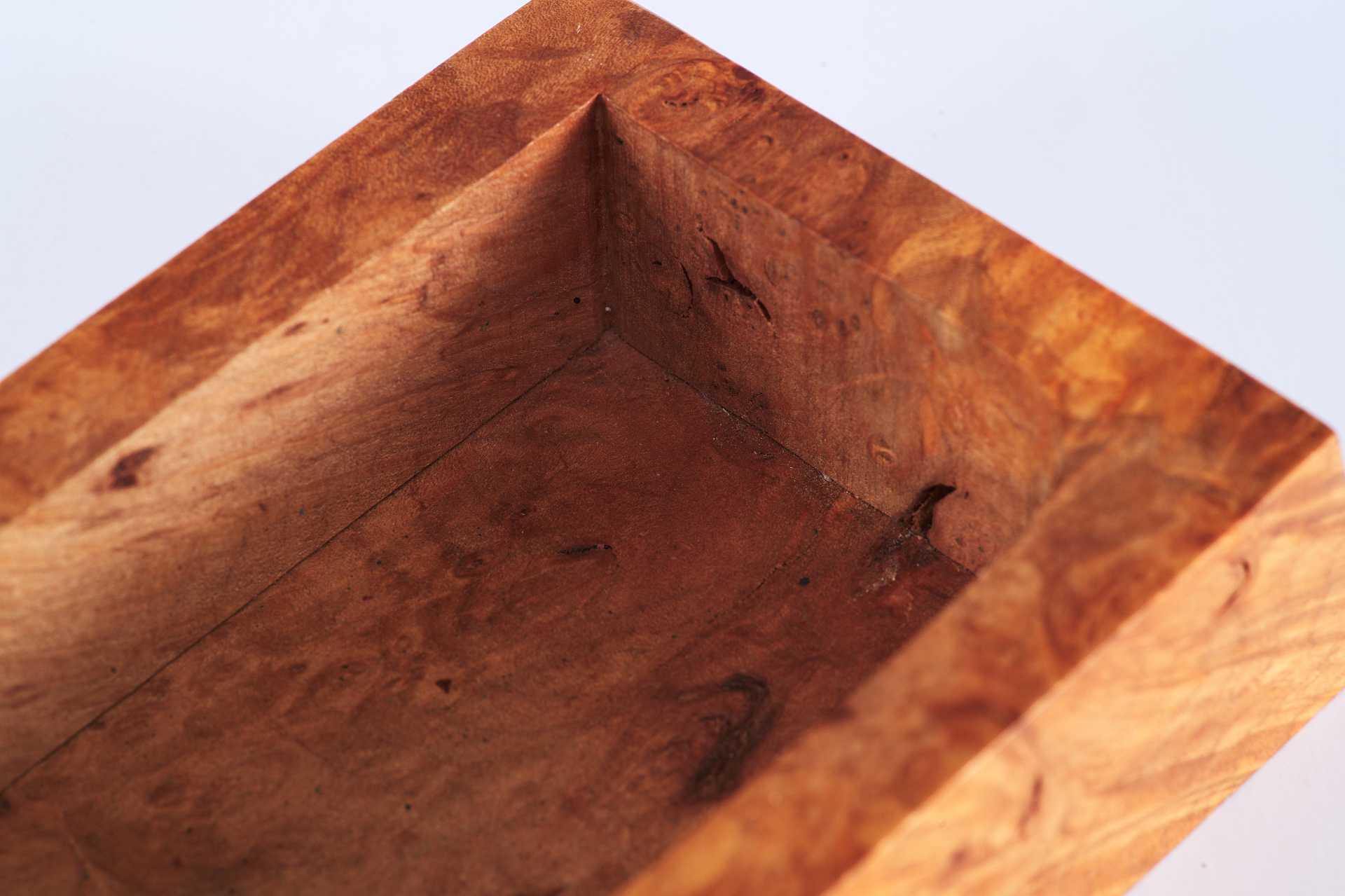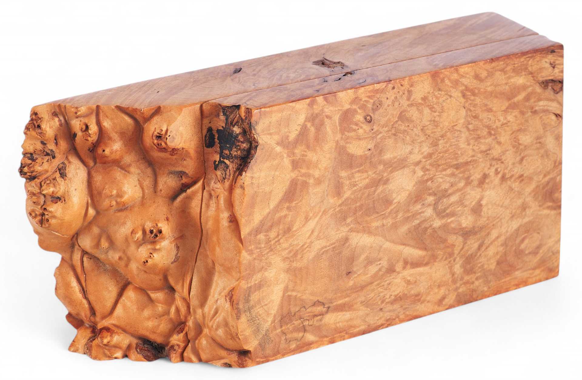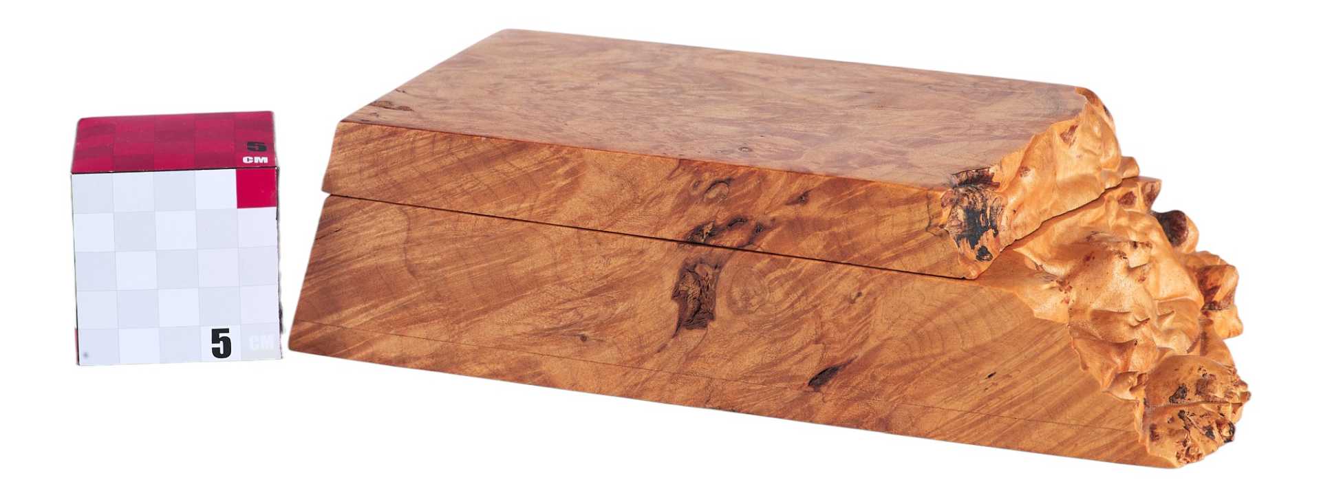 Шкатулка прямоугольной формы со съемной крышкой. Материалом для изготовления шкатулки использован кап с наростами.