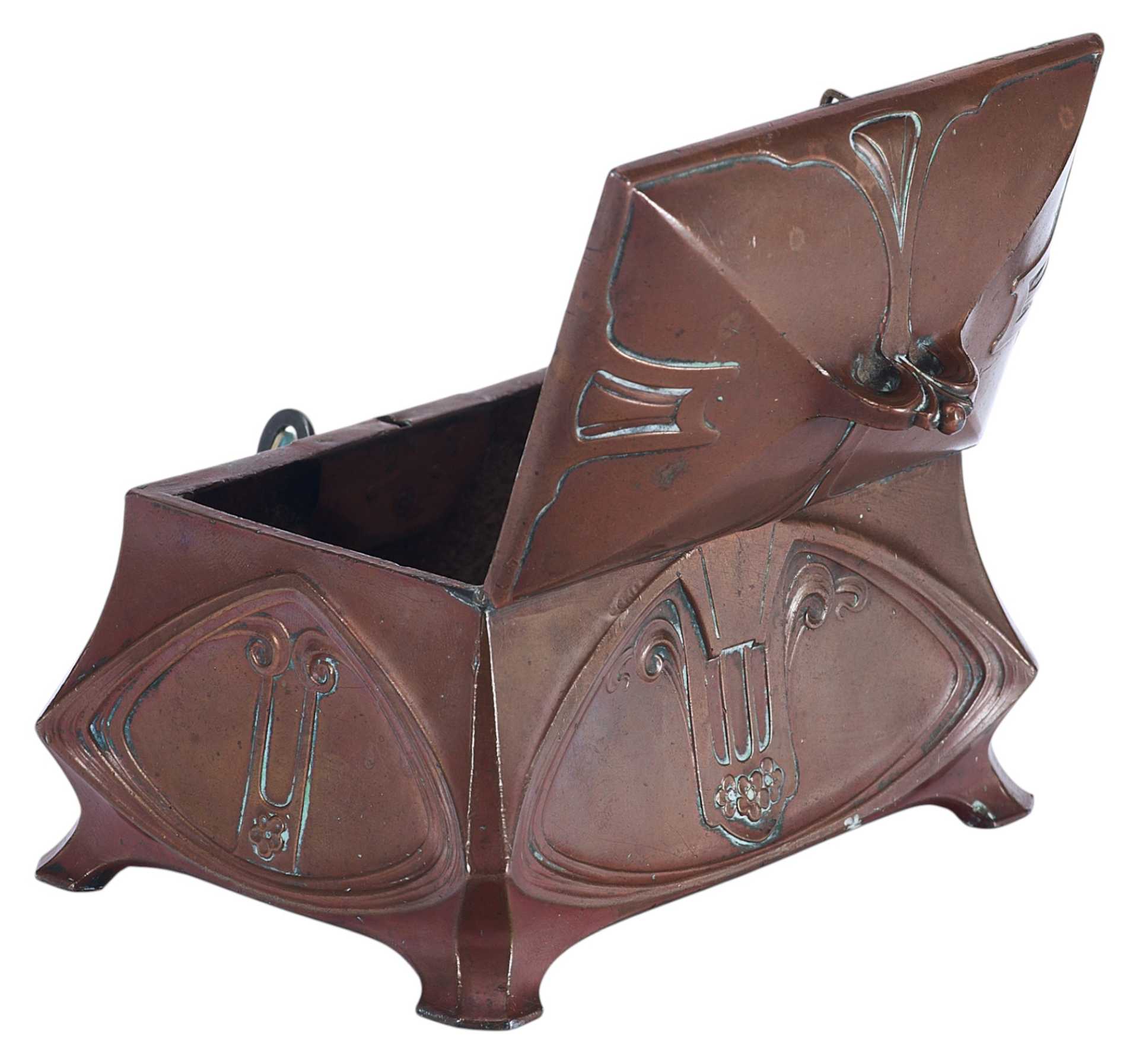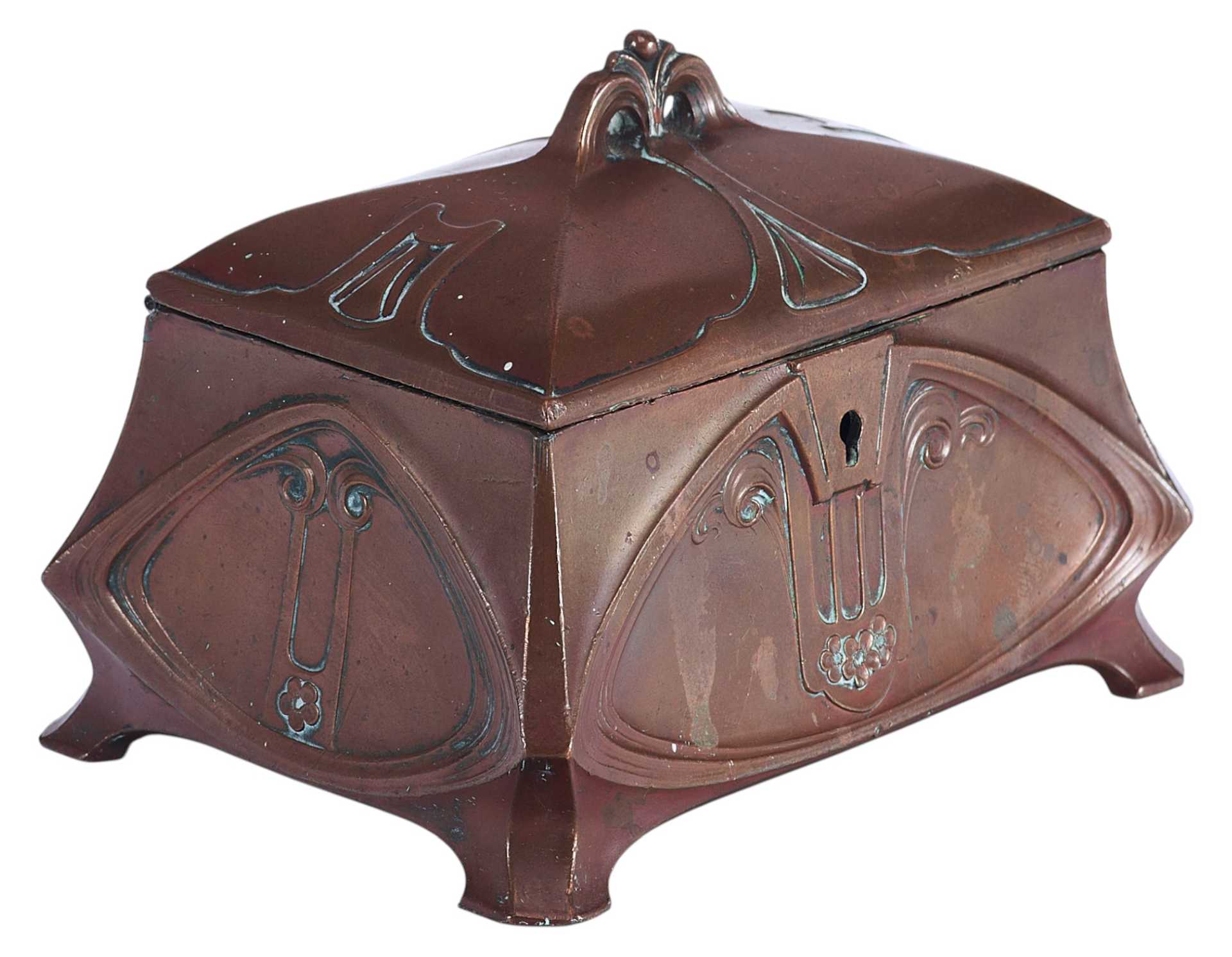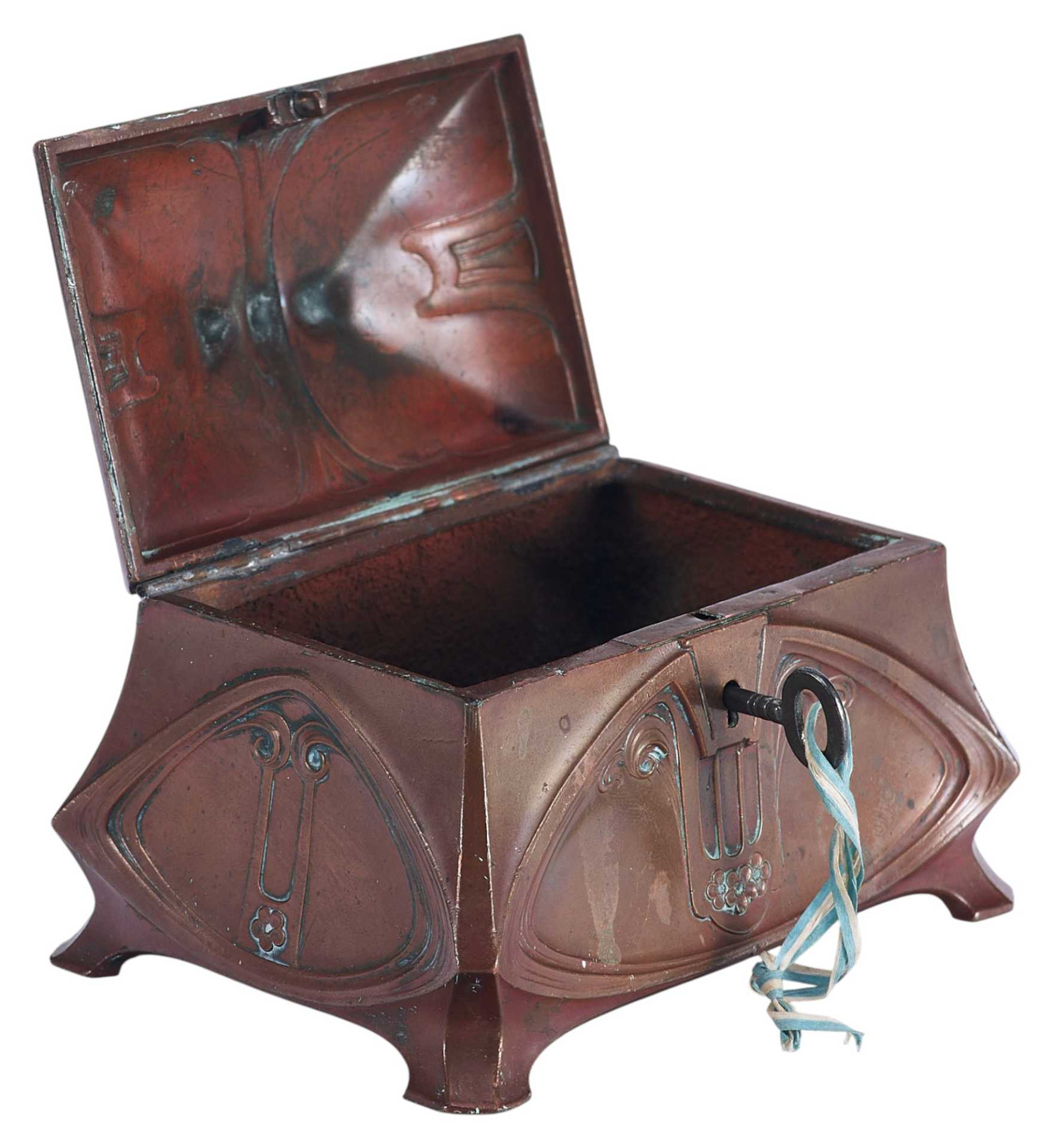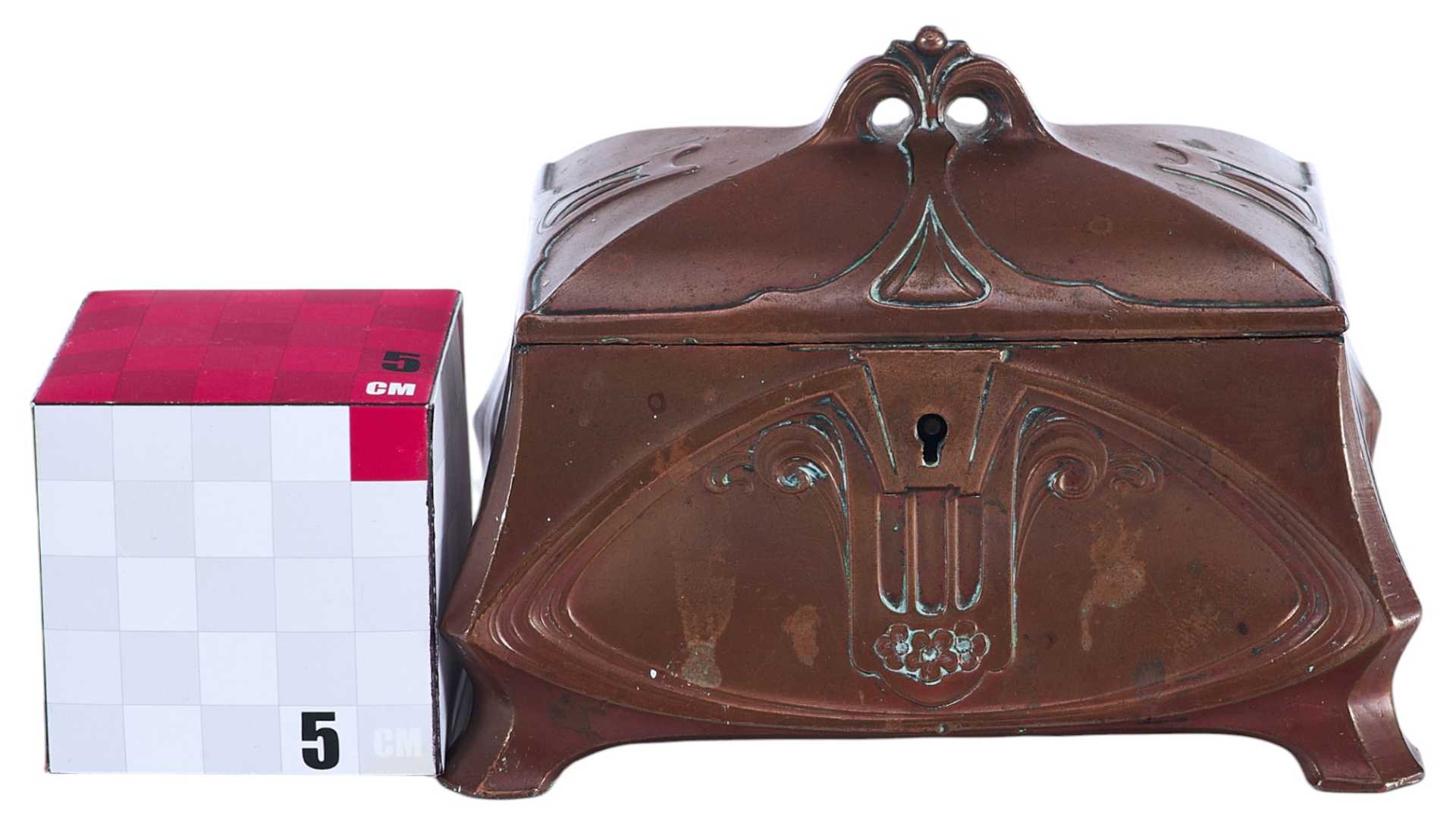 Шкатулка, художественное исполнение которой явно указывает на стилевые приемы искусства модерна, вероятнее всего немецкого югендстиля, активно проявившегося в дизайне металлических предметов бытового назначения. Югендстиль - немецкое название модерна, или Art Nouveau, который в конце XIX - начале XX веков господствовал во всех странах Европы. Иметь обстановку или предмет мебели в стиле югенд считалось признаком богатства и хорошего вкуса. Ценители восхваляли югендстиль за ясность и чистоту художественных концепций, в которых пространство возымело новую функциональность и декоративное значение.