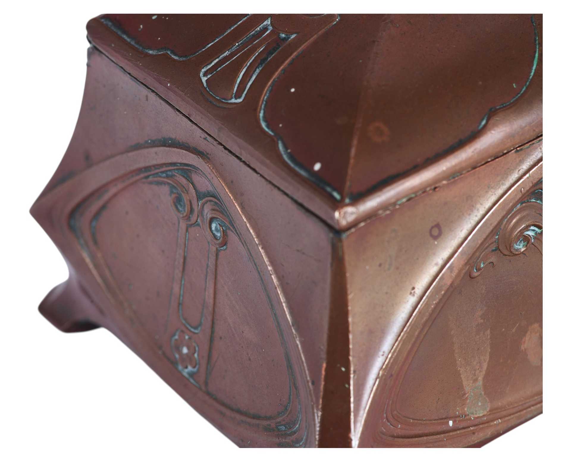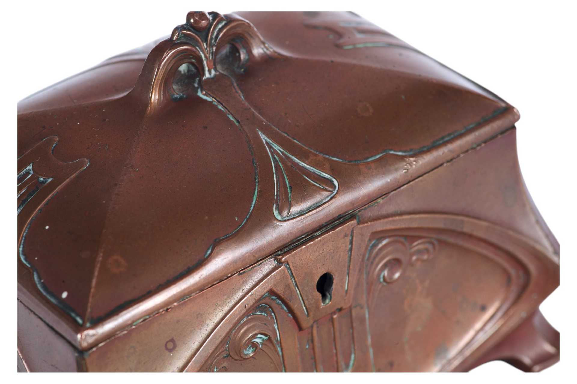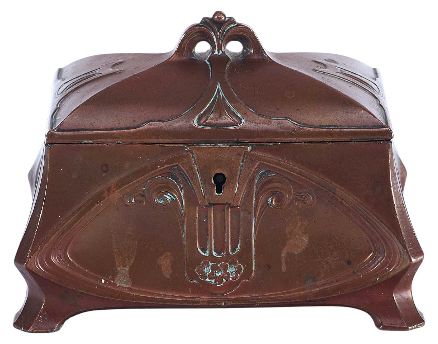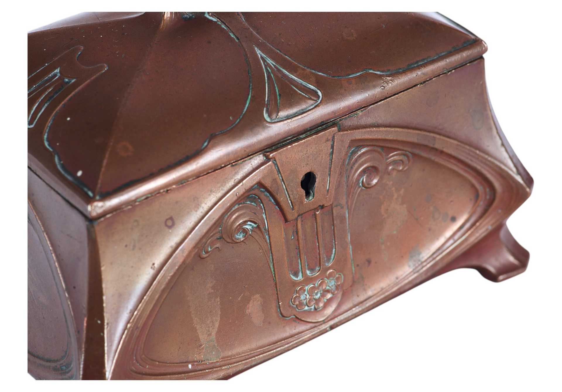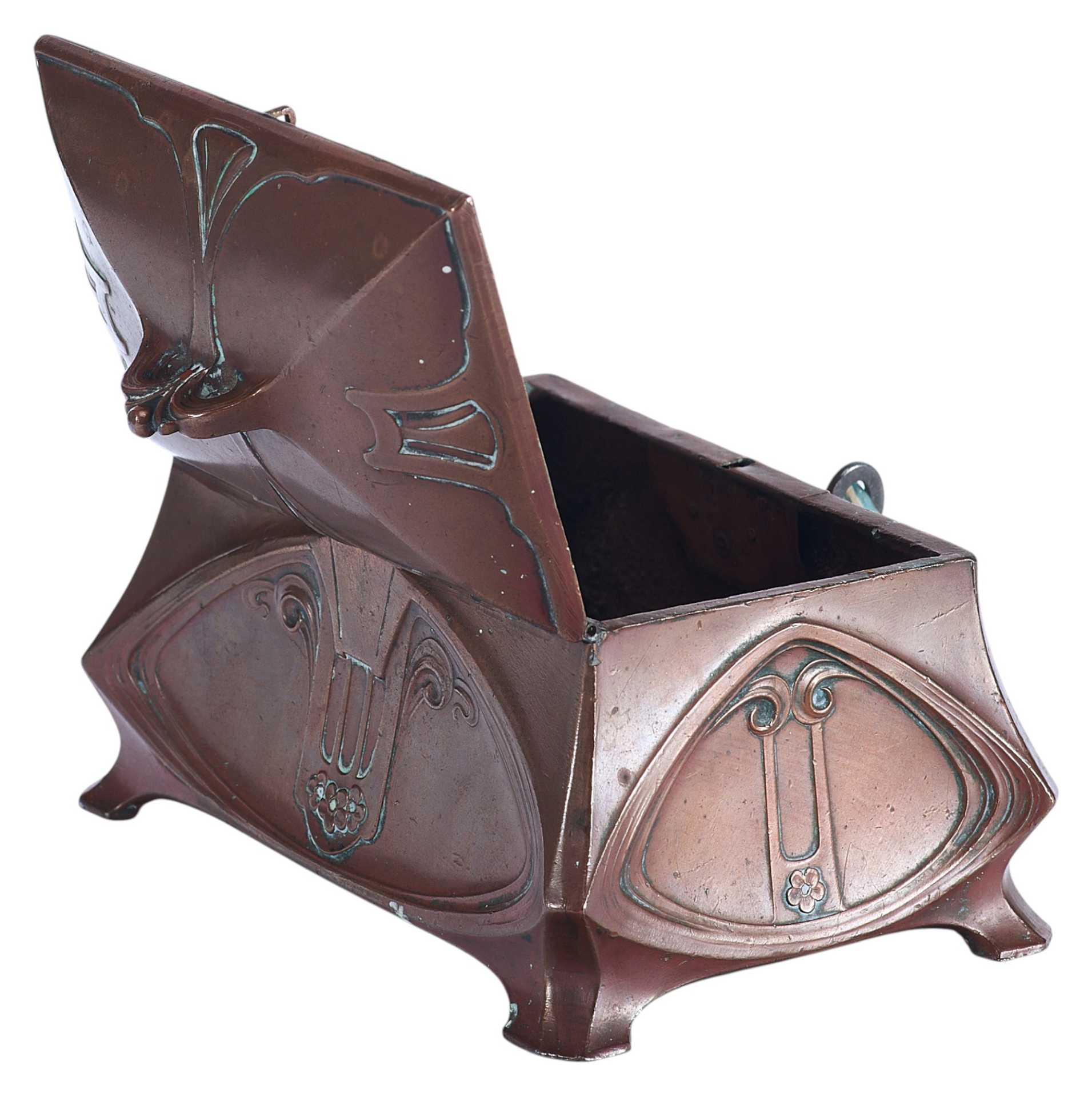 Шкатулка, художественное исполнение которой явно указывает на стилевые приемы искусства модерна, вероятнее всего немецкого югендстиля, активно проявившегося в дизайне металлических предметов бытового назначения. Югендстиль - немецкое название модерна, или Art Nouveau, который в конце XIX - начале XX веков господствовал во всех странах Европы. Иметь обстановку или предмет мебели в стиле югенд считалось признаком богатства и хорошего вкуса. Ценители восхваляли югендстиль за ясность и чистоту художественных концепций, в которых пространство возымело новую функциональность и декоративное значение.