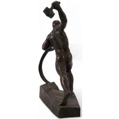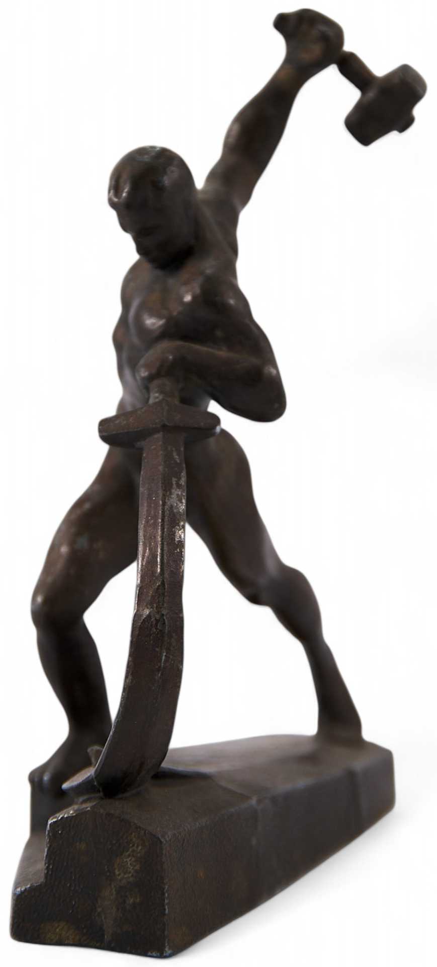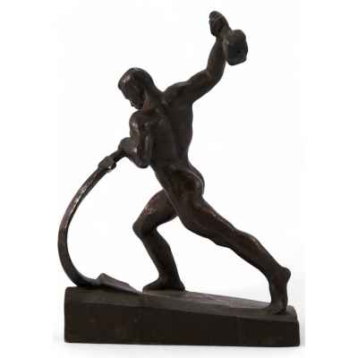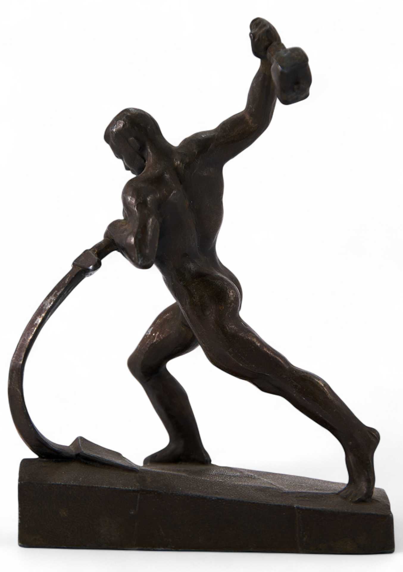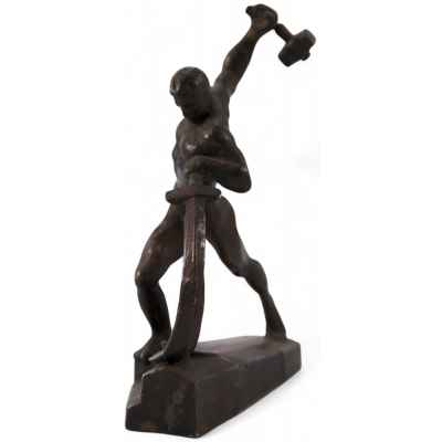 На невысокой подставке представлена фигура кузнеца с молотом. Он размашистым движением руки, согнув лезвие меча, превращает его в мирное орудие - плуг.