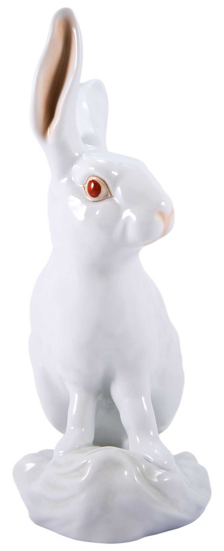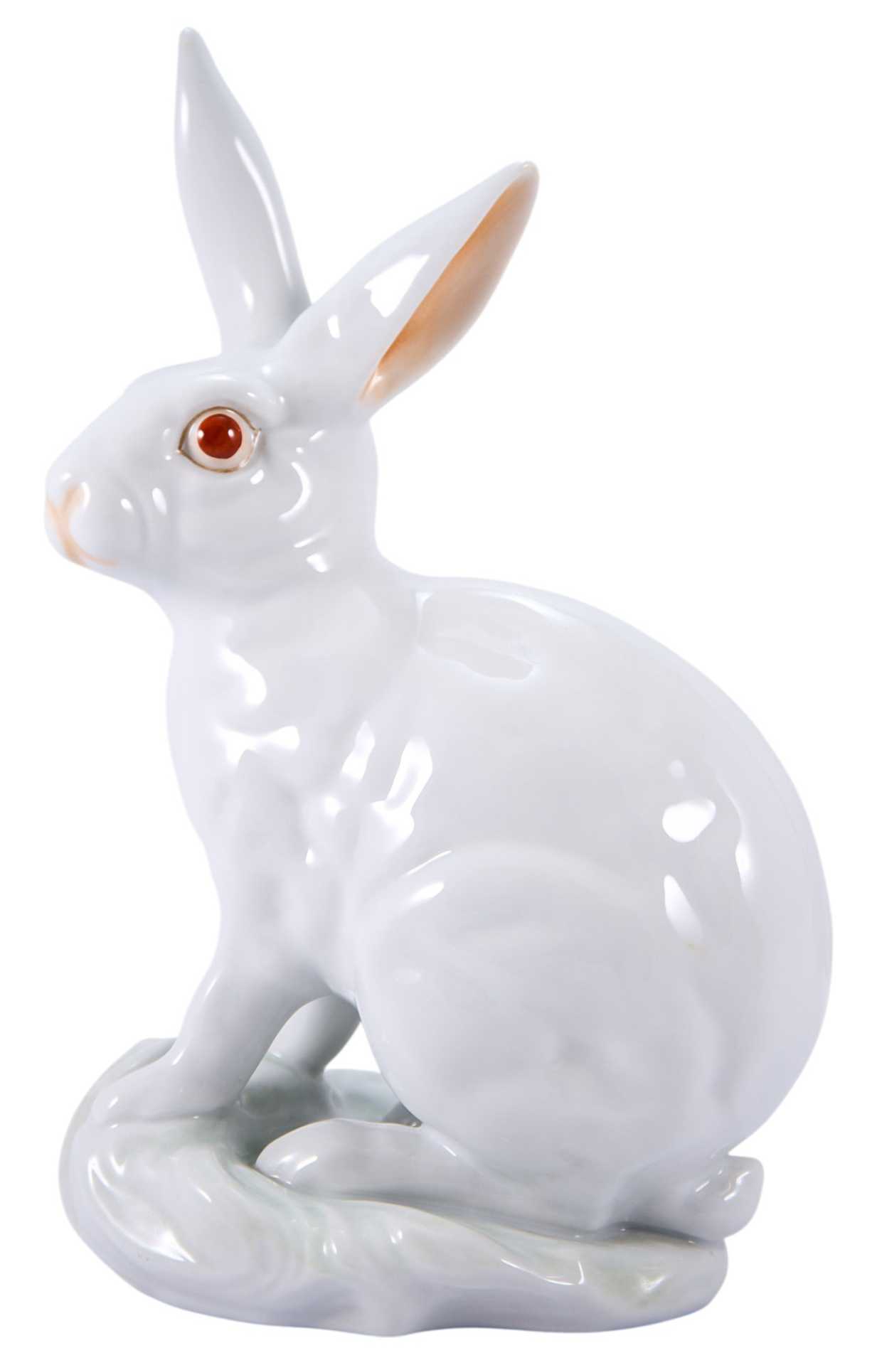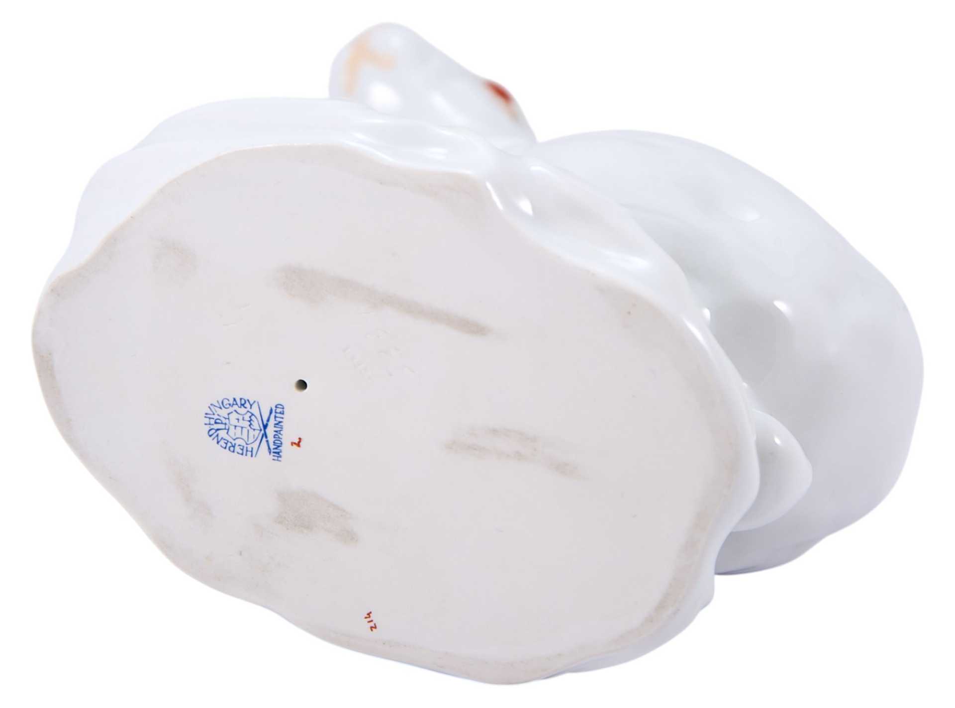 Скульптура большого кролика. Это одна из классических фигур фабрики Херенд. На основании клеймо фарфоровой фабрики (Herend), которое ставилось в период с 1960 по 1986 годы, а также клеймо «в тесте»: HEREND 5334. Фарфоровая фабрика Херенд (Венгрия) В 1826 году, в небольшой деревушке Херенд (Herend), расположенной на склоне горы, открылась мастерская, выпускавшая керамические изделия. В 1839 году владельцем мастерской стал Мор Фишер (Mór Fischer), и это стало началом нового периода в развитии будущей фабрики. Фишер взял огромные ссуды на развитие фарфорового производства, первый коммерческий успех пришел довольно быстро. Заказчиками завода "Herend" стали венгерские аристократы, появились заказы на сервизы. В этот момент и формируется оригинальная и неповторимая школа росписи фарфора "Herend", ориентированная на изготовление уникального, расписываемого вручную фарфора. Некоторые рисунки, созданные в XIX веке, используются для росписи фарфора до сих пор ("Цветы Индии", "Птицы Ротшильдов", "Малые розы", "Королева Виктория"). Прославился "Herend" иросписями в стиле "шинуазри".