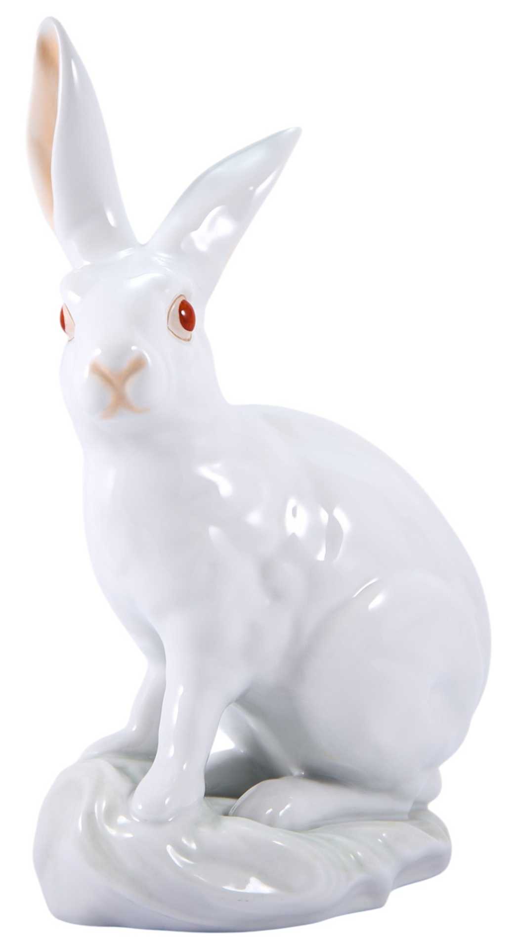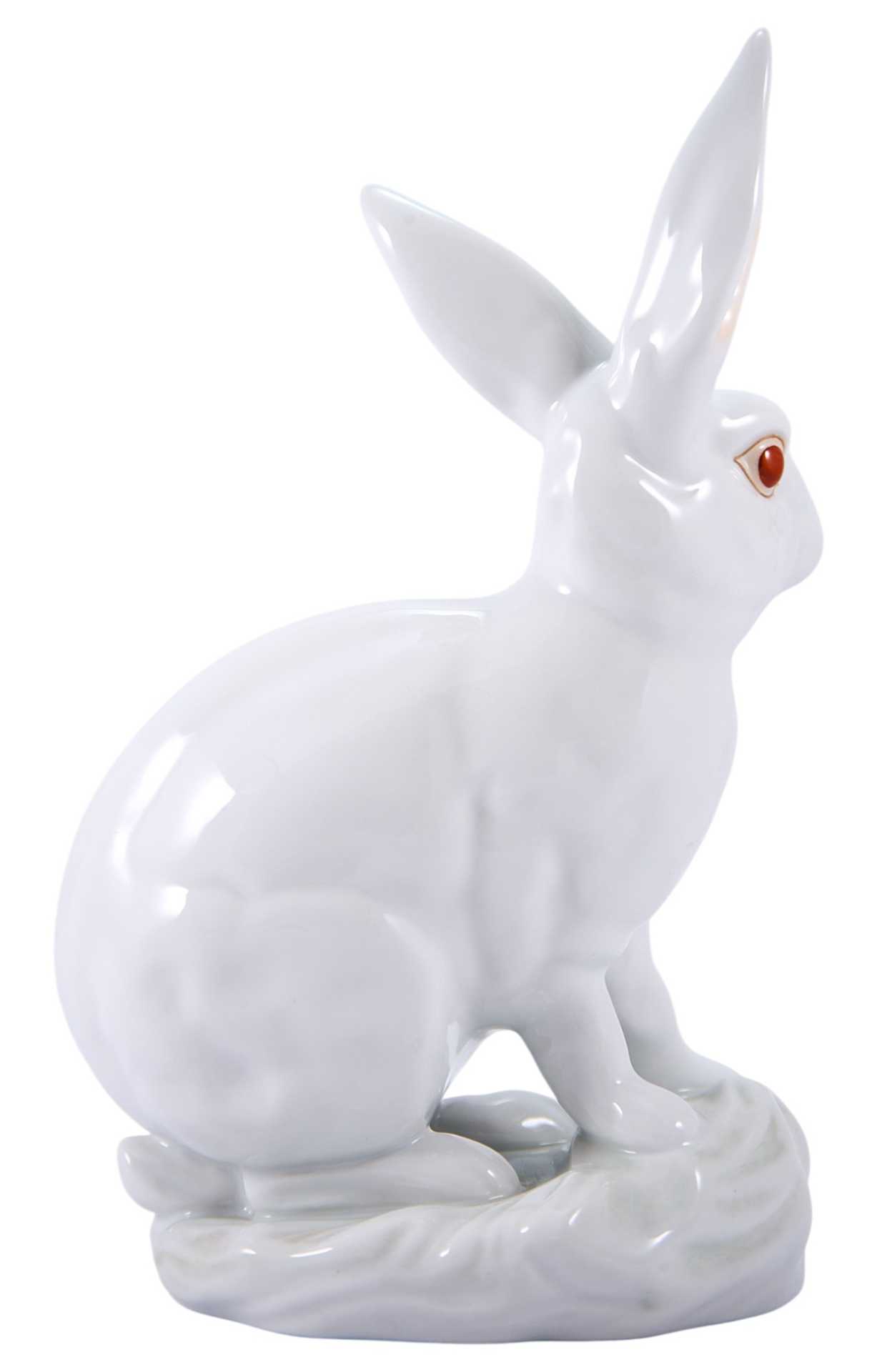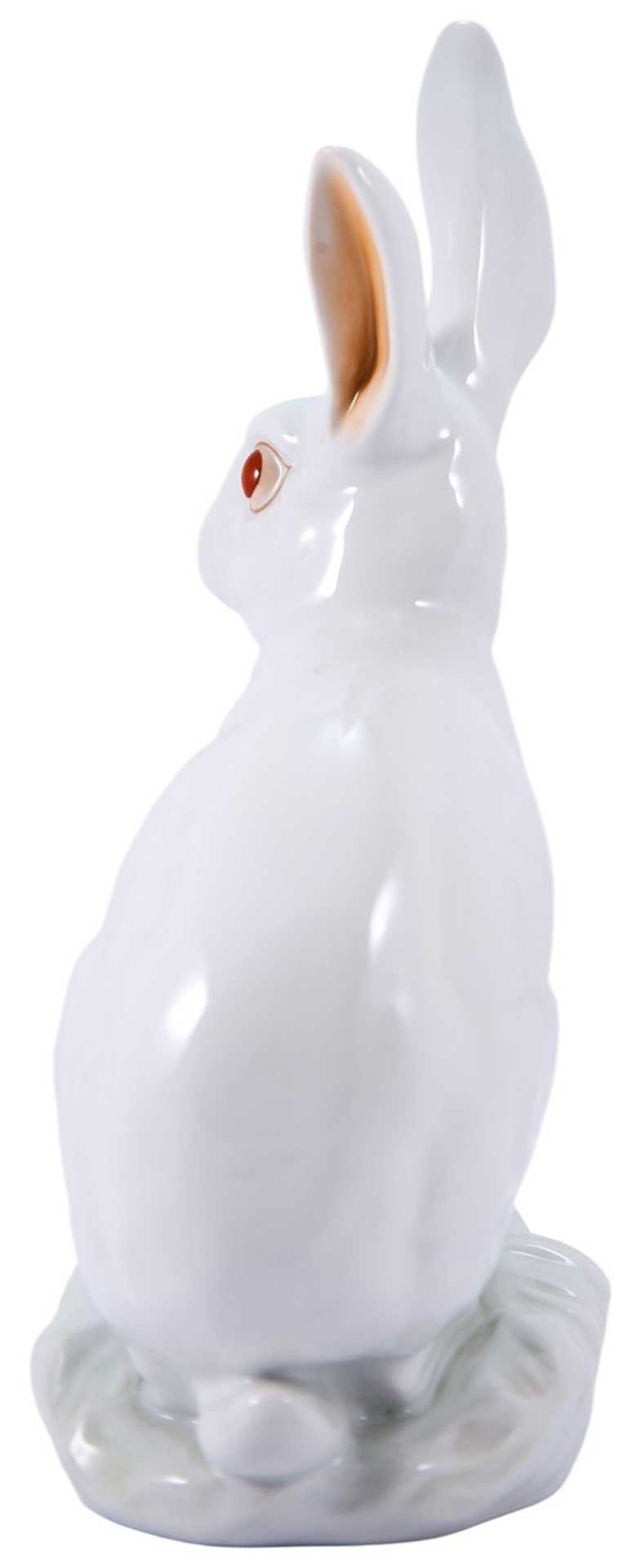 Скульптура большого кролика. Это одна из классических фигур фабрики Херенд. На основании клеймо фарфоровой фабрики (Herend), которое ставилось в период с 1960 по 1986 годы, а также клеймо «в тесте»: HEREND 5334. Фарфоровая фабрика Херенд (Венгрия) В 1826 году, в небольшой деревушке Херенд (Herend), расположенной на склоне горы, открылась мастерская, выпускавшая керамические изделия. В 1839 году владельцем мастерской стал Мор Фишер (Mór Fischer), и это стало началом нового периода в развитии будущей фабрики. Фишер взял огромные ссуды на развитие фарфорового производства, первый коммерческий успех пришел довольно быстро. Заказчиками завода "Herend" стали венгерские аристократы, появились заказы на сервизы. В этот момент и формируется оригинальная и неповторимая школа росписи фарфора "Herend", ориентированная на изготовление уникального, расписываемого вручную фарфора. Некоторые рисунки, созданные в XIX веке, используются для росписи фарфора до сих пор ("Цветы Индии", "Птицы Ротшильдов", "Малые розы", "Королева Виктория"). Прославился "Herend" иросписями в стиле "шинуазри".
