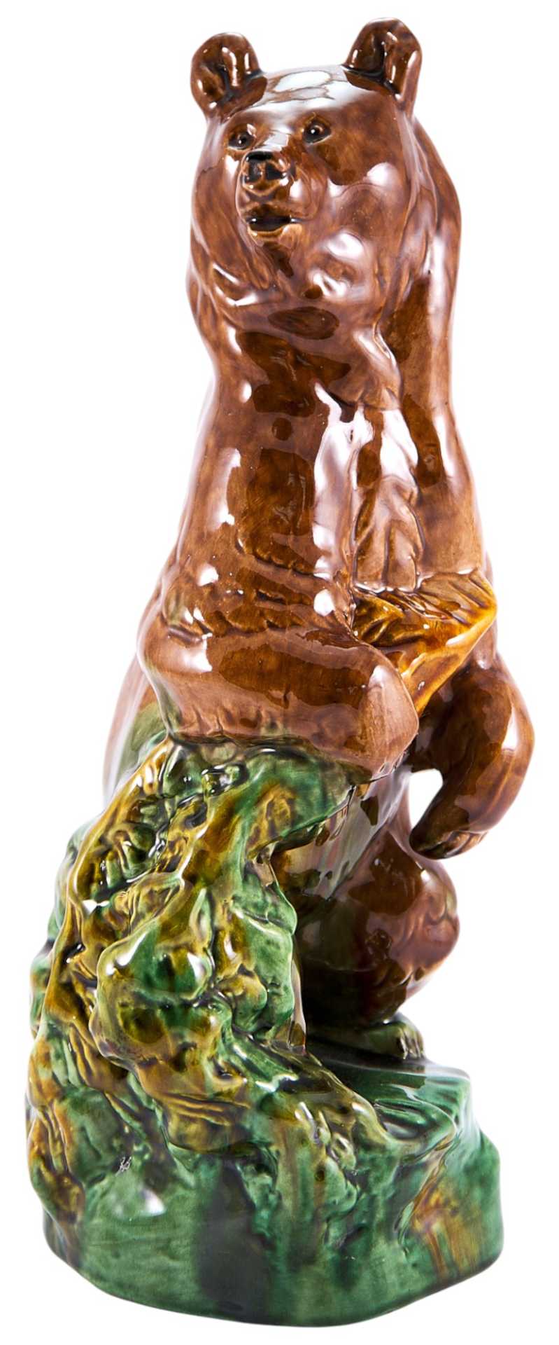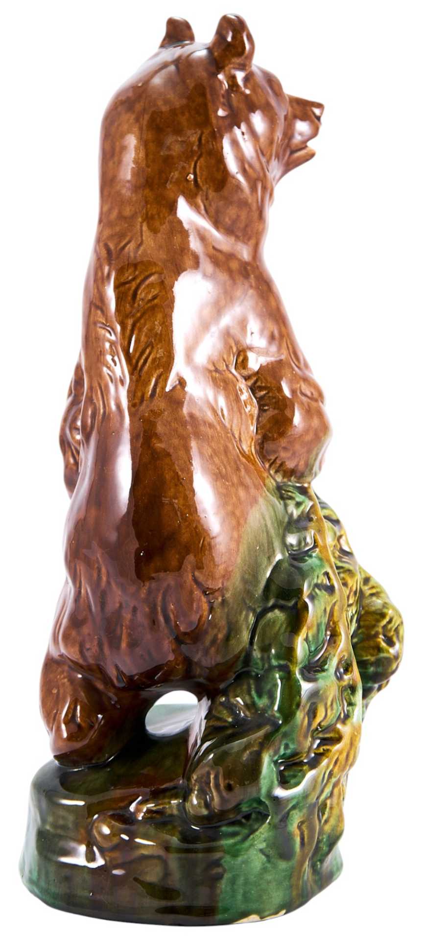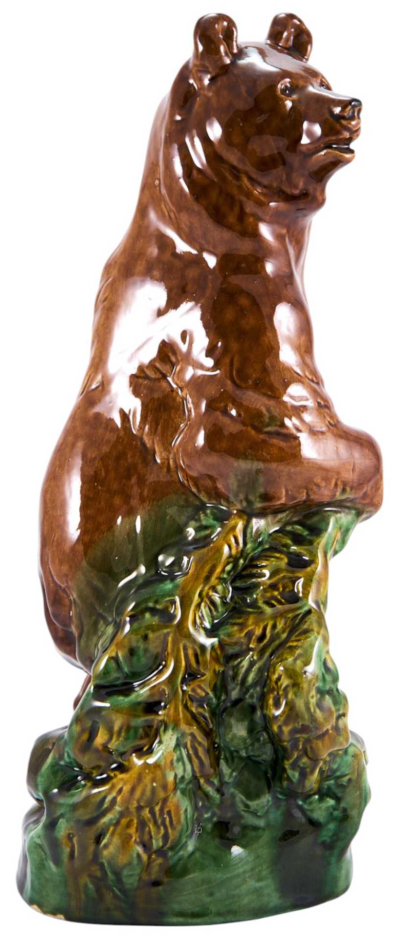 Представлена скульптура медведя, стоящего на задних лапах и придерживающего еловую ветку. Данная фигура относится к продукции производимой артелью «Керамик», образованной в Нижних Таволгах, под Невьянском.