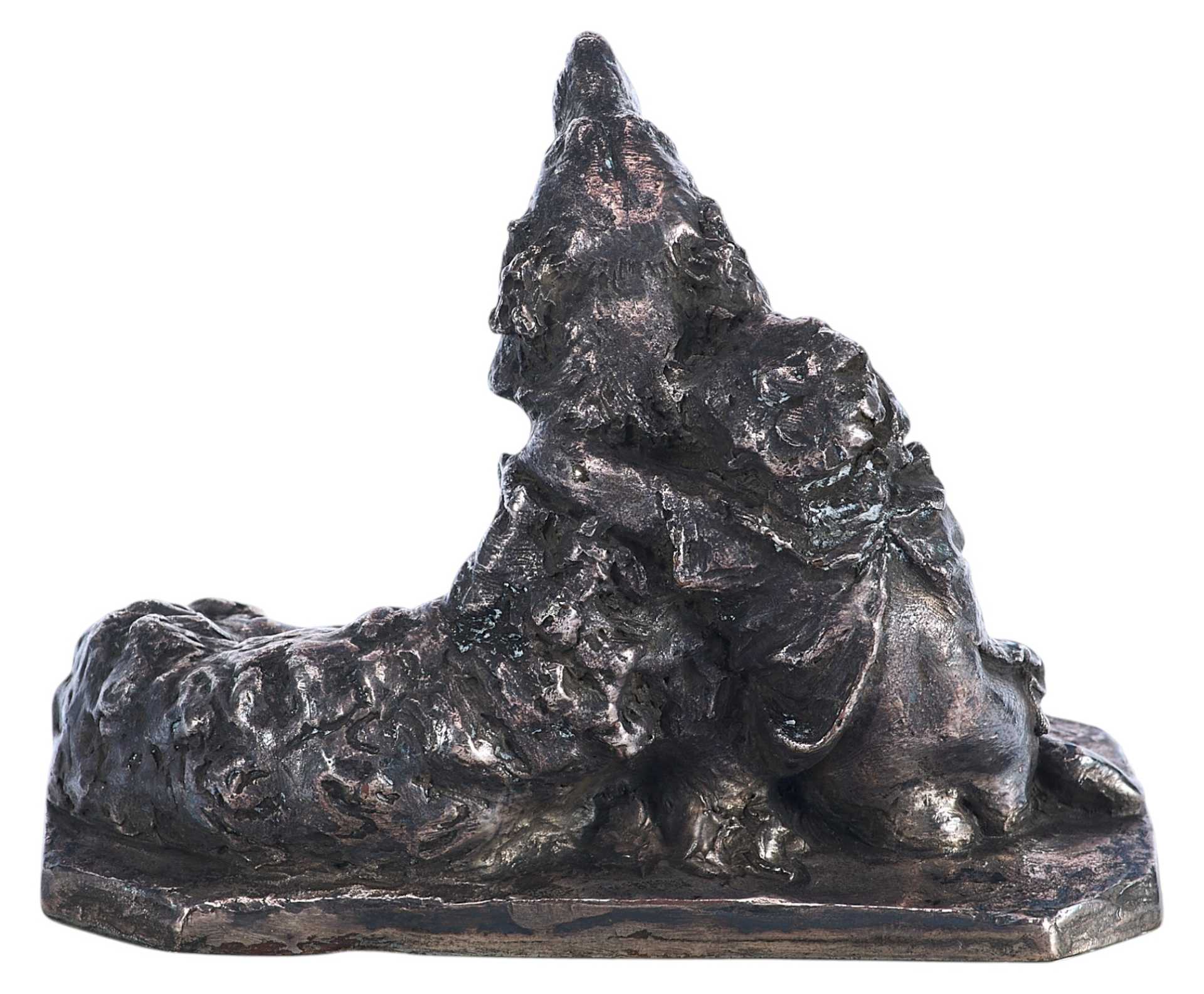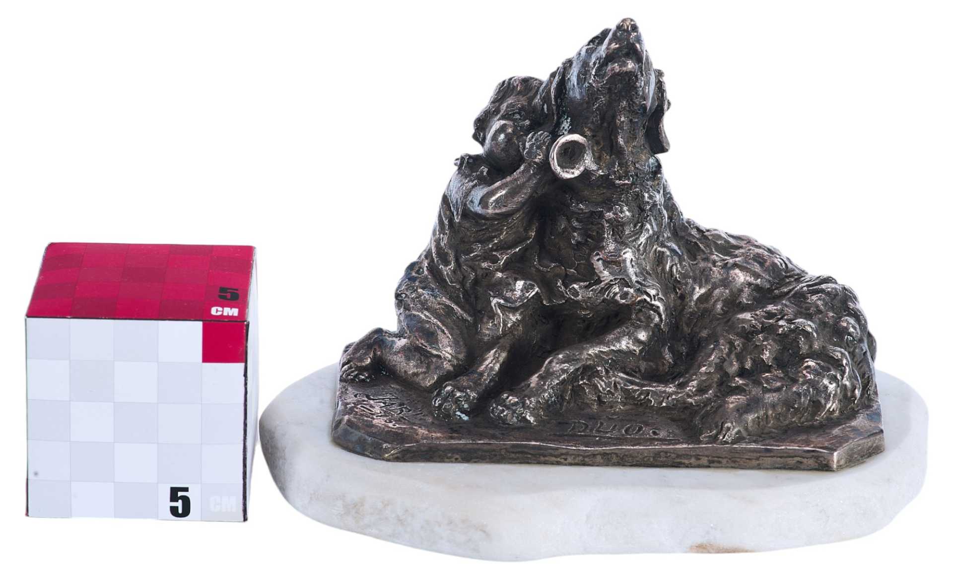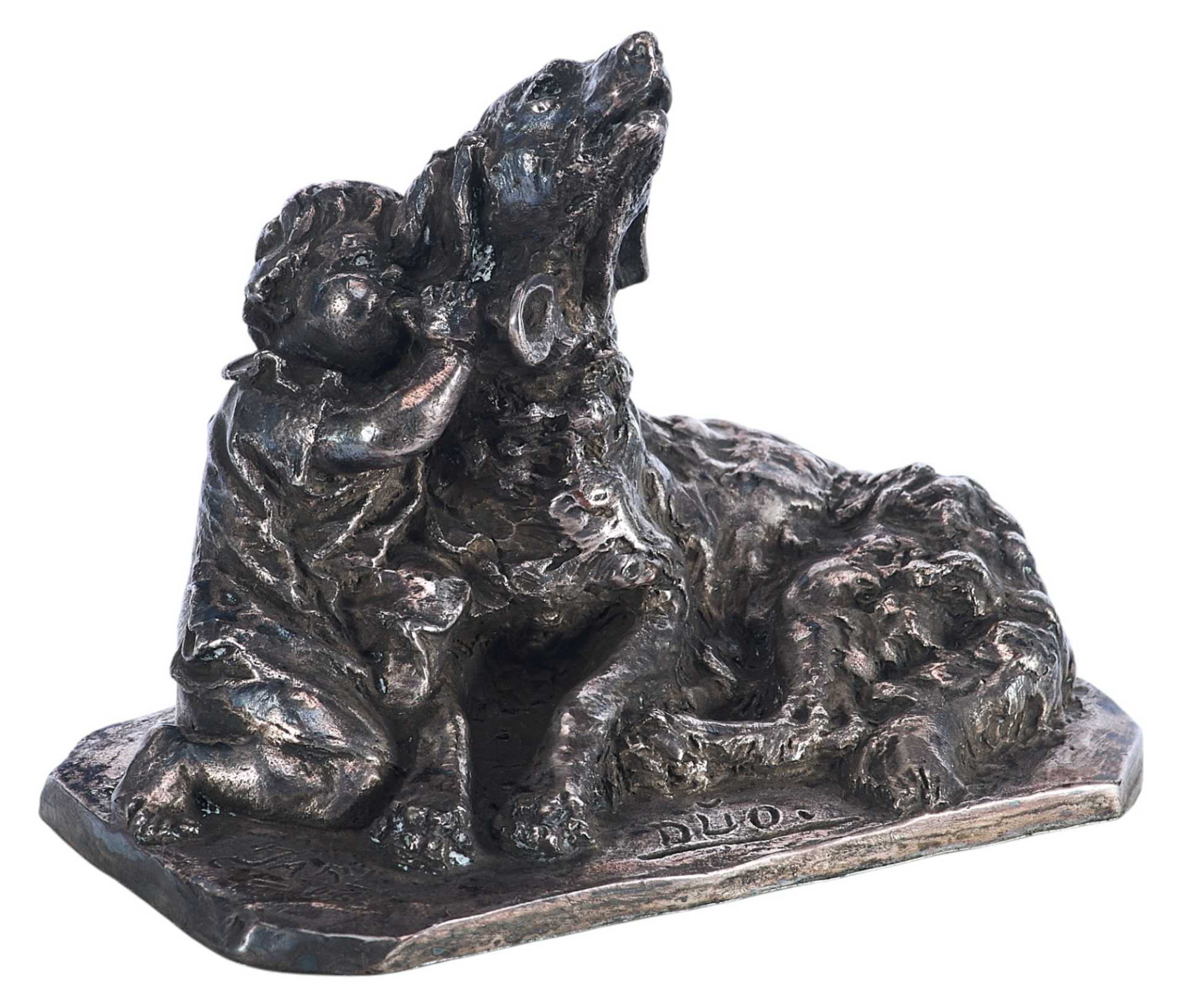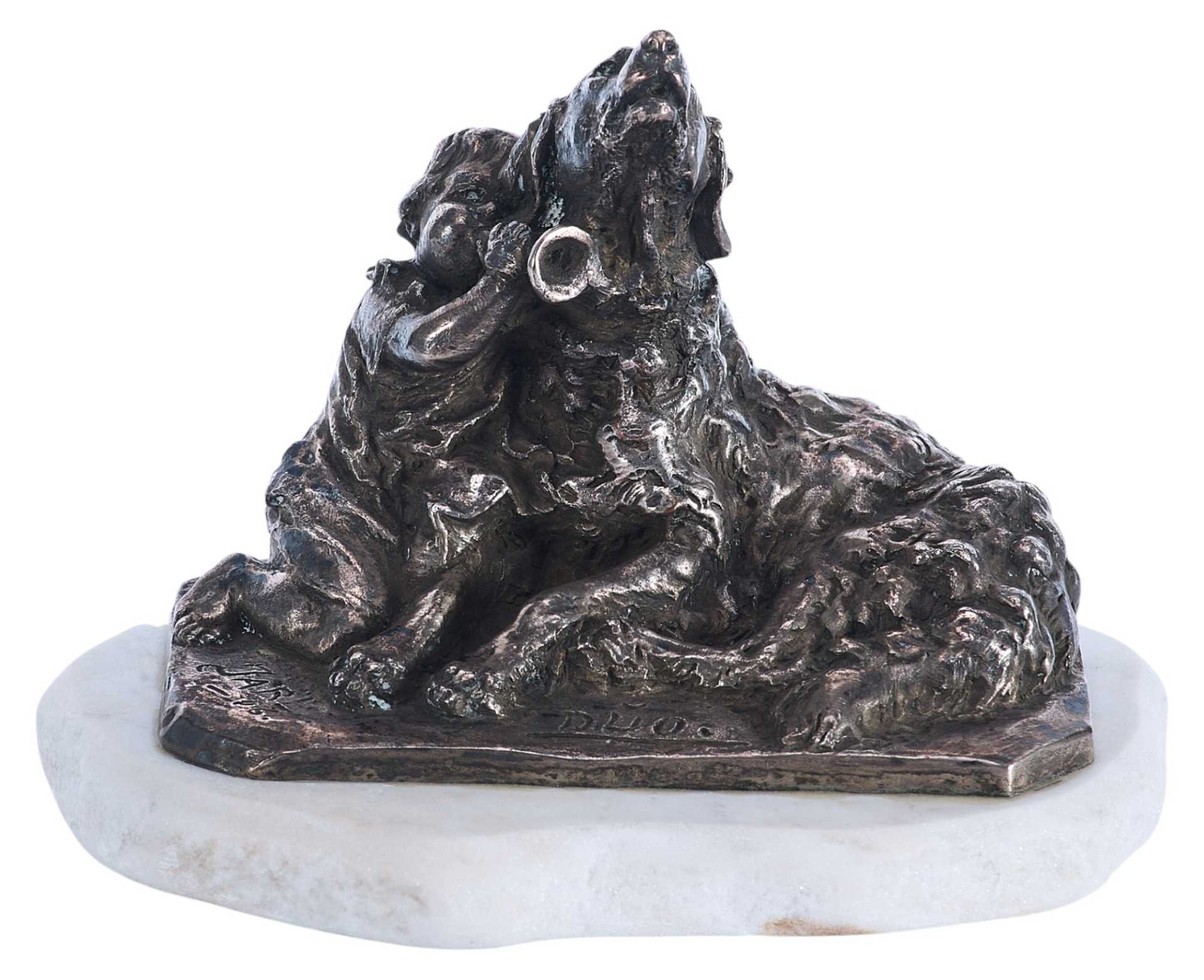 Фигура сидящих мальчика и собаки. Мальчик одной рукой обнимает лежащего пса, в другой его руке духовая труба. Пес