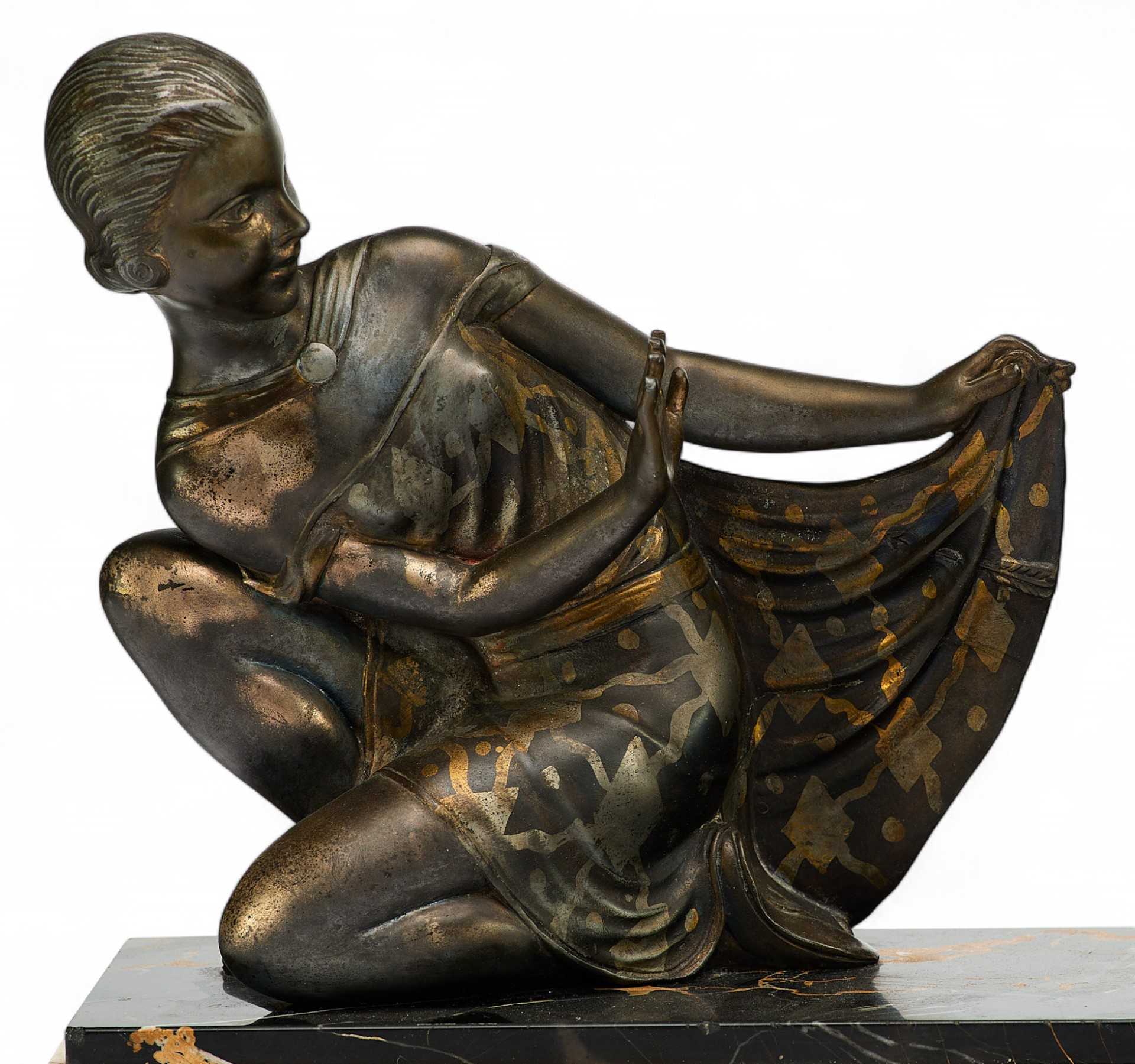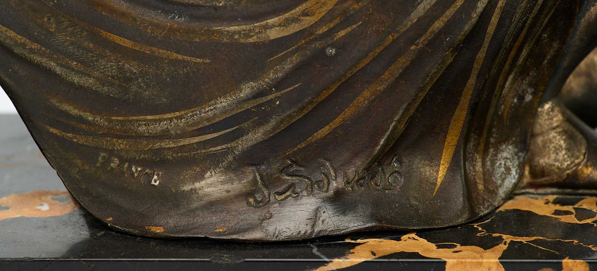 Представленная скульптурная композиция выполнена в стилистике ар-деко. Изображены два персонажа: маленький Амур – пухлый мальчик с птичьими крылышками, направляет лук на закрывающуюся рукой и подолом платья прекрасную девушку. Композиция строгая, фронтальная, пропорции точно выверены; детально проработанные образы свидетельствуют о профессионализме скульптора. Классические образы в современной трактовке были одной из характерных черт ар-деко, также как и сочетание подобных материалов: шпиатра и мраморного основания. На основании фигуры девушки присутствуют марки: «FRANCE» - страна-производитель, и авторское клеймо «J. SALVADO».