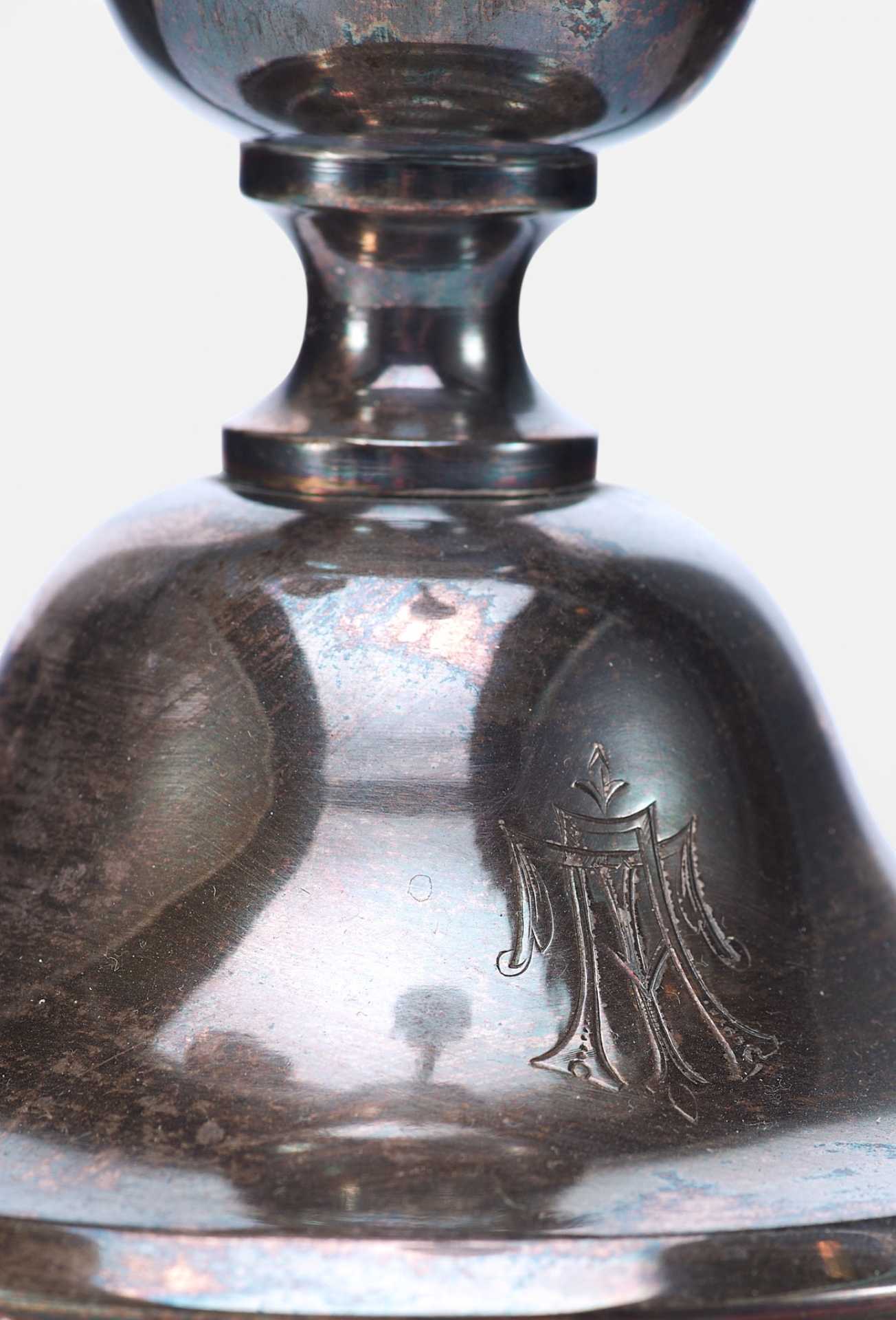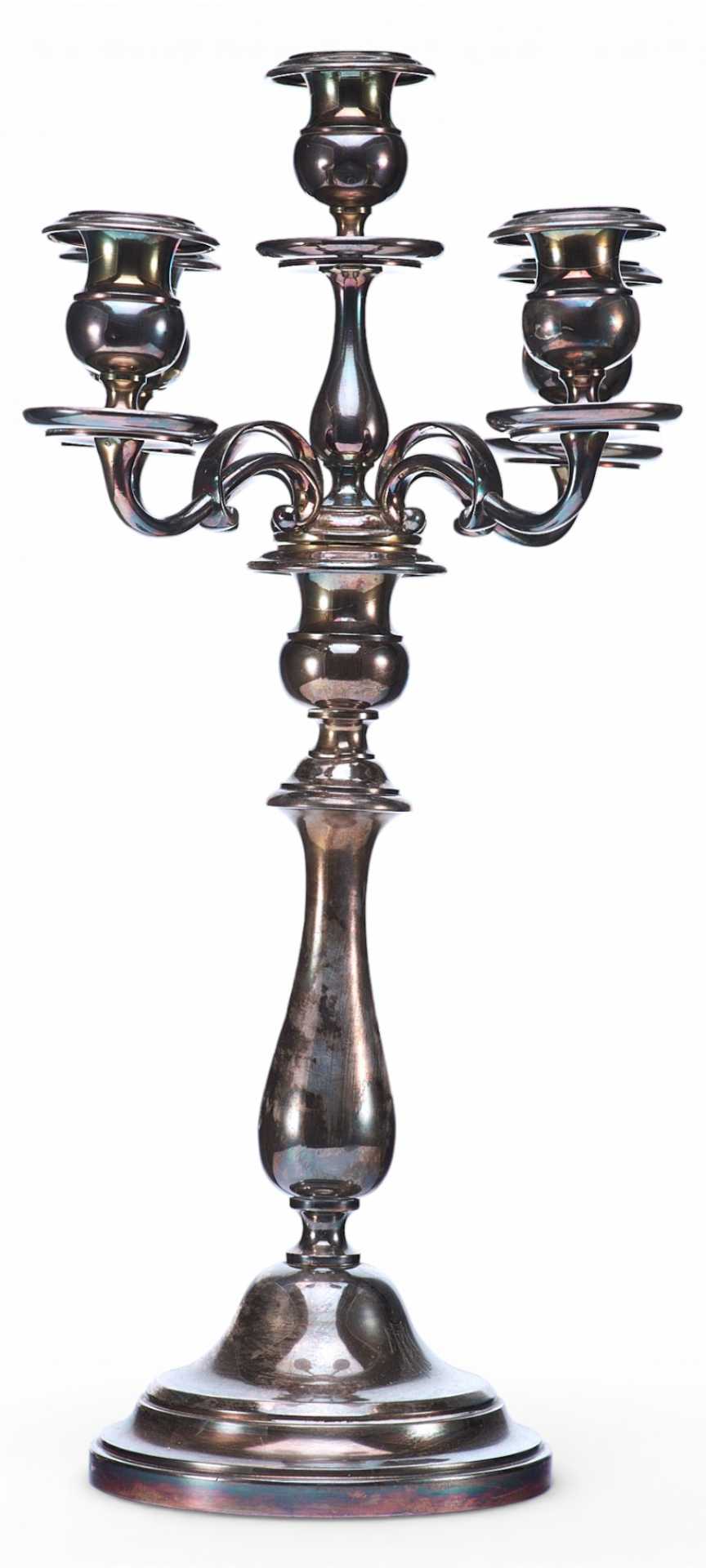 На основании имеется гравированная владельческая монограмма “АТ Канделябр изготовлен на Берндорфском металлическом заводе, специализировавшемся на производстве столовых приборов и предметов сервировки стола из мельхиора и серебра.