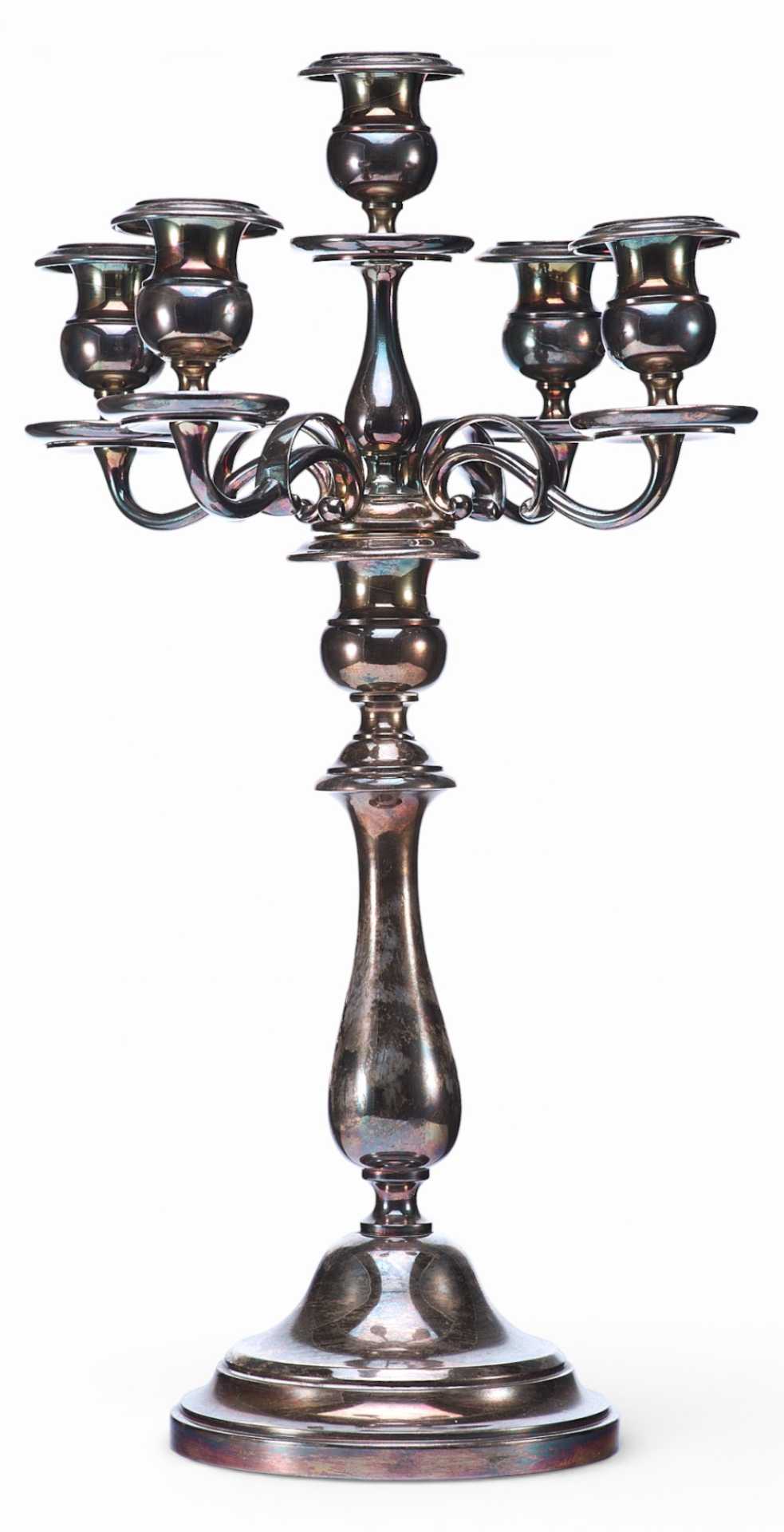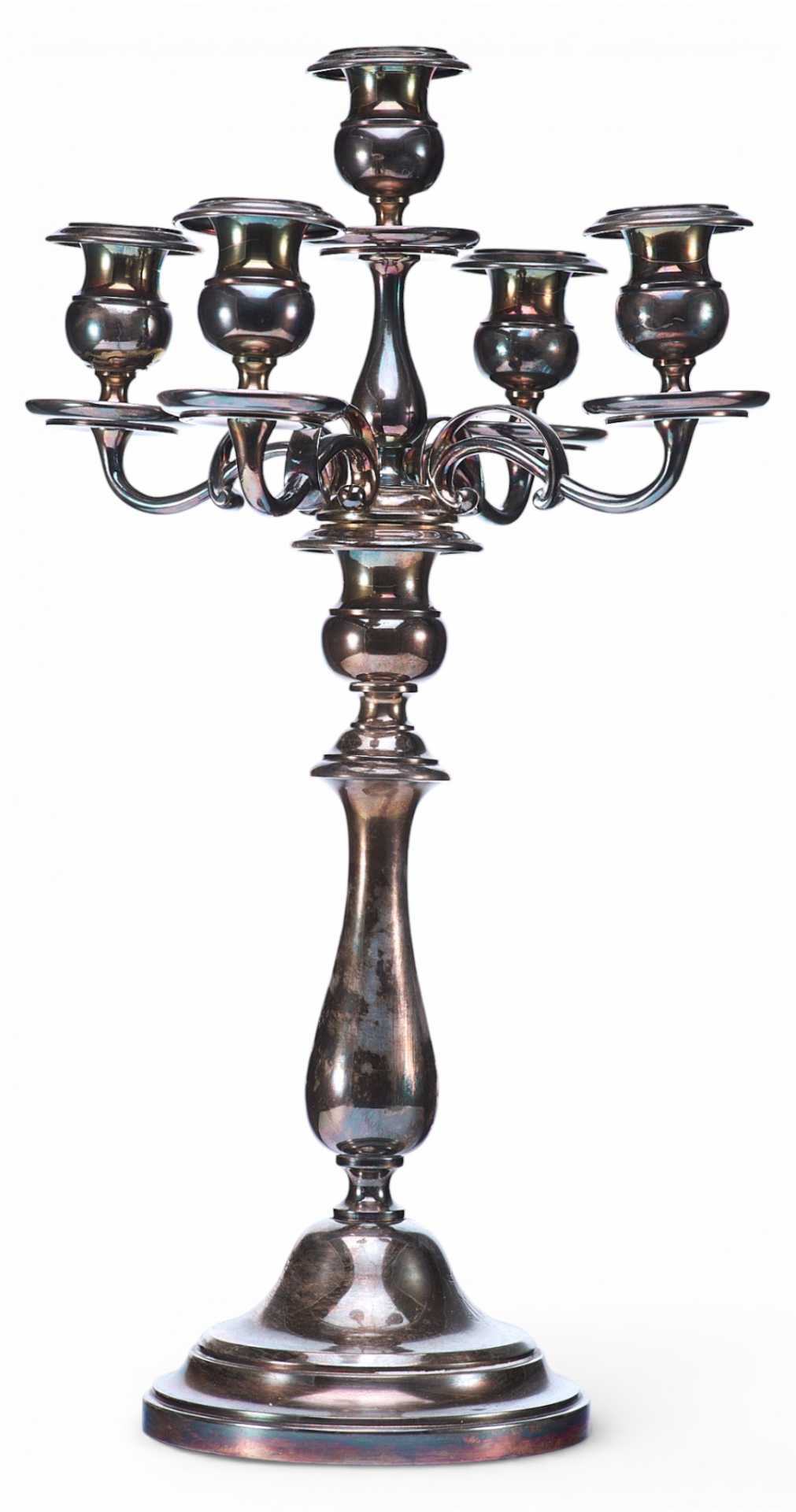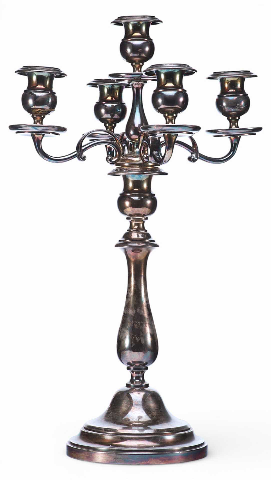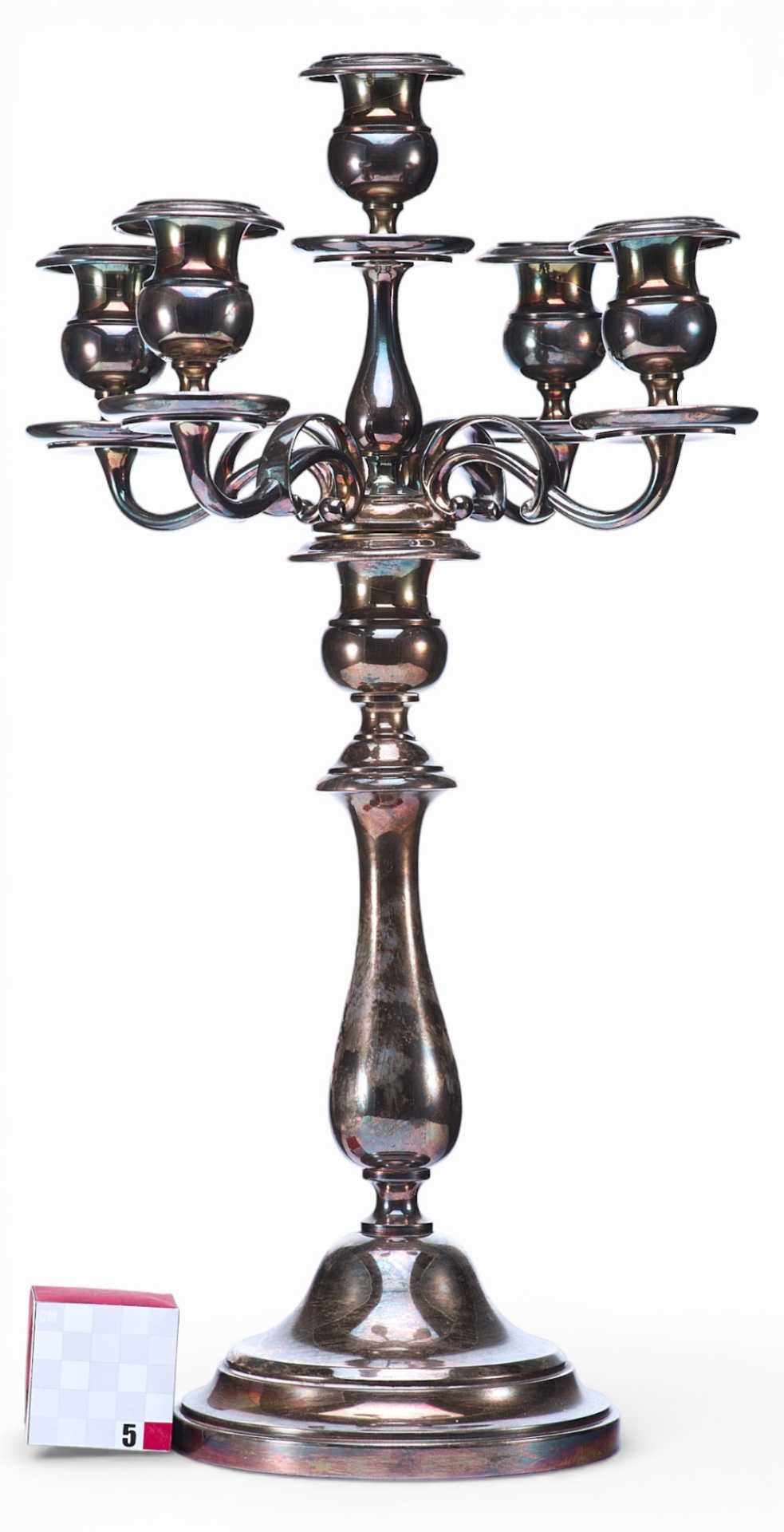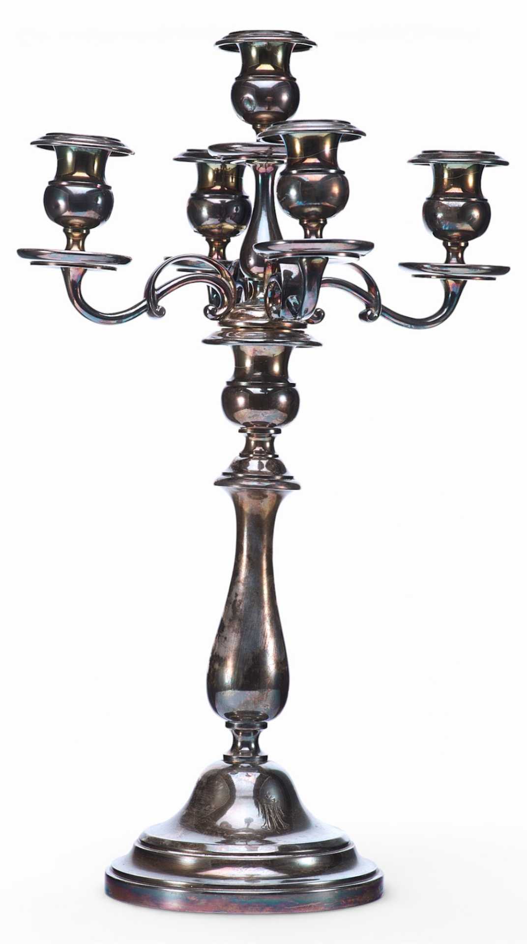 Представлен канделябр - настольный осветительный прибор в виде большого подсвечника на несколько свечей, с пятью свещниками, расходящимися в стороны от основного стержня. Канделябр составной и может выполнять функцию подсвечника.