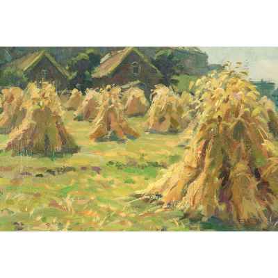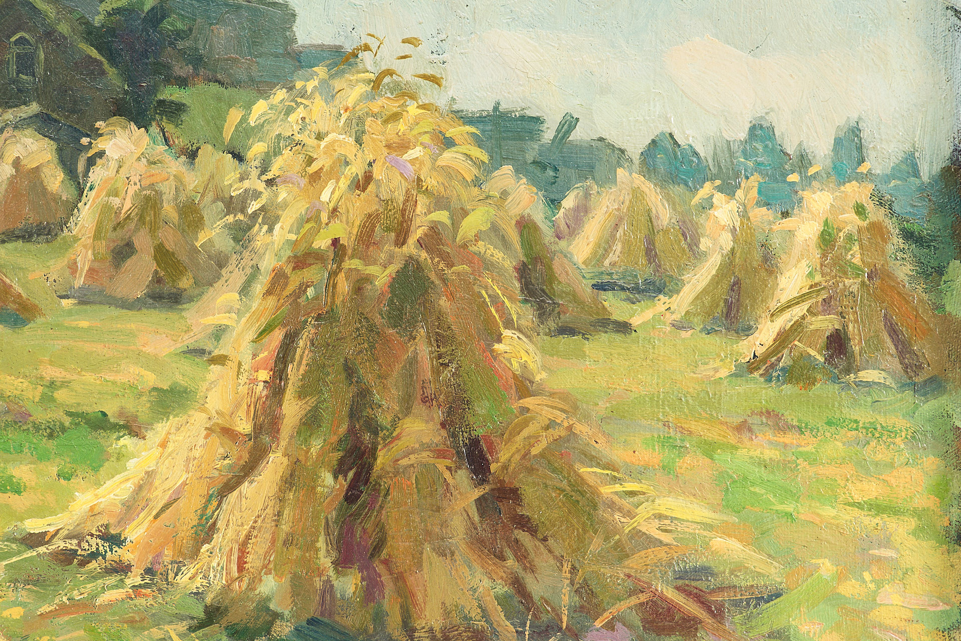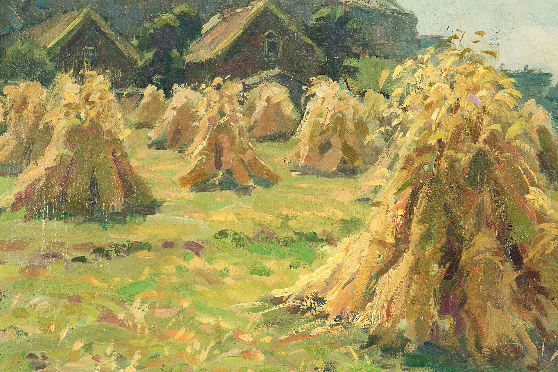 На картине изображён сельский пейзаж — просторное поле, усыпанное снопами, с домами и возвышающейся деревенской церковью на заднем плане. Пасторальная сцена передаёт атмосферу тишины и труда сельской местности. Композиция выстроена горизонтально, с акцентом на ритмичное расположение снопов и мягкое освещение.