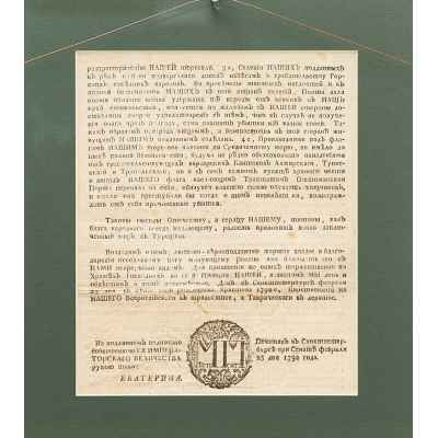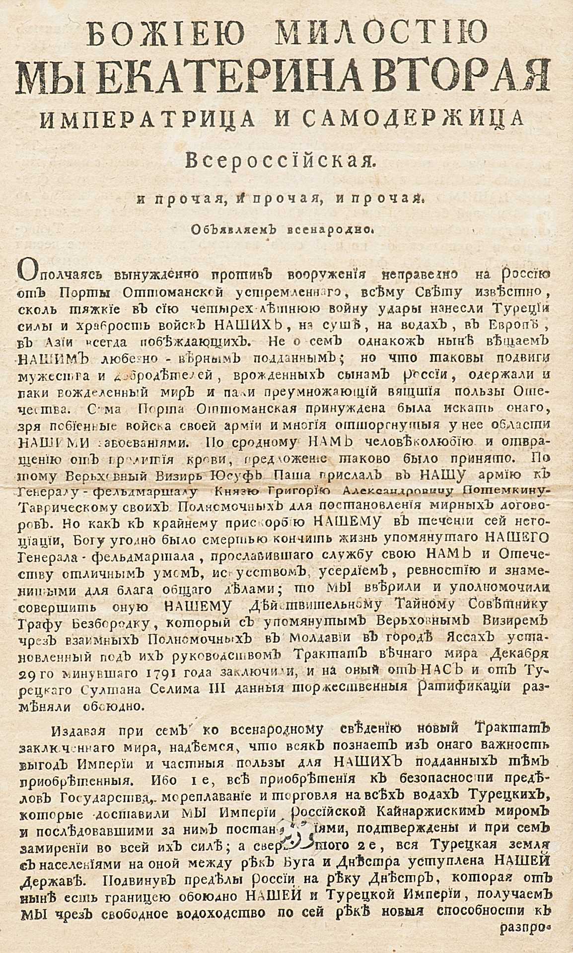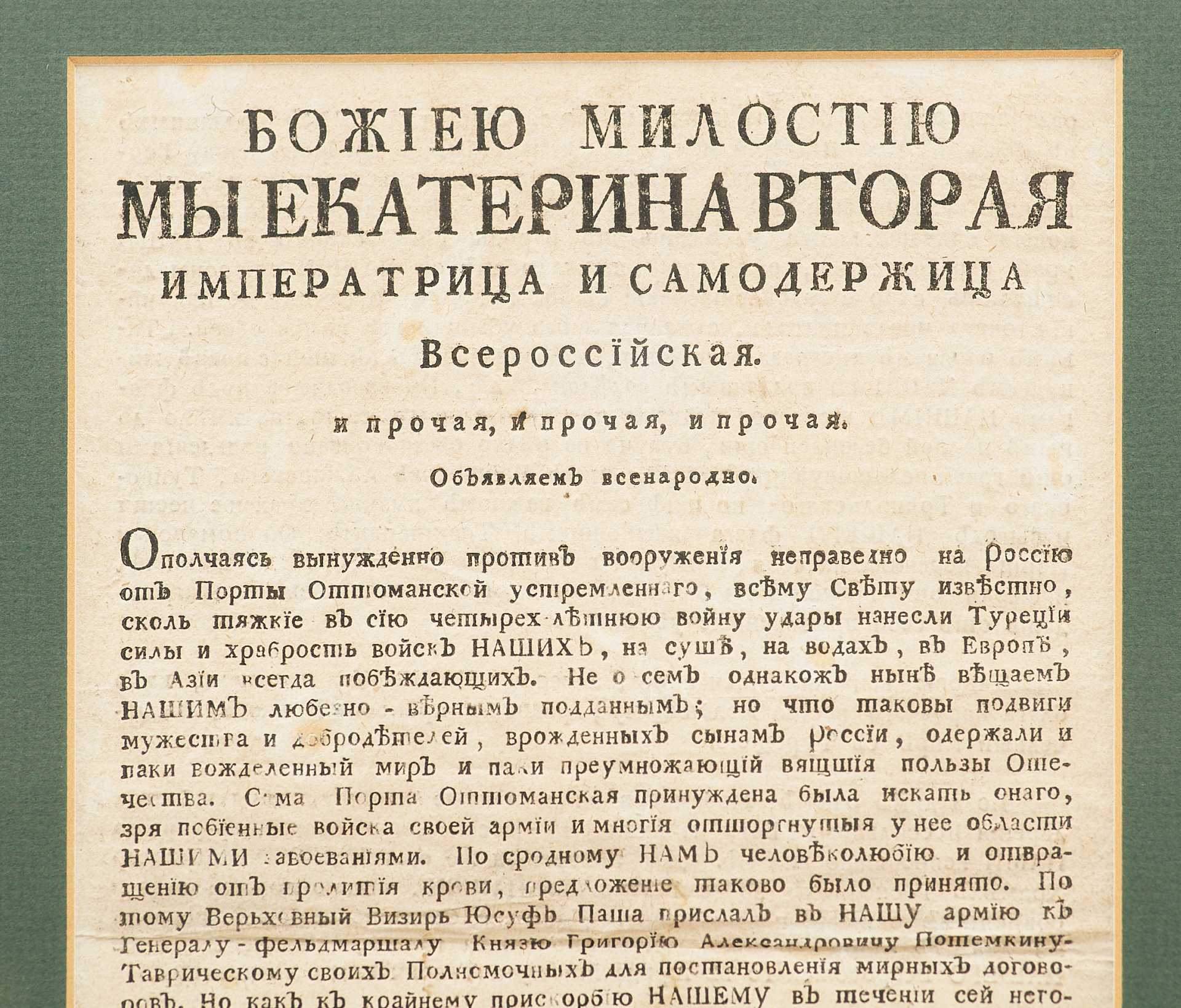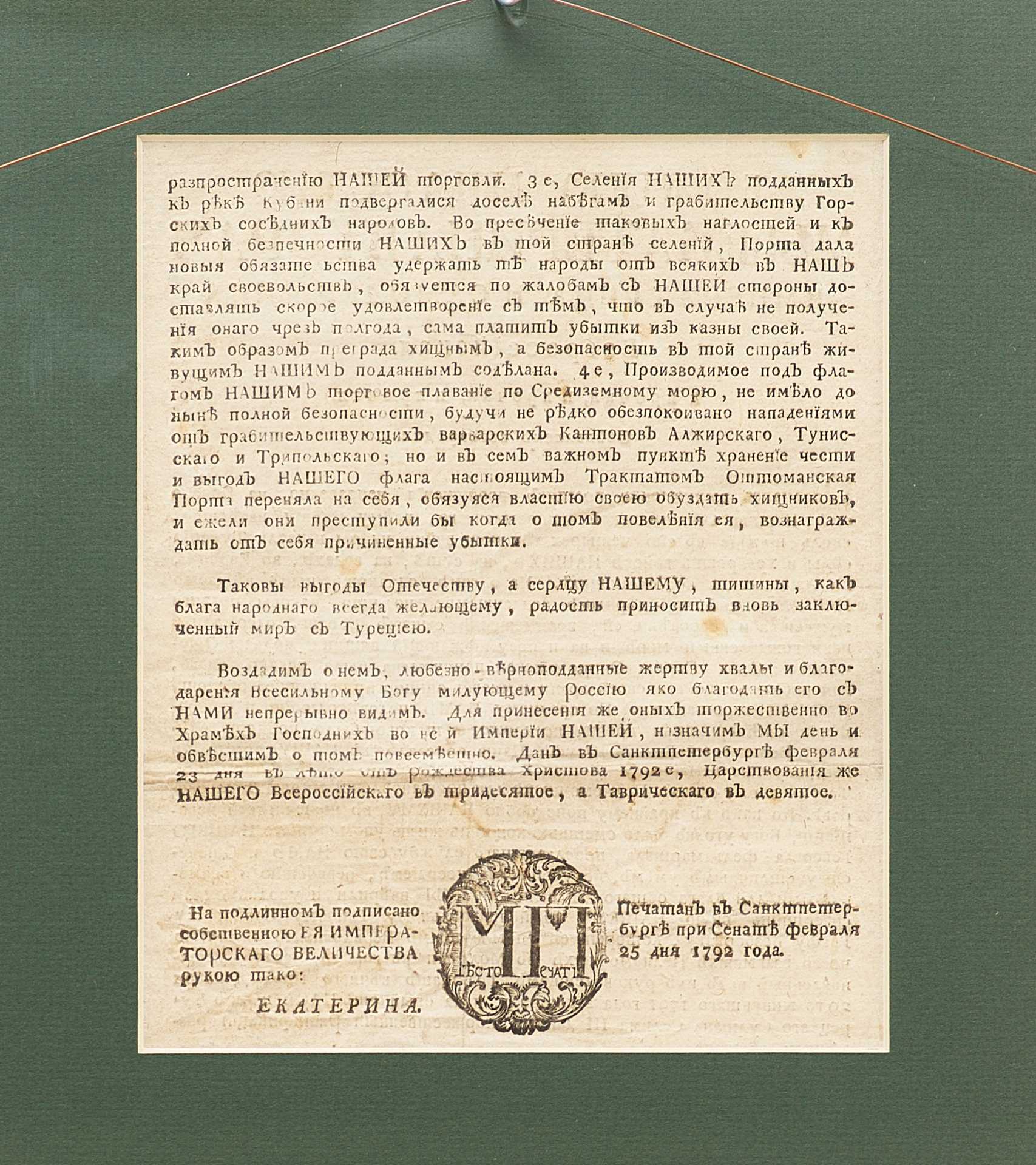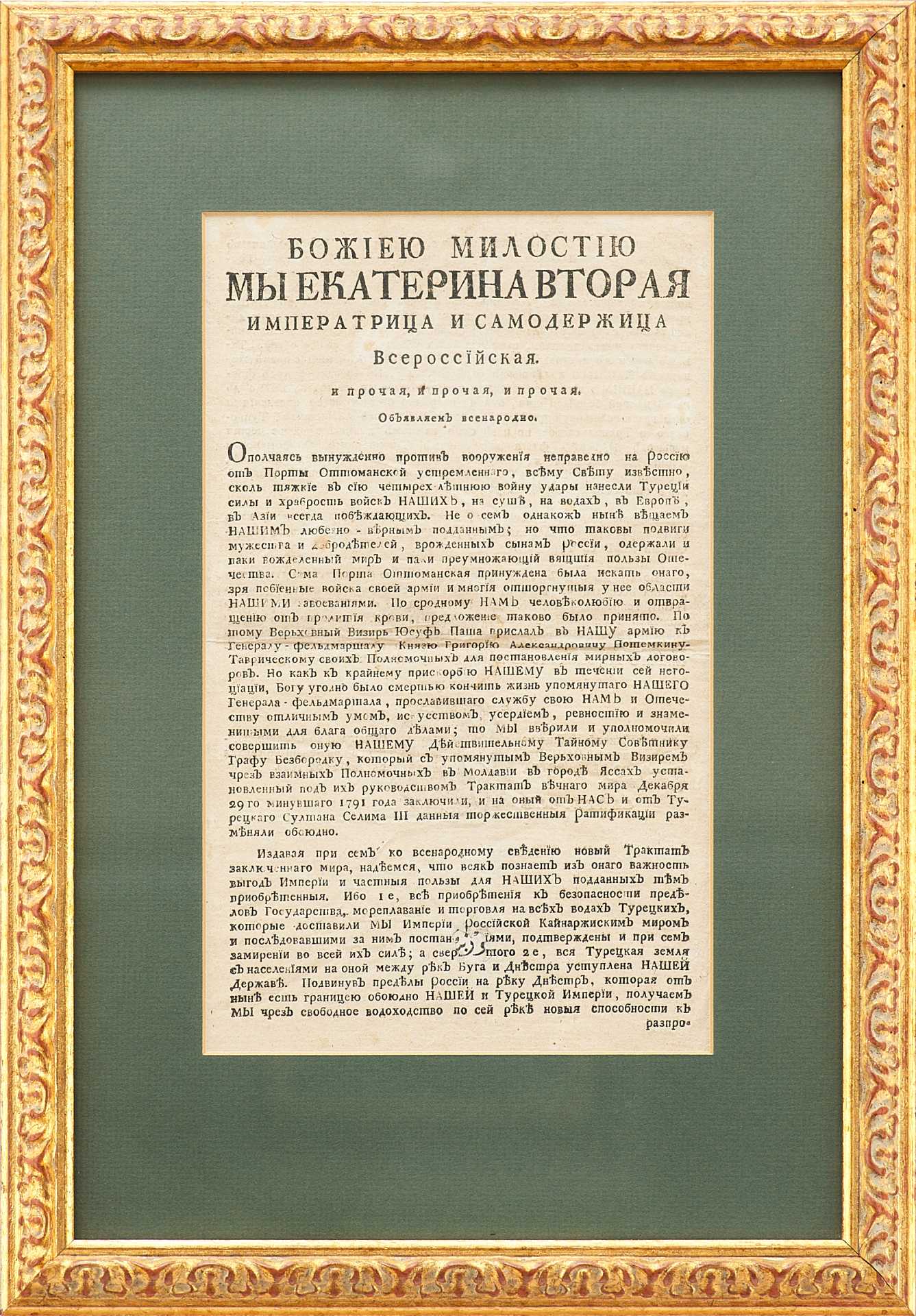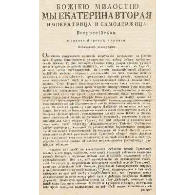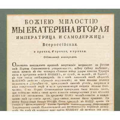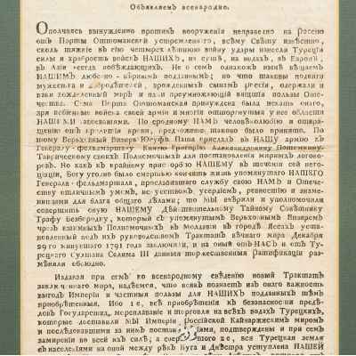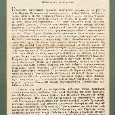Текст повествует о завершении русско-турецкой войны (предположительно 1768–1774 годов) и заключении Кючук-Кайнарджийского мирного договора — важнейшего события в истории Российской империи, закрепившего её влияние в Причерноморье. В документе подчеркиваются мужество русских солдат, справедливость ведённой войны и благополучный исход, достигнутый благодаря милости Божьей и силе российского оружия. Отдельно акцентируется значение новых территориальных приобретений для безопасности государства и свободного судоходства.