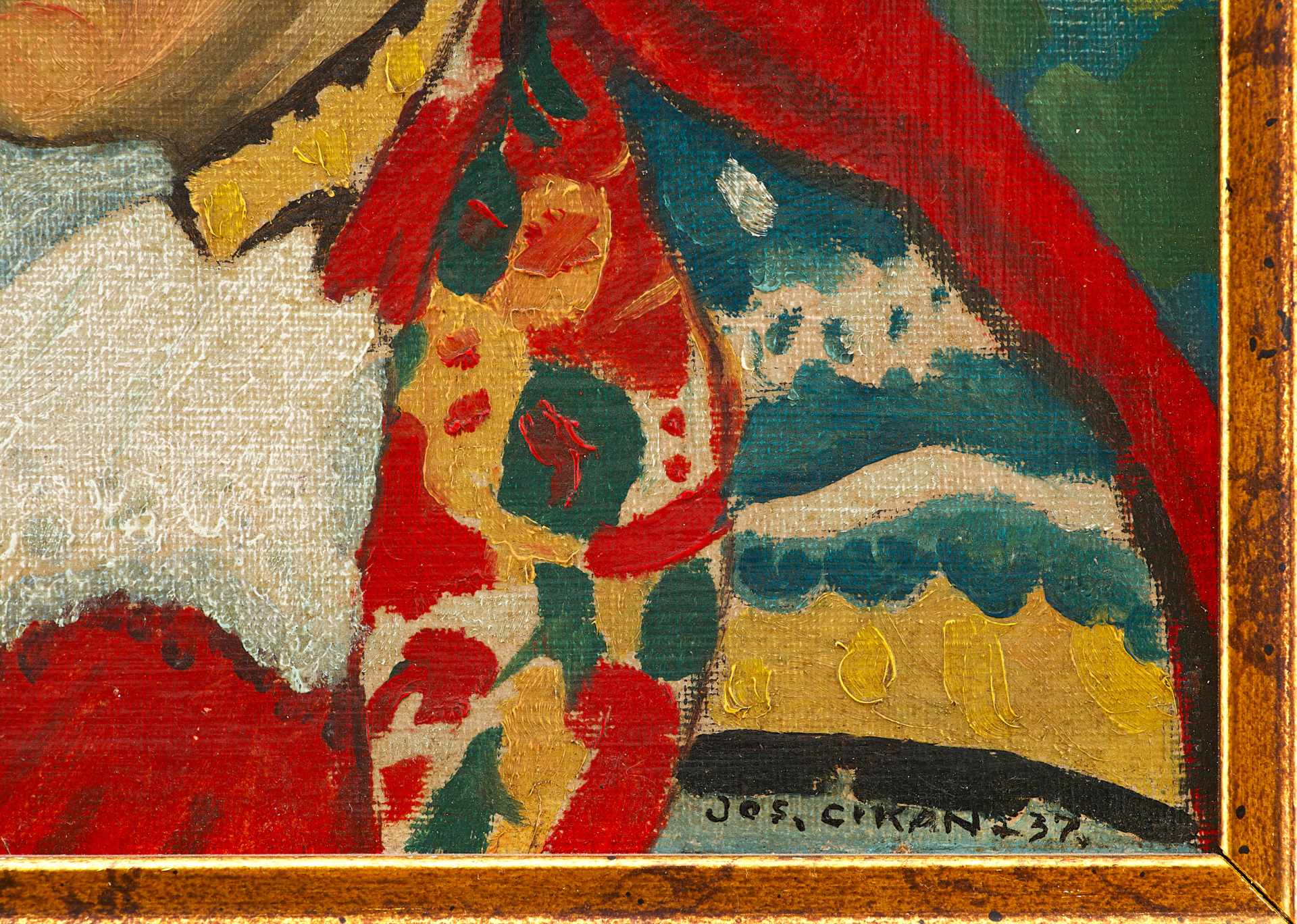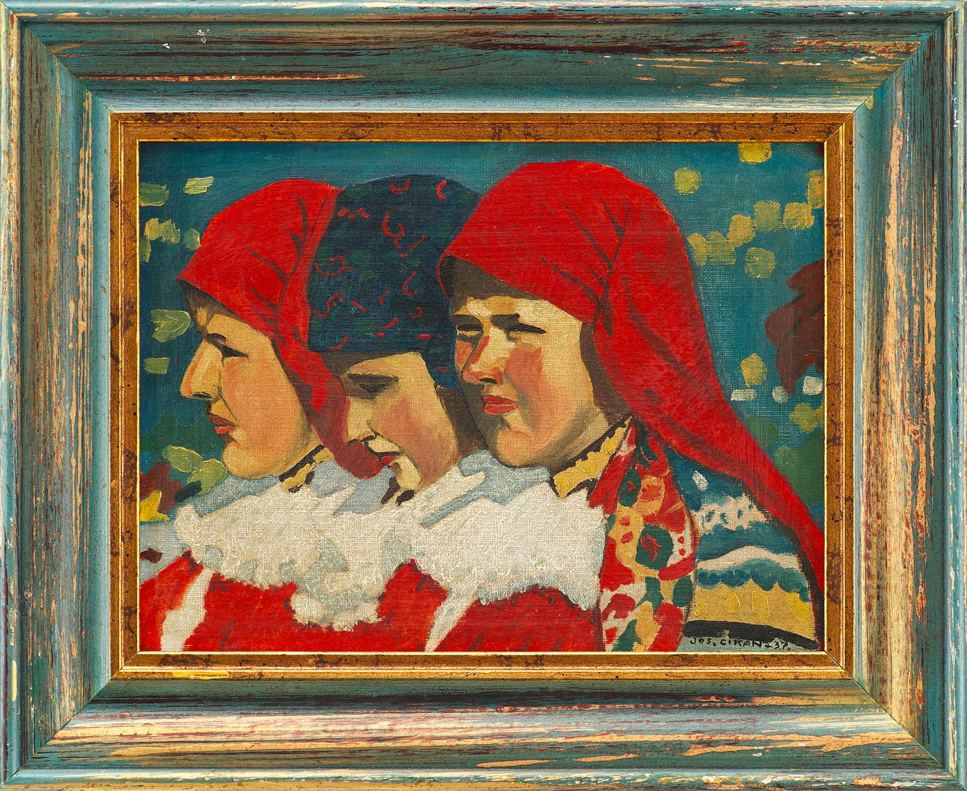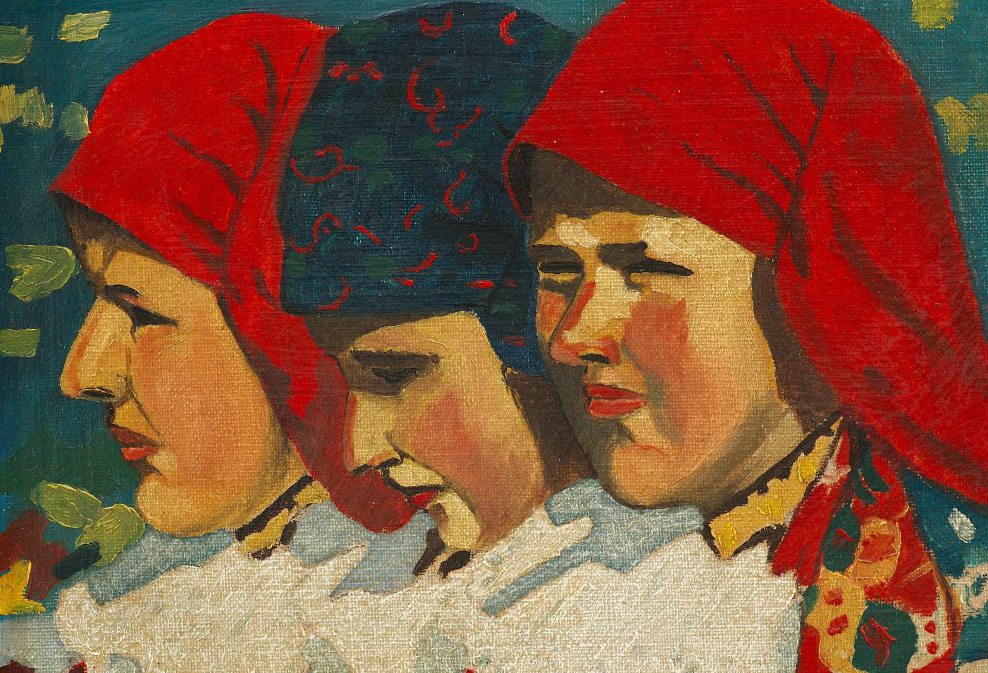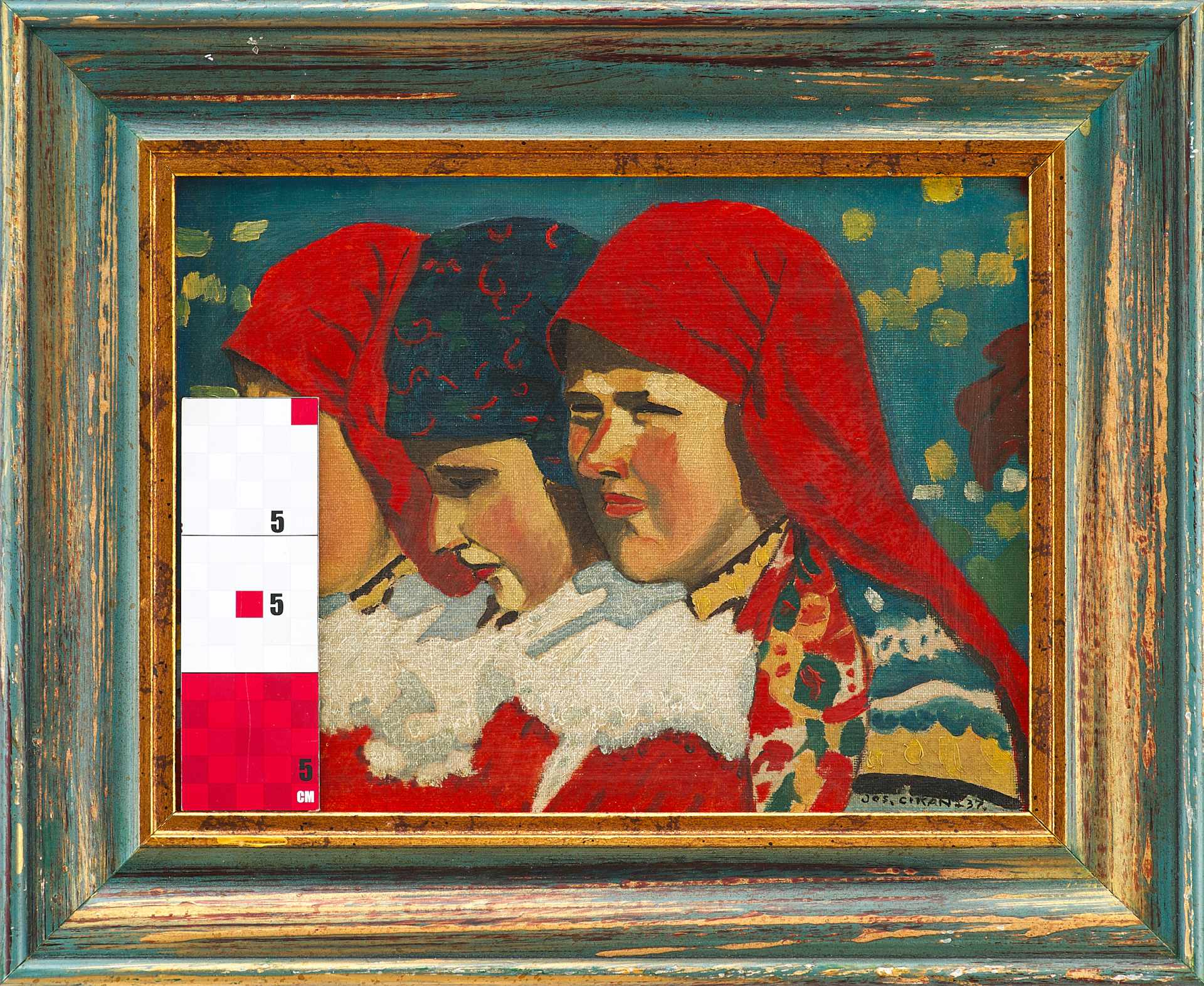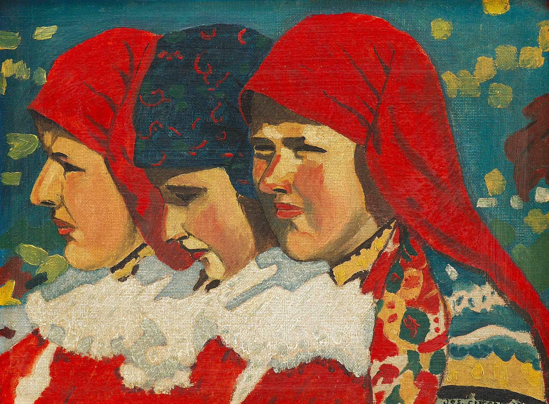 На картине изображены три девушки, освещенные ярким солнцем. На них национальные костюмы одной из областей Чехословакии.