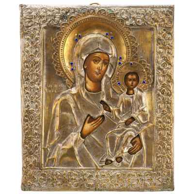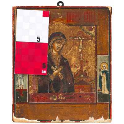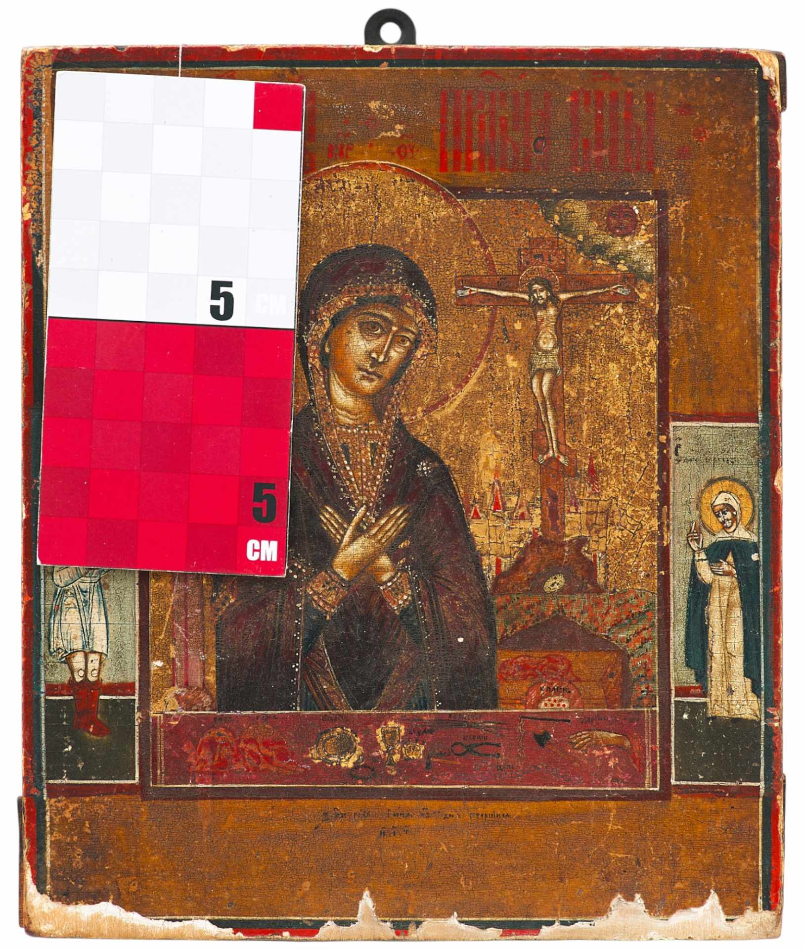 На боковых полях иконы изображены избранные святые Артемий и Ирина - возможно, покровители членов семьи заказчика.