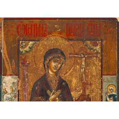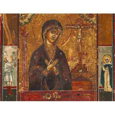 На иконе "Плач при кресте” Богоматерь изображена у креста с Распятием. Руки ее скрещены на груди. Перед Богородицей находится стол с расположенными на нём Орудиями Страстей, за ее спиной слева возвышается колонна с петухом, справа - пустая гробница.