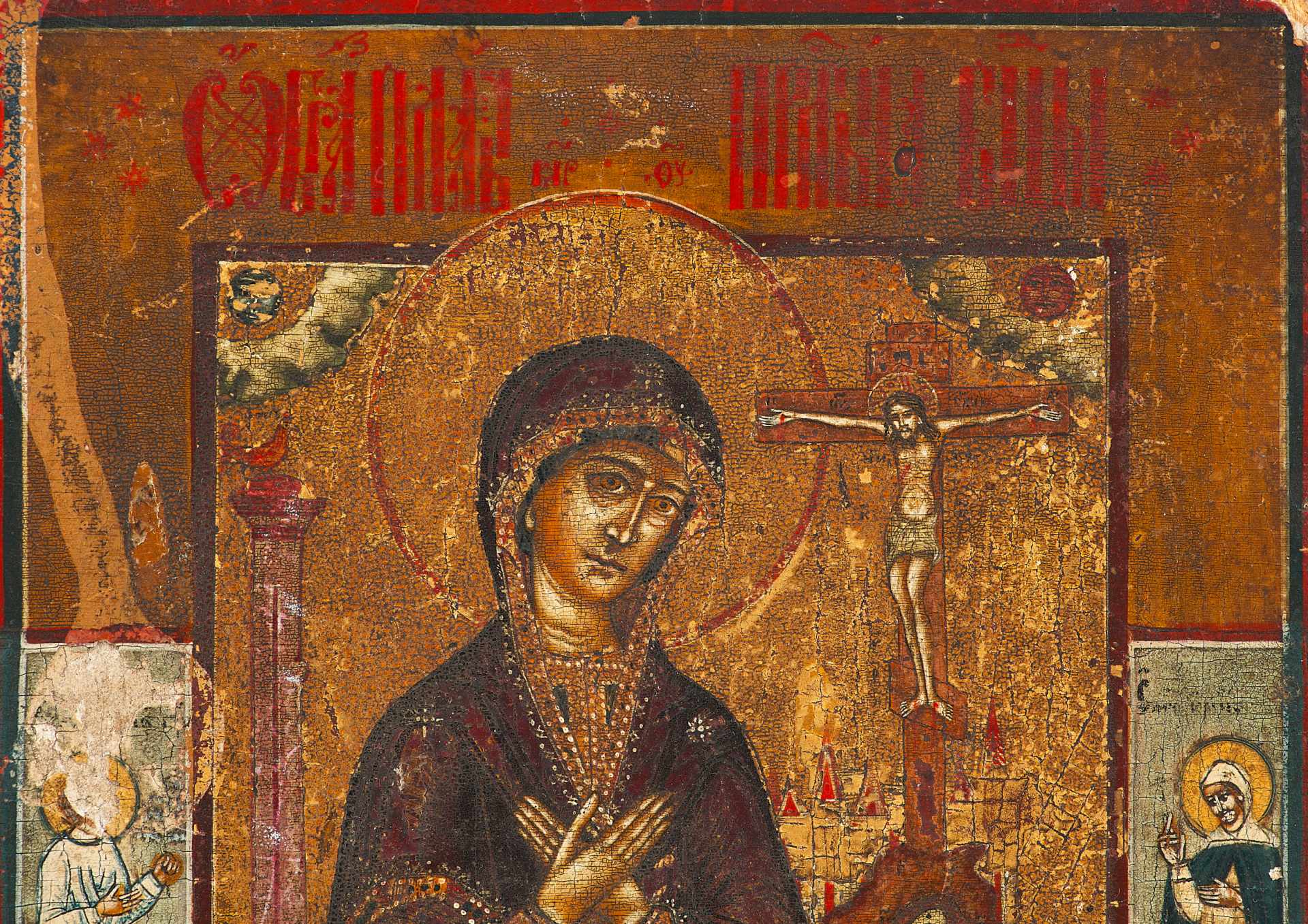 Появление этой иконографии относится к первой половине XVIII века и, так же как апокриф “Плач Богородицы”, имеет основанием текст Евангелия от Иоанна, где говорится о стоянии Богородицы у креста (XIX, 25-27). В XIX веке появляются месточтимые образы “Богоматери у креста”. Известны "Богоматерь Страстная (Липецкая)” (находится в приделе Христорождественского собора города Липецка) и “Богоматерь Самарская (Новокайдакская)” (находилась в Самарском ПустынноНиколаевском монастыре недалеко от города Новомосковска).