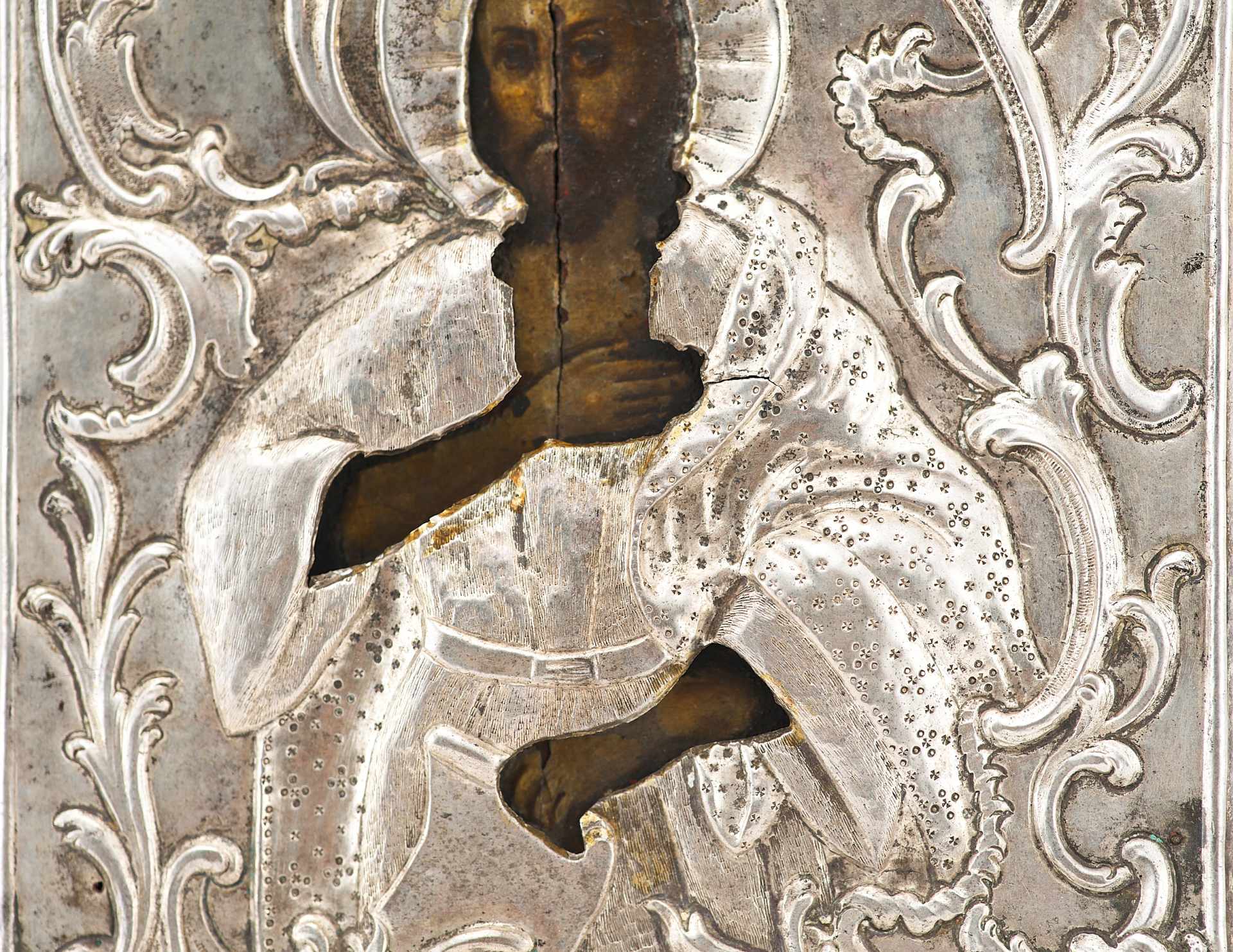 На иконе - святой одетый во власяницу и темный плащ-гиматий. Правая рука прижата к груди. В левой он держит развернутый свиток. Икона, в соответствии с древним обычаем украшать образа окладами, венцами, пришедшими на Русь из Византии, обложена серебряным окладом. На окладе орнамент из завитков, раковин и акантовой волюты.