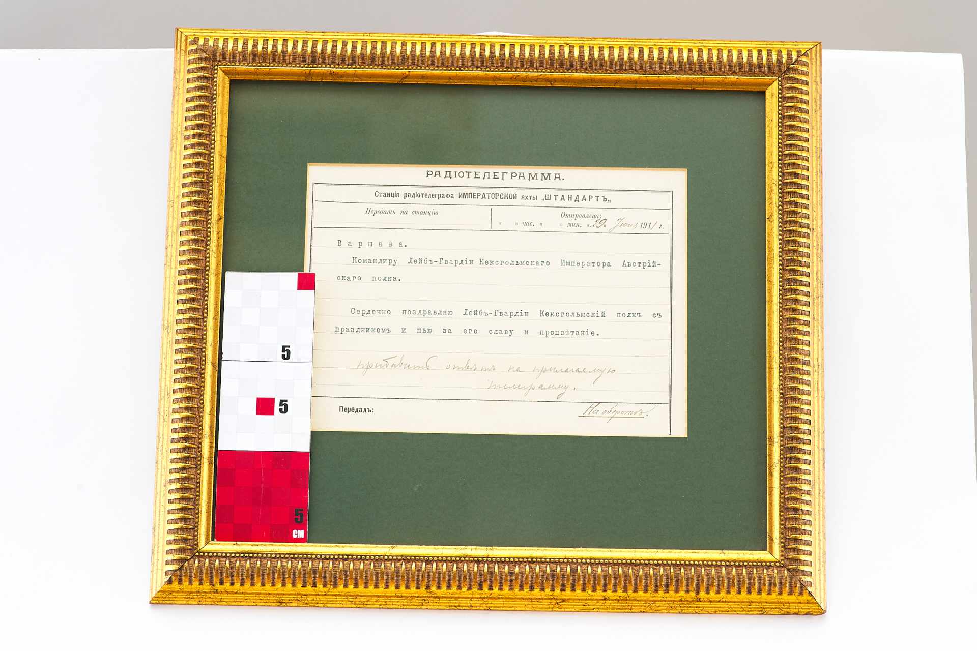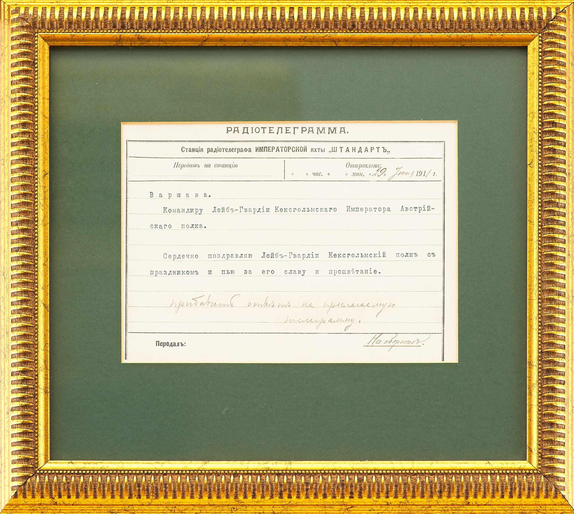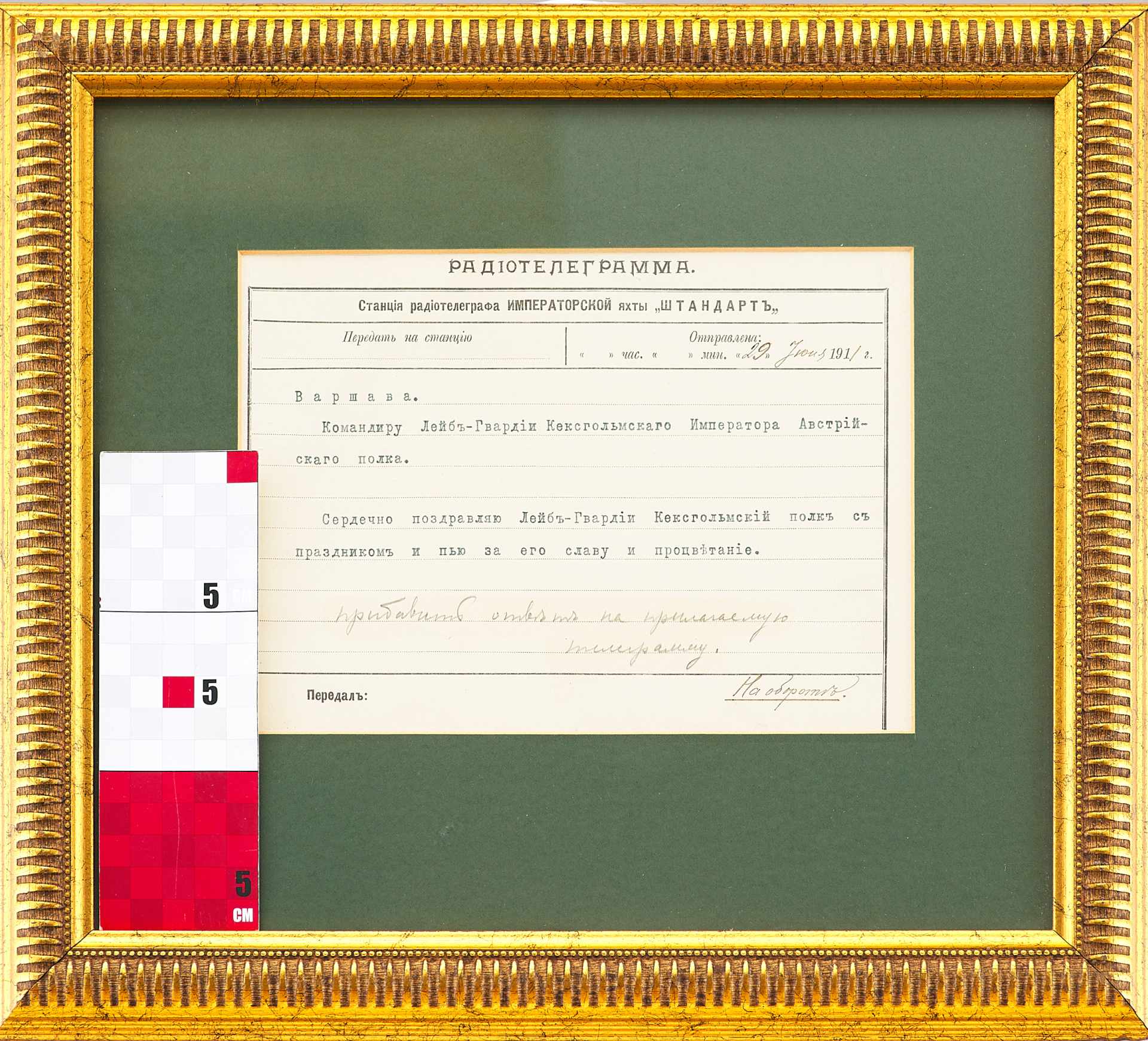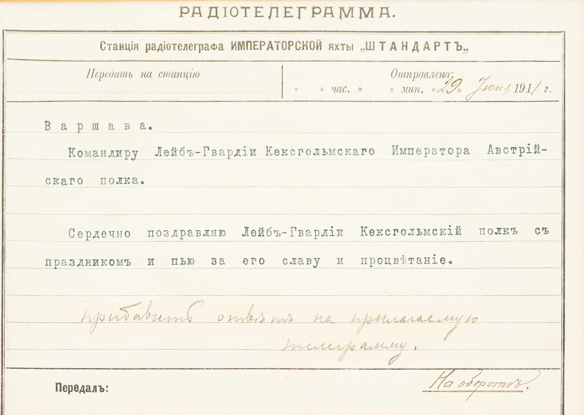 Радиограмма с императорской яхты “Штандарт” была отправлена 29 июня 1911 года в Варшаву: Варшава. Командиру Лейб-Гвардии Кексгольмского Императора Австрийского полка.