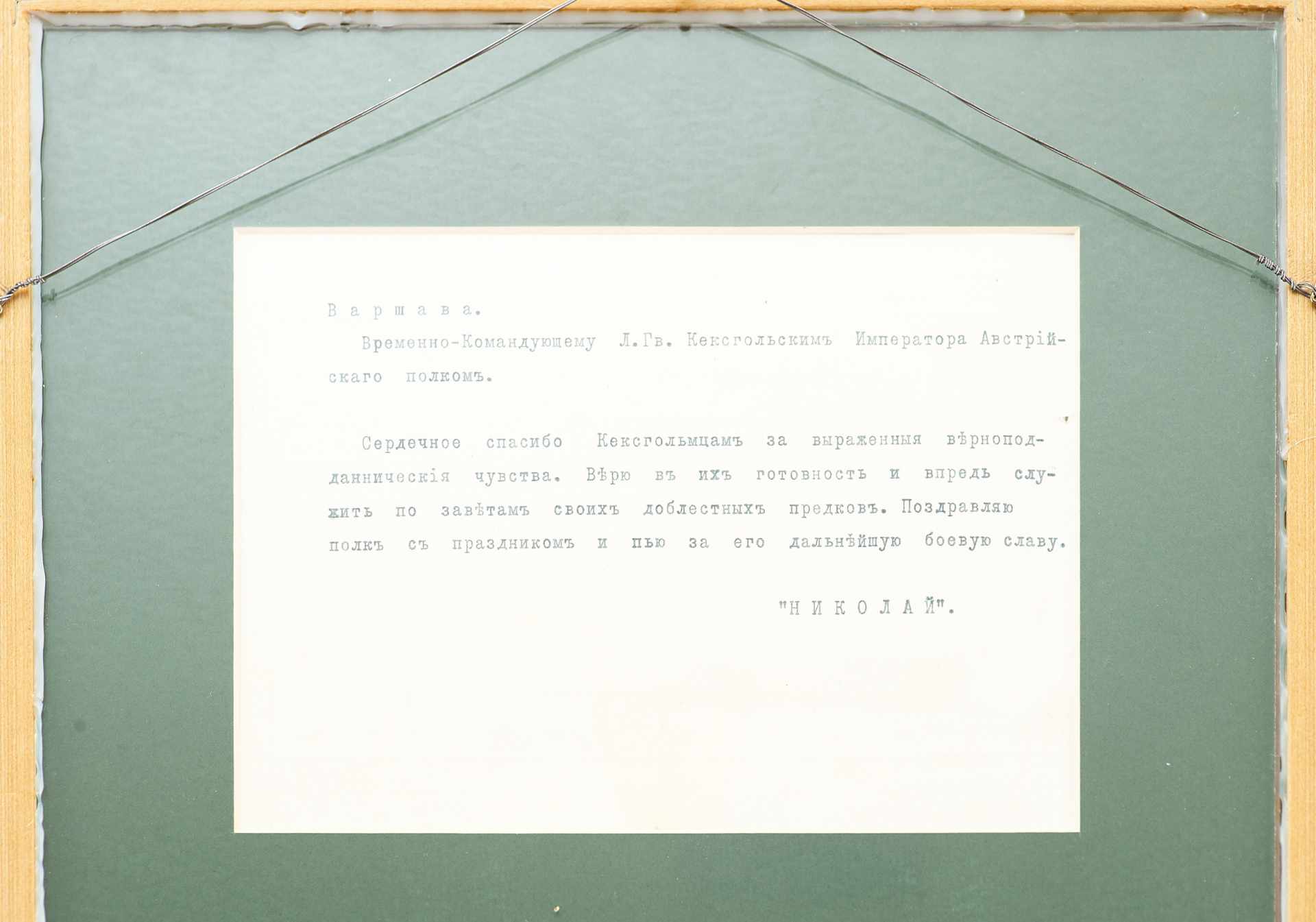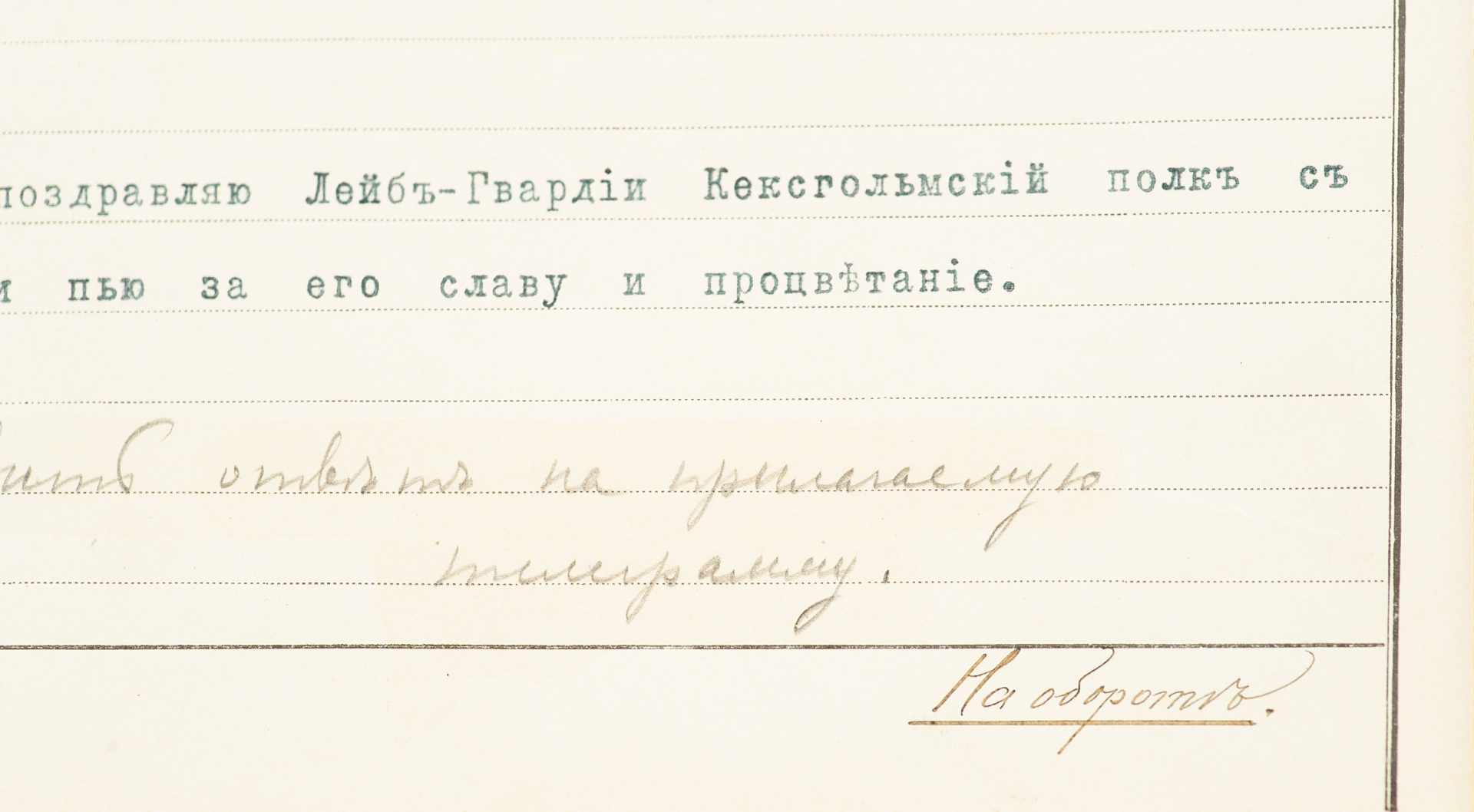 Сердечно поздравляю Лейб-Гвардии Кексгольмский полк с праздником и пью за его славу и процветание Внизу рукой Николая II написано следующее: "прибавить ответ на прилагаемую телеграмму”. Варшава.