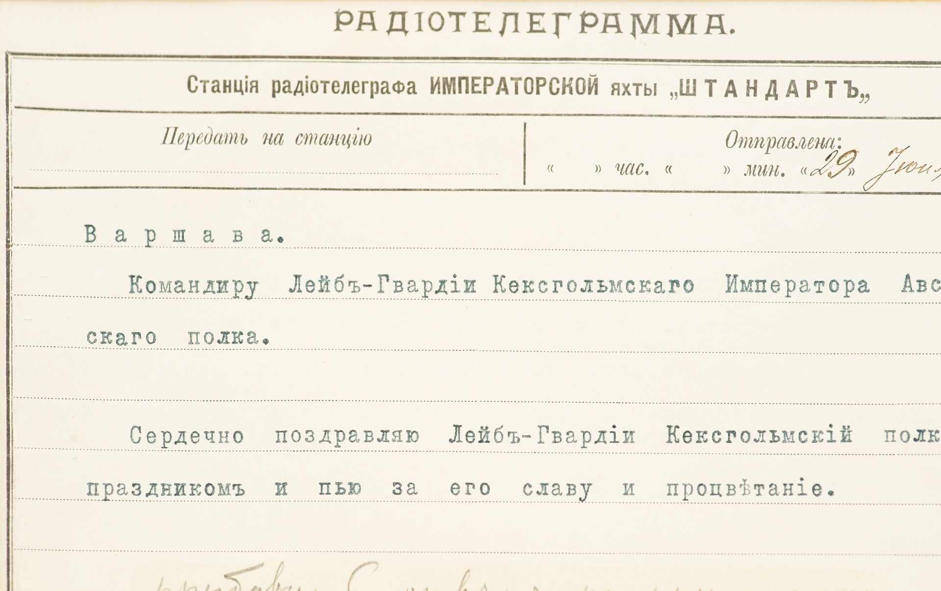 Радиограмма с поздравлением отправлена в связи с полковым праздником - 29 июня в место дислокации Вейсенбург, Варшава. Кексгольмский полк (Кексгольмский гренадерский императора Австрийского полк) - сформирован в 1710 г. под названием гренадерского князя Барятинского; полком императора Австрийского именуется с 1814 г. В 1831 г, включён в состав гвардейского корпуса. Боевые отличия: полковое знамя - георгиевское, за турецкую войну 1877 - 1878 гг.; 2 серебряные трубы за взятие Берлина (1760 г); знаки на шапки за отличие в сражении при Арсис-сюр-Об (1814 г). Приказом 6 декабря 1894 г. полку дарованы права и преимущества старой гвардии.