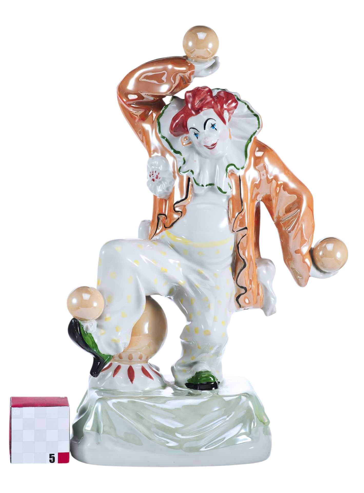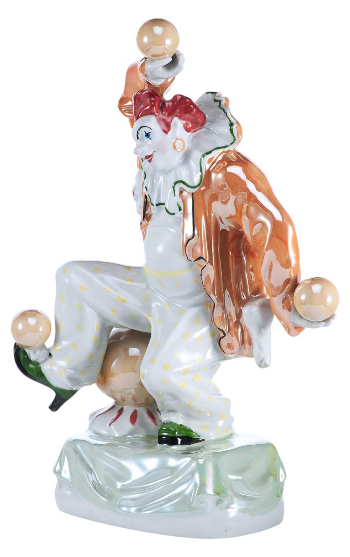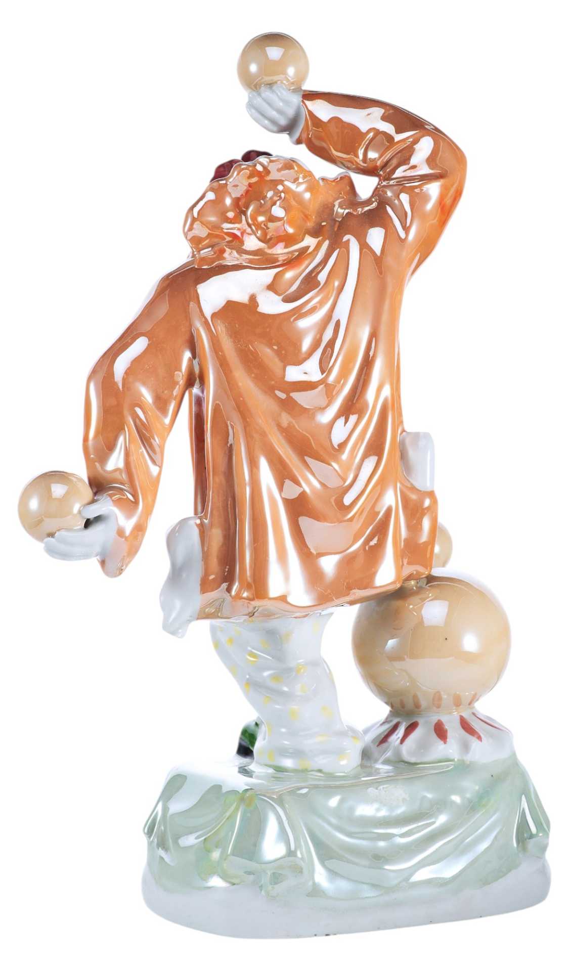 На дне статуэтки присутствует марка (красная надглазурная) в виде лосиной головы, ставилась на Дмитровском фарфоровом заводе с 1960-х гг. Также на основании скульптуры есть клеймо мастера, вдавленное в массу: «Орлов». Скульптура представляет собой клоуна, жонглирующего тремя шарами. Композиция отличается яркостью красок, динамичностью,