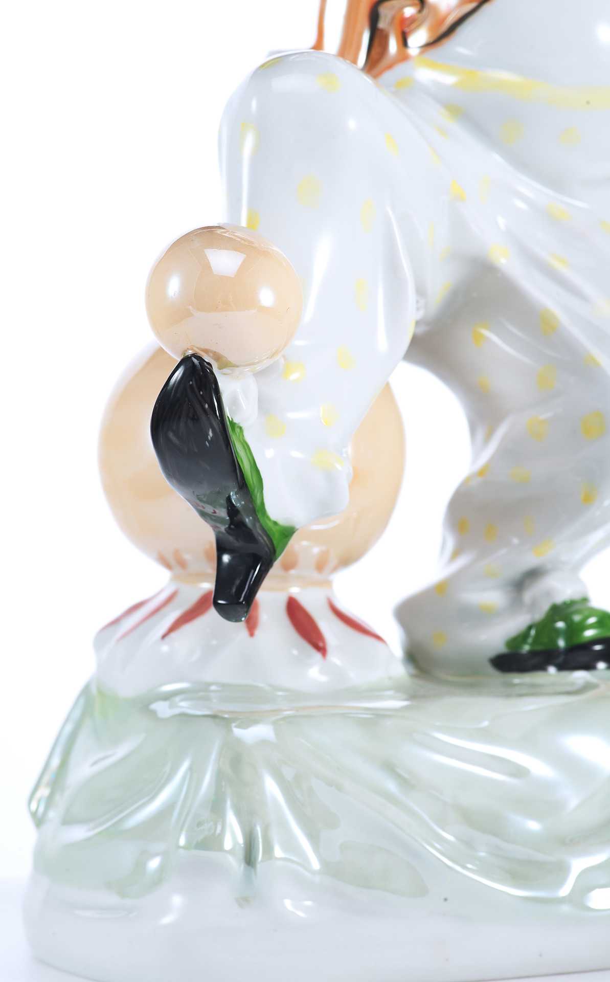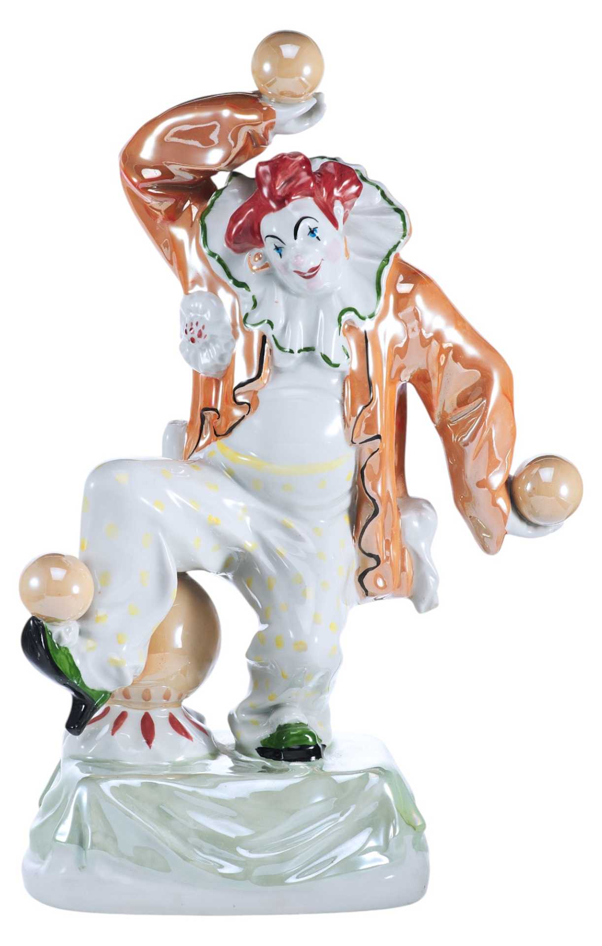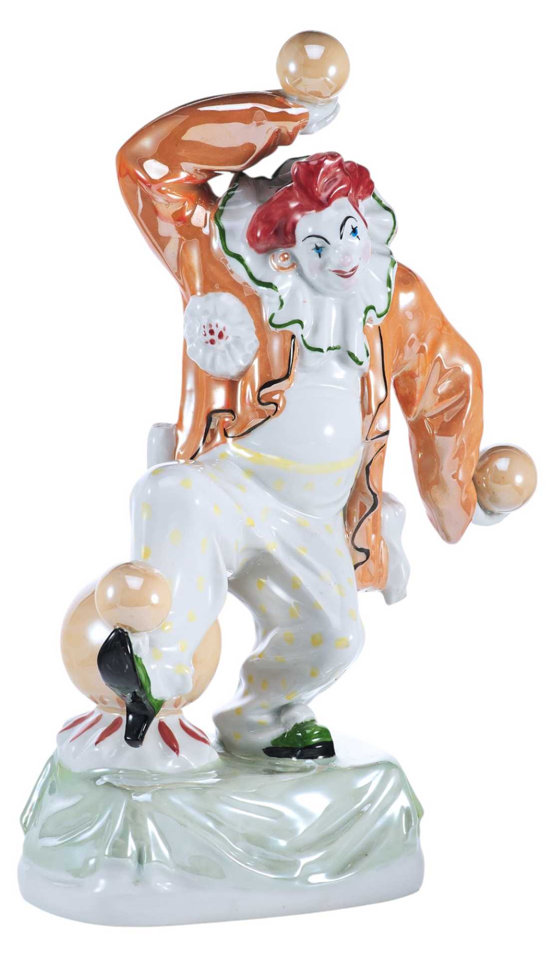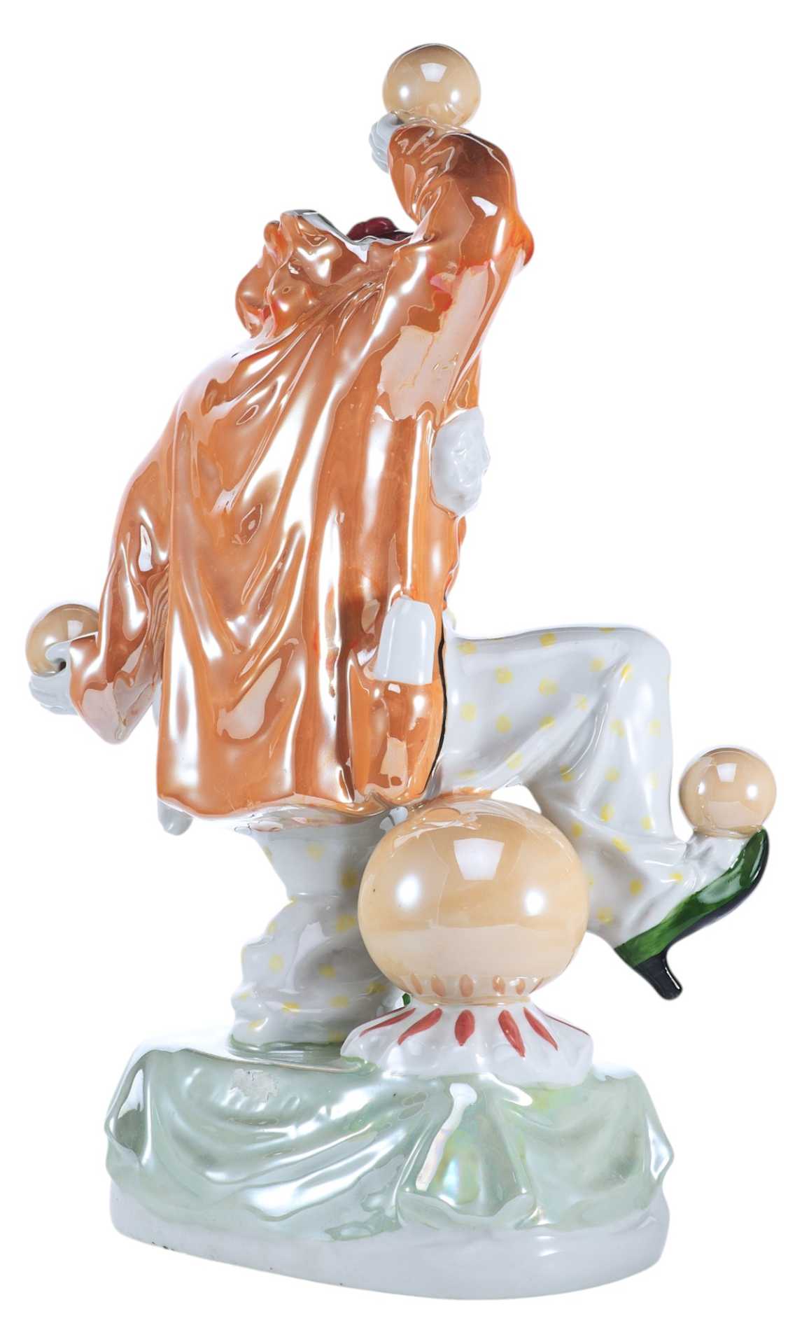 На дне статуэтки присутствует марка (красная надглазурная) в виде лосиной головы, ставилась на Дмитровском фарфоровом заводе с 1960-х гг. Также на основании скульптуры есть клеймо мастера, вдавленное в массу: «Орлов». Скульптура представляет собой клоуна, жонглирующего тремя шарами. Композиция отличается яркостью красок, динамичностью,