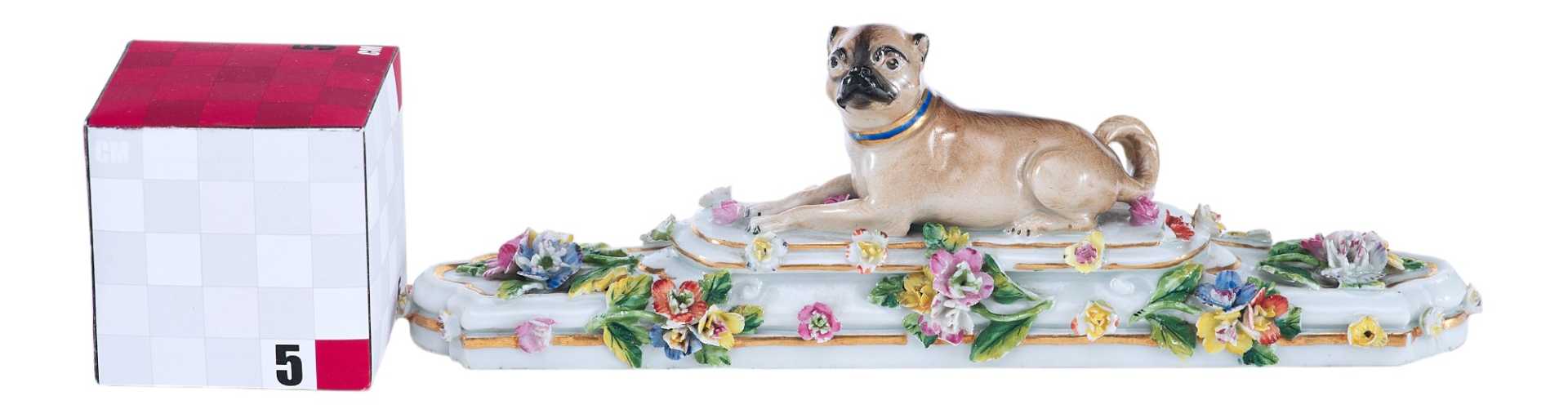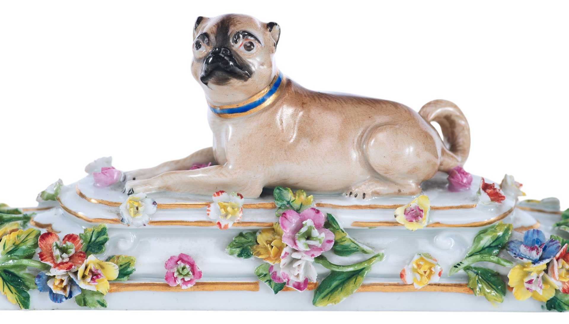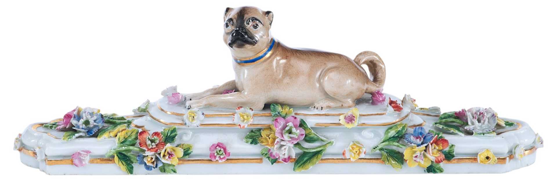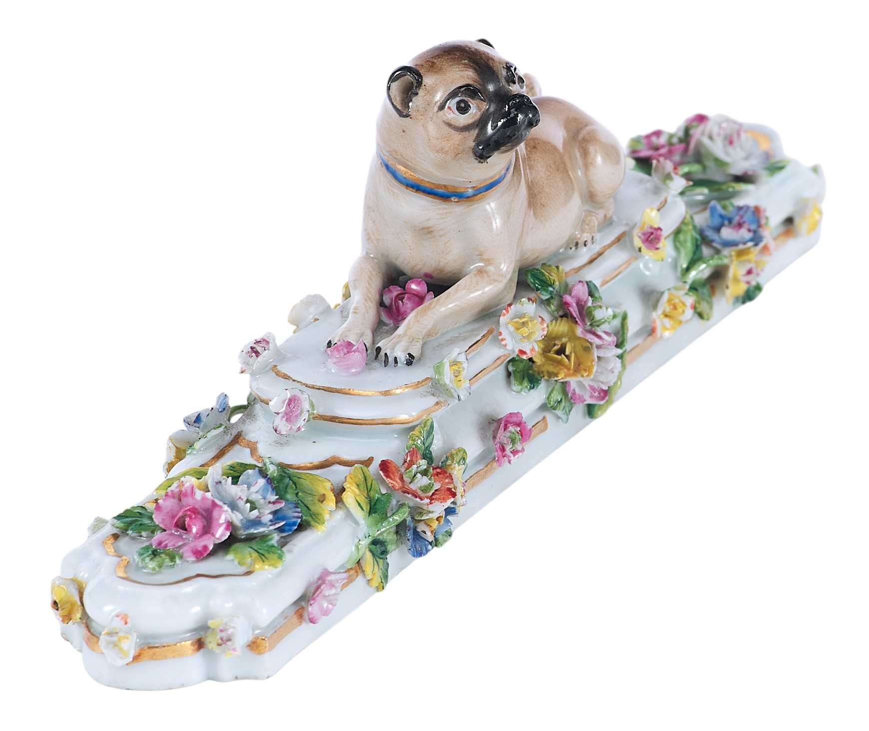 Представлена фарфоровая скульптура в виде мопса лежащего на постаменте, украшенном цветами В целом художественное